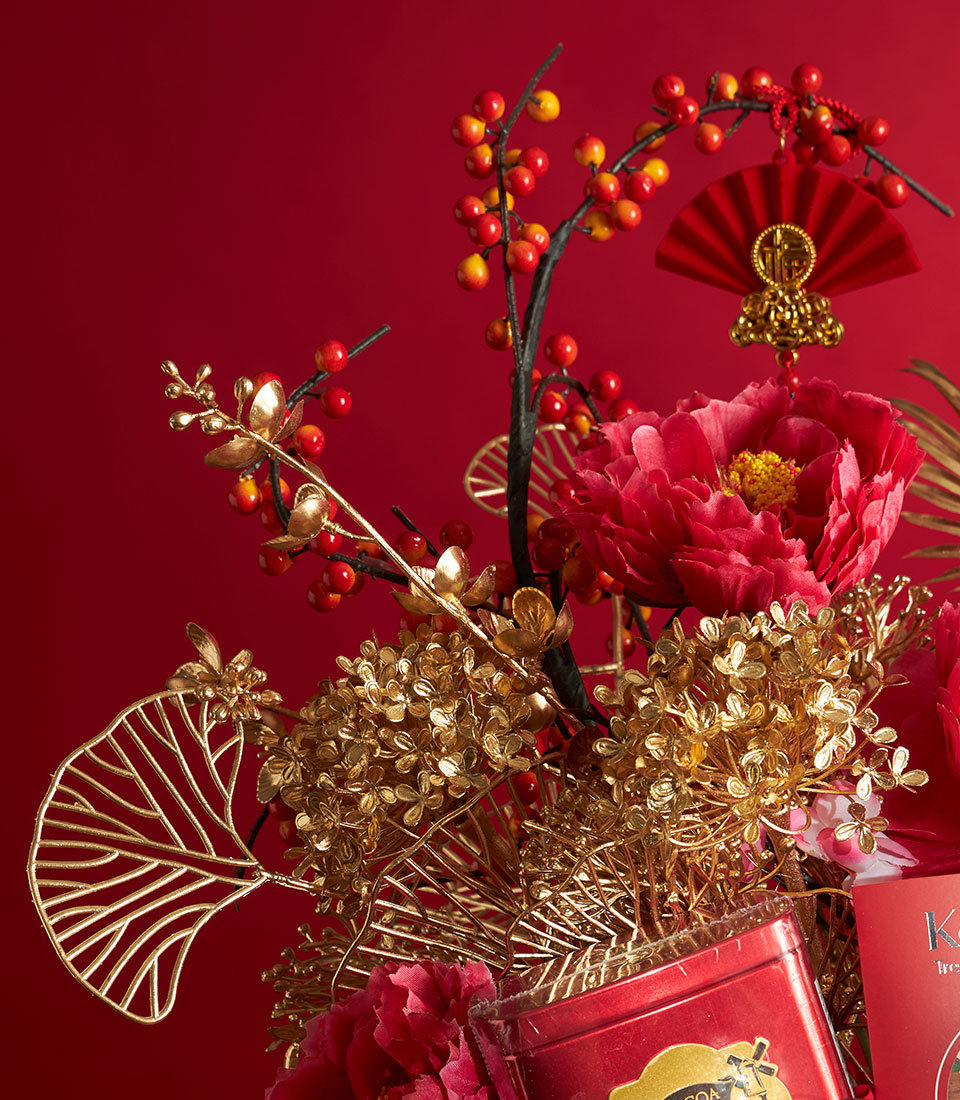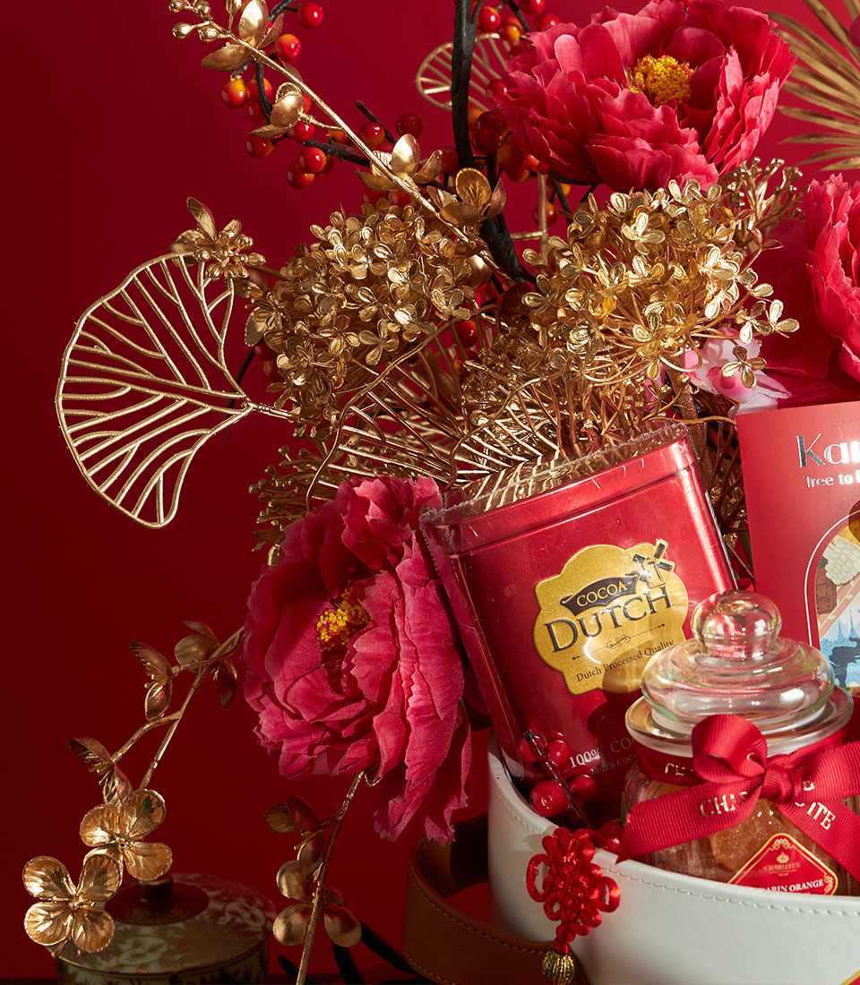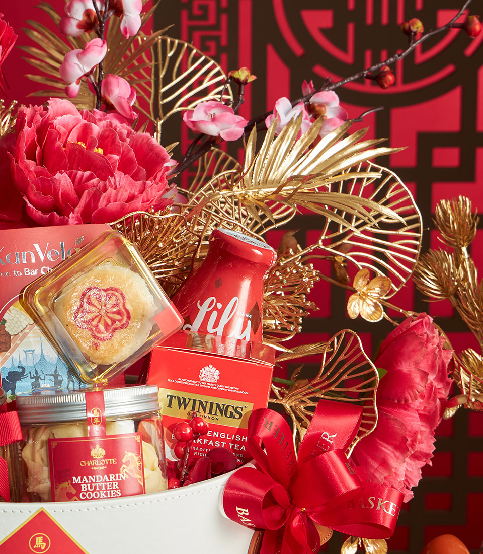 A premium Chinese New Year gourmet gift basket featuring a curated selection of festive treats, tea, sweets, and bakery delights, elegantly presented in a red and gold basket with traditional Chinese decorative accents. Ideal for gifting prosperity and good wishes during Lunar New Year.