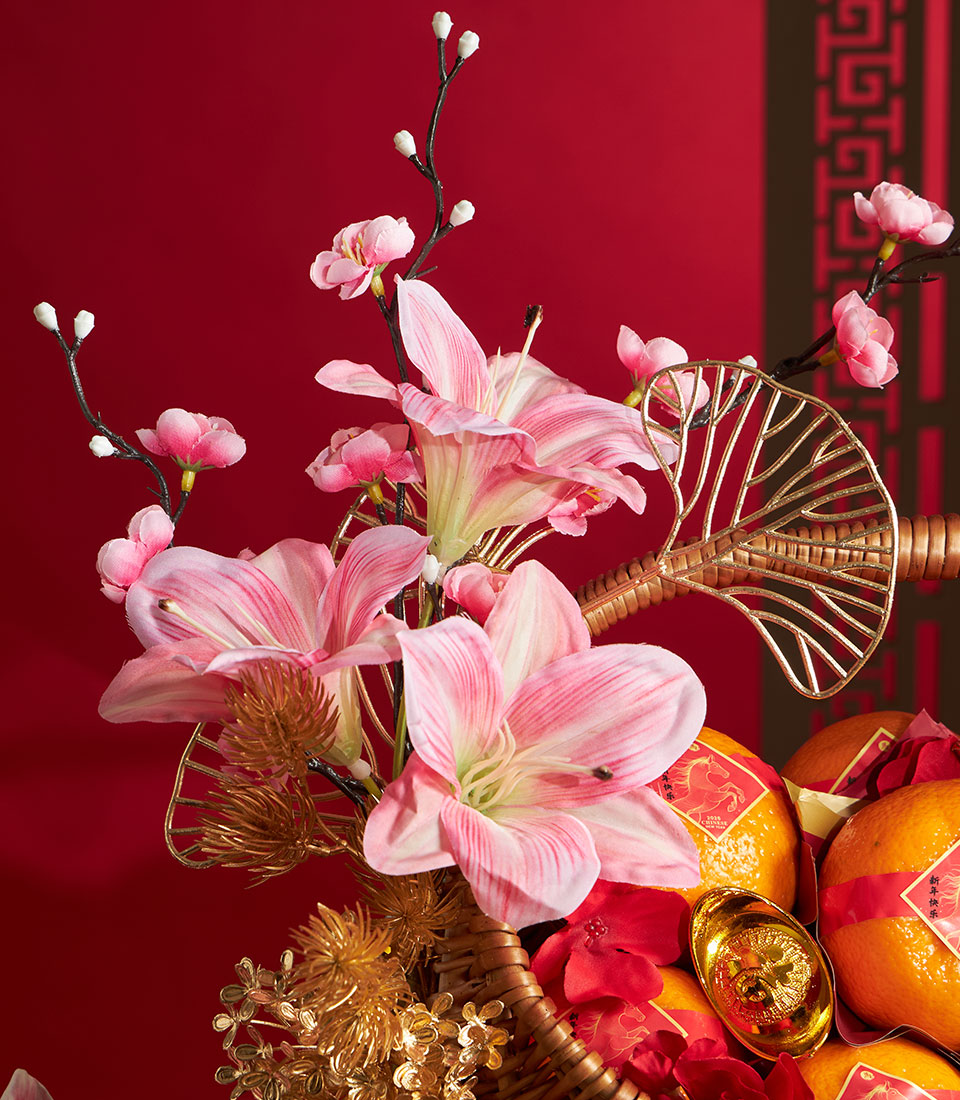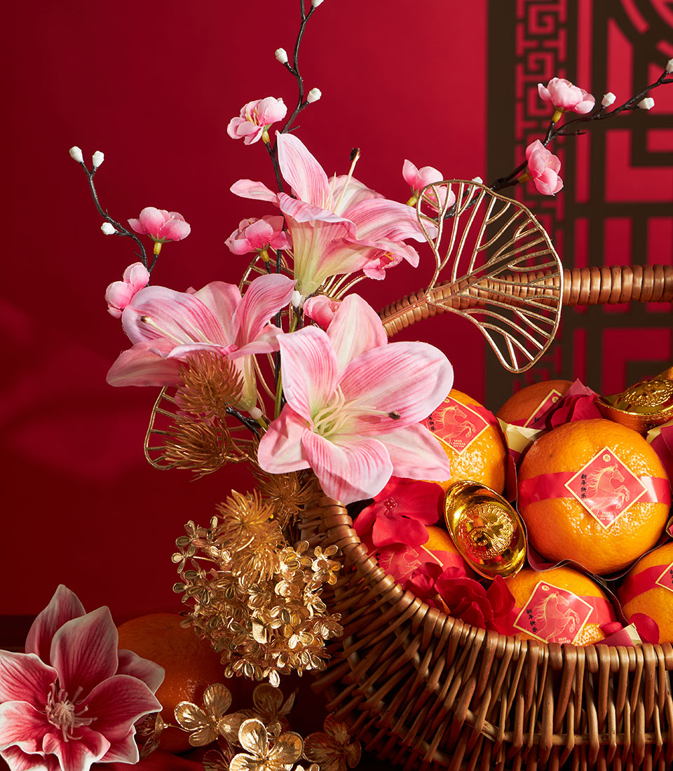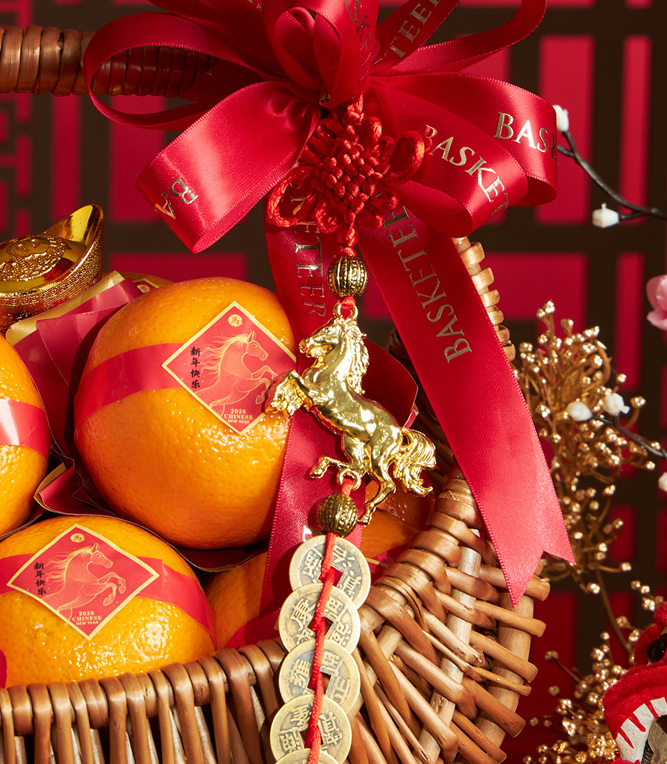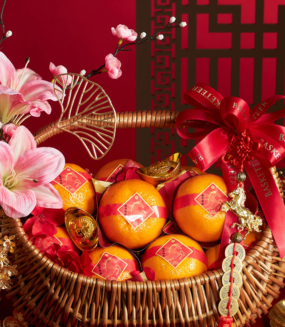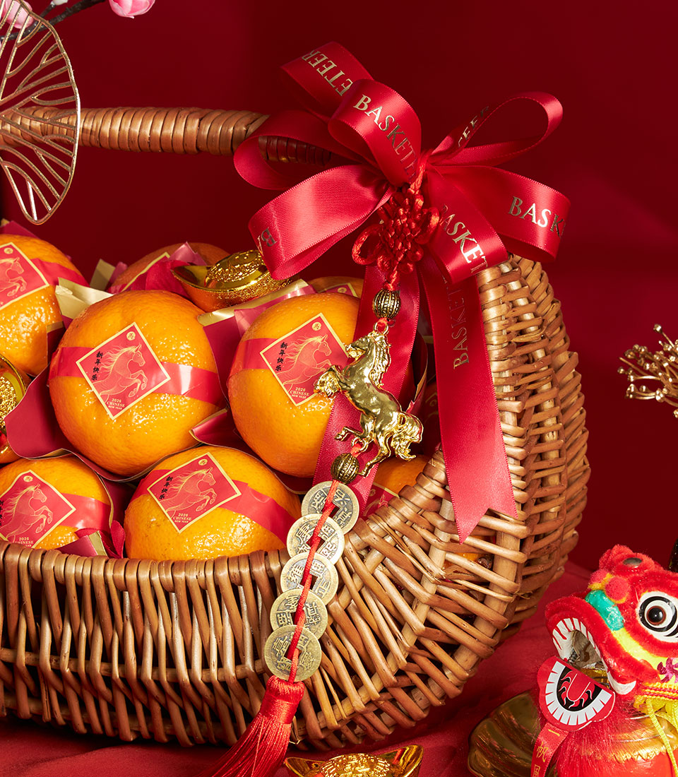 A grand Chinese New Year mandarin orange basket showcasing premium Taiwanese oranges, thoughtfully styled to represent abundance, success, and timeless elegance.