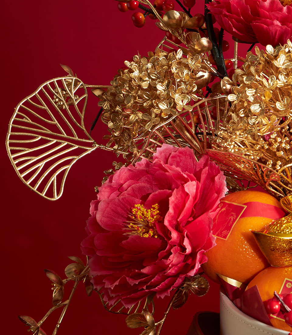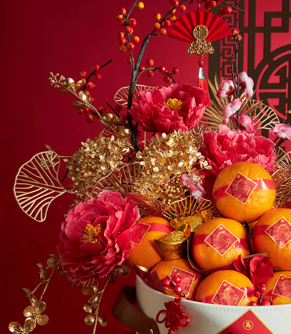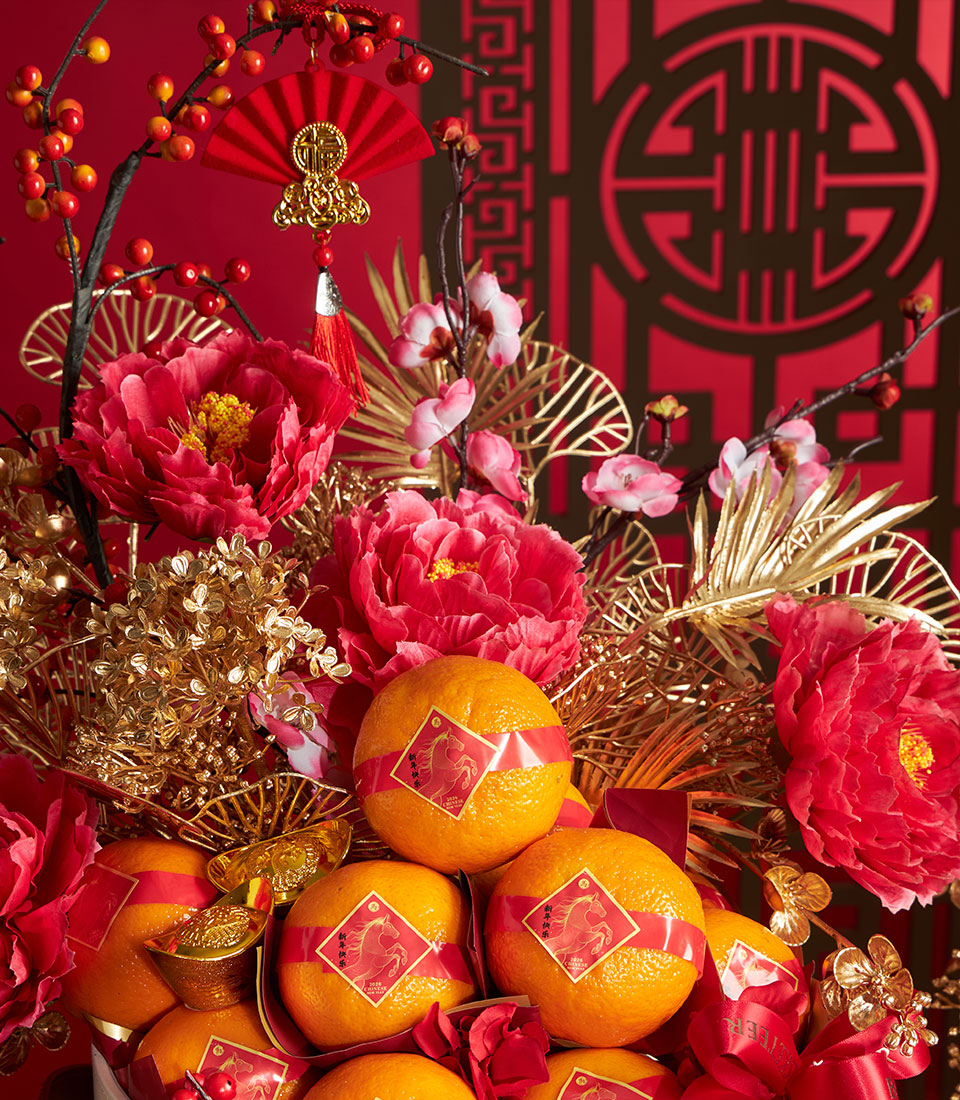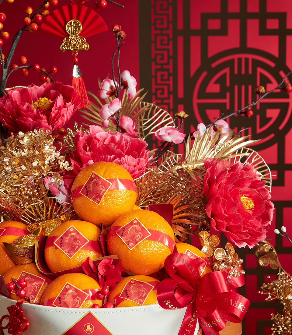 A premium Chinese New Year gift basket beautifully arranged with auspicious mandarin oranges in a festive red basket, enhanced with elegant Chinese decorative elements. A meaningful gift for celebrating prosperity, good fortune, and success during Lunar New Year.