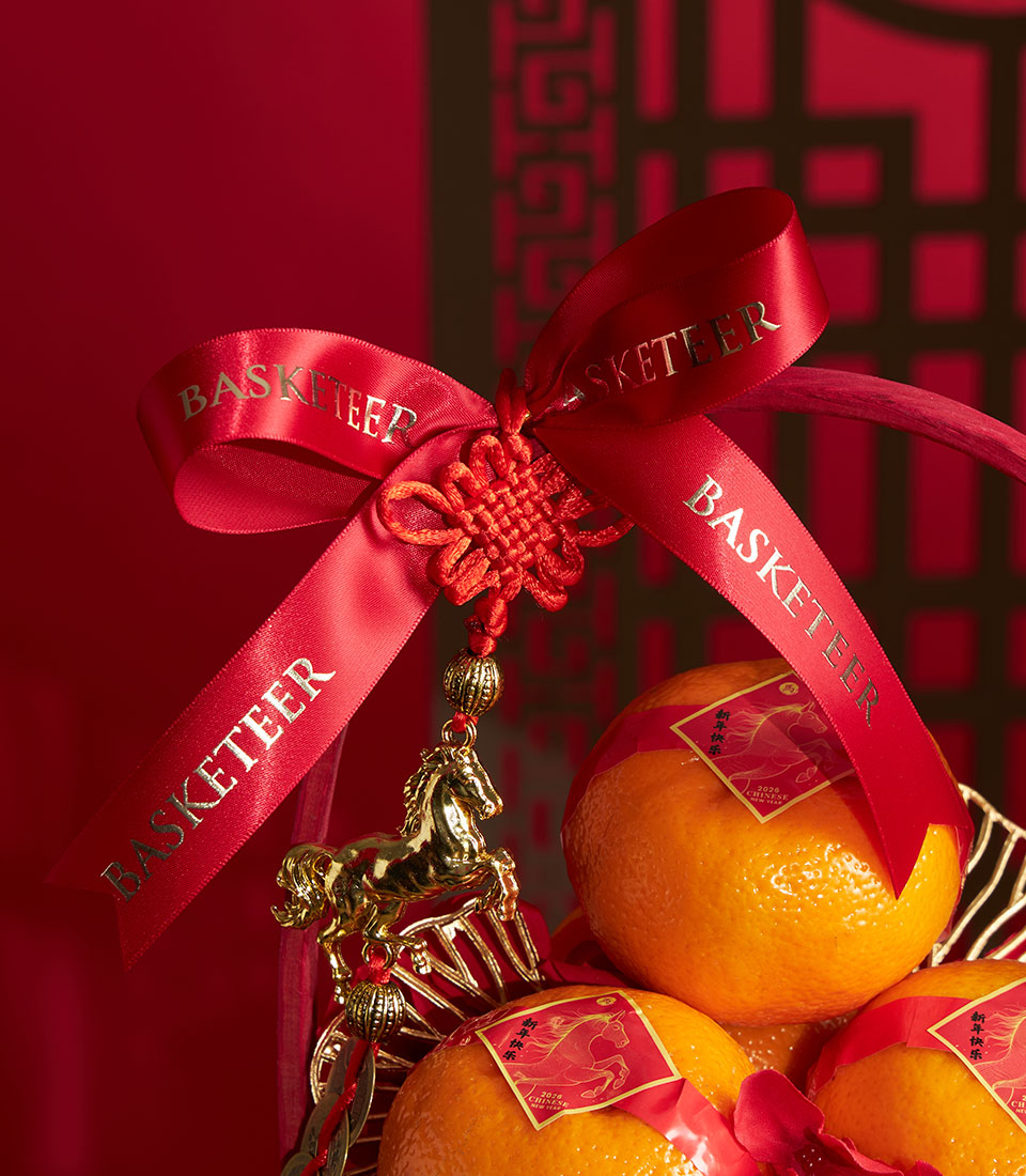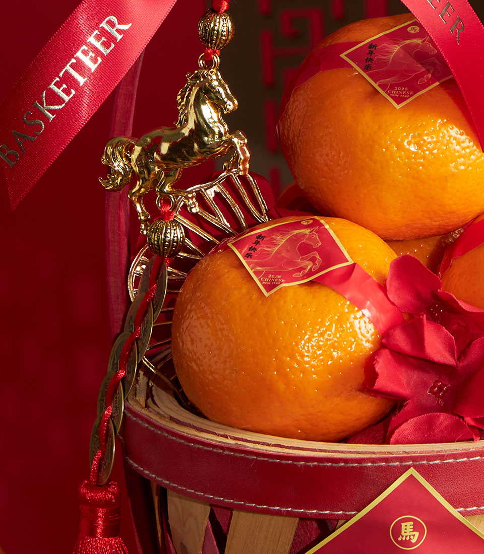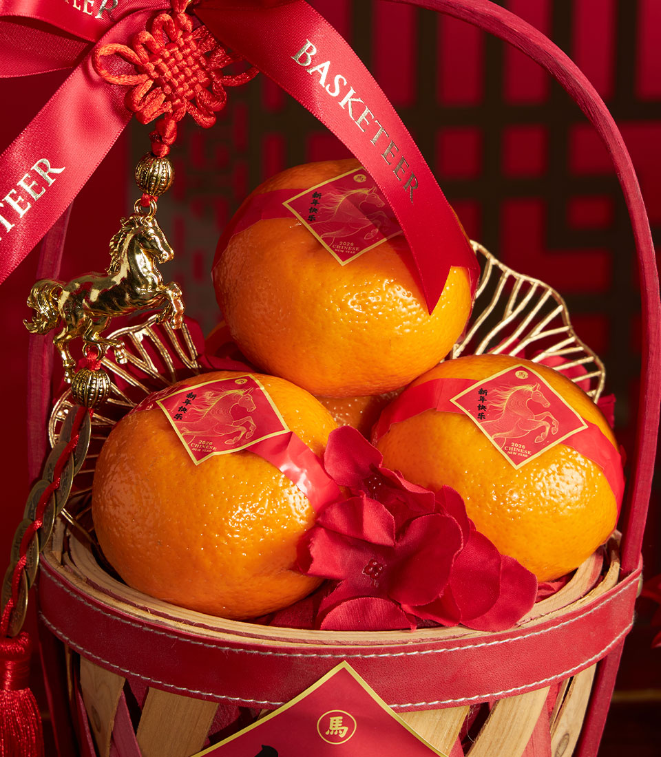 A simple and festive Chinese New Year mandarin orange basket presented in a classic wooden-style basket with a red ribbon accent. Designed to symbolise prosperity, good fortune, and auspicious beginnings, this basket is an ideal entry-level choice for Lunar New Year gifting.