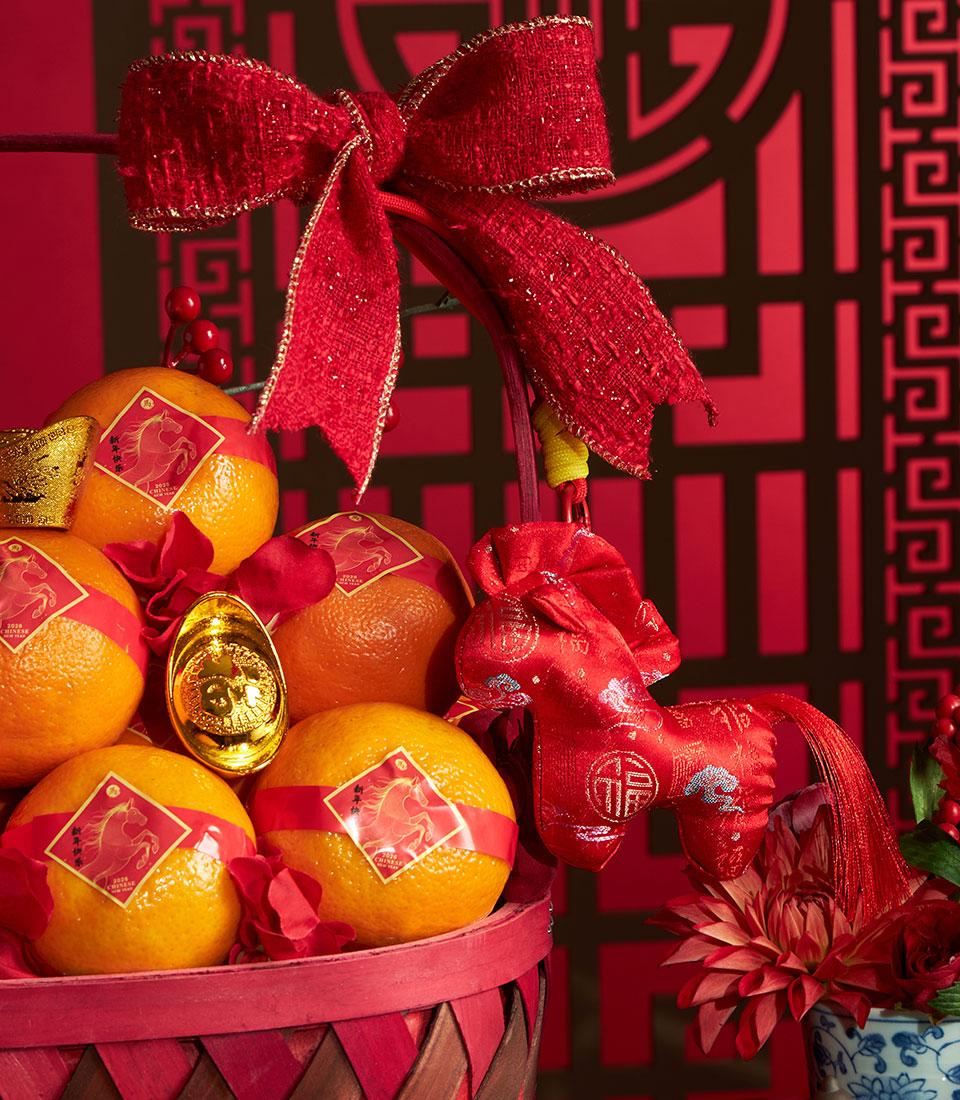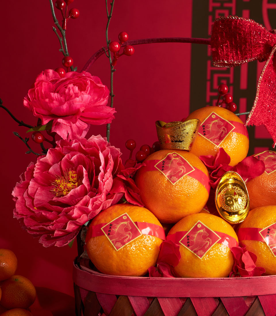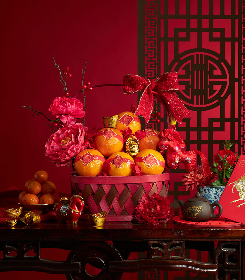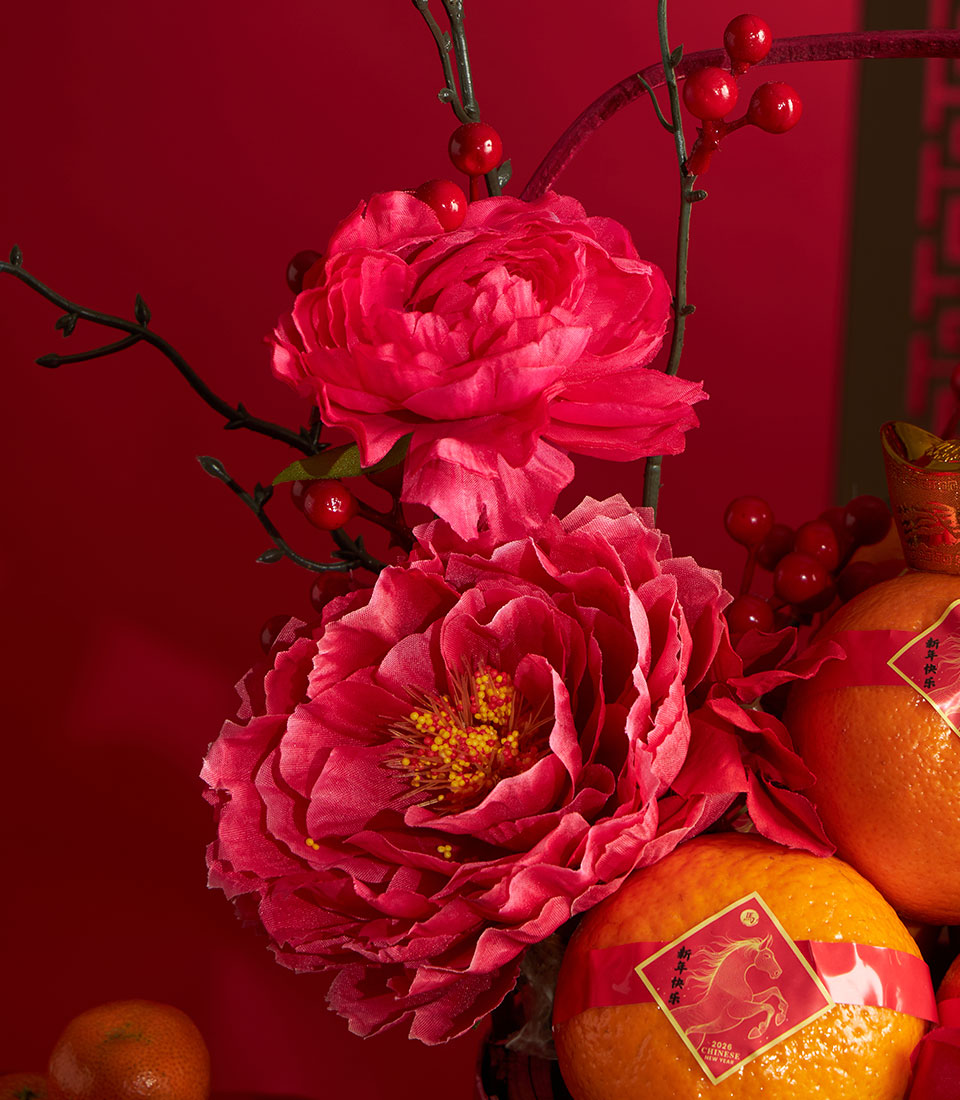 A festive Chinese New Year mandarin orange basket presented in a decorative woven basket, enhanced with artificial floral decorations inspired by traditional Lunar New Year symbolism. Designed to convey prosperity, happiness, and good fortune, this basket offers a stylish and long-lasting gifting option for the festive season.