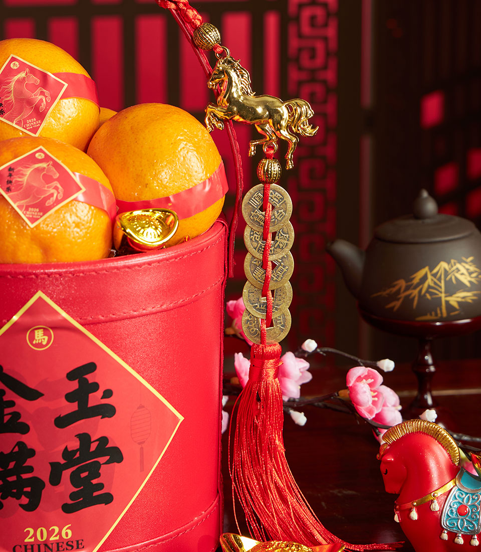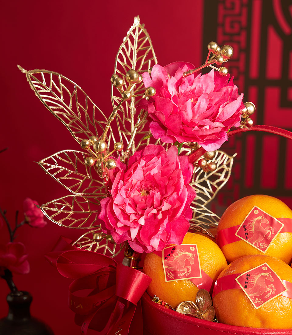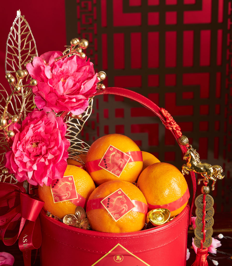 A cheerful Chinese New Year mandarin orange basket presented in a festive red container, accented with artificial floral decorations inspired by traditional Lunar New Year symbolism. Designed to convey prosperity and good fortune, this basket is a practical and elegant gifting option that remains beautiful throughout the festive season.
