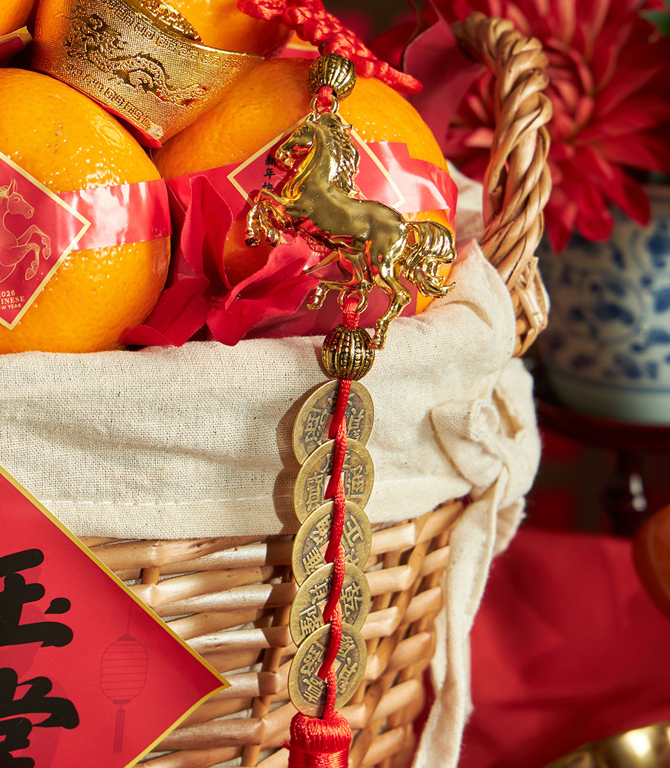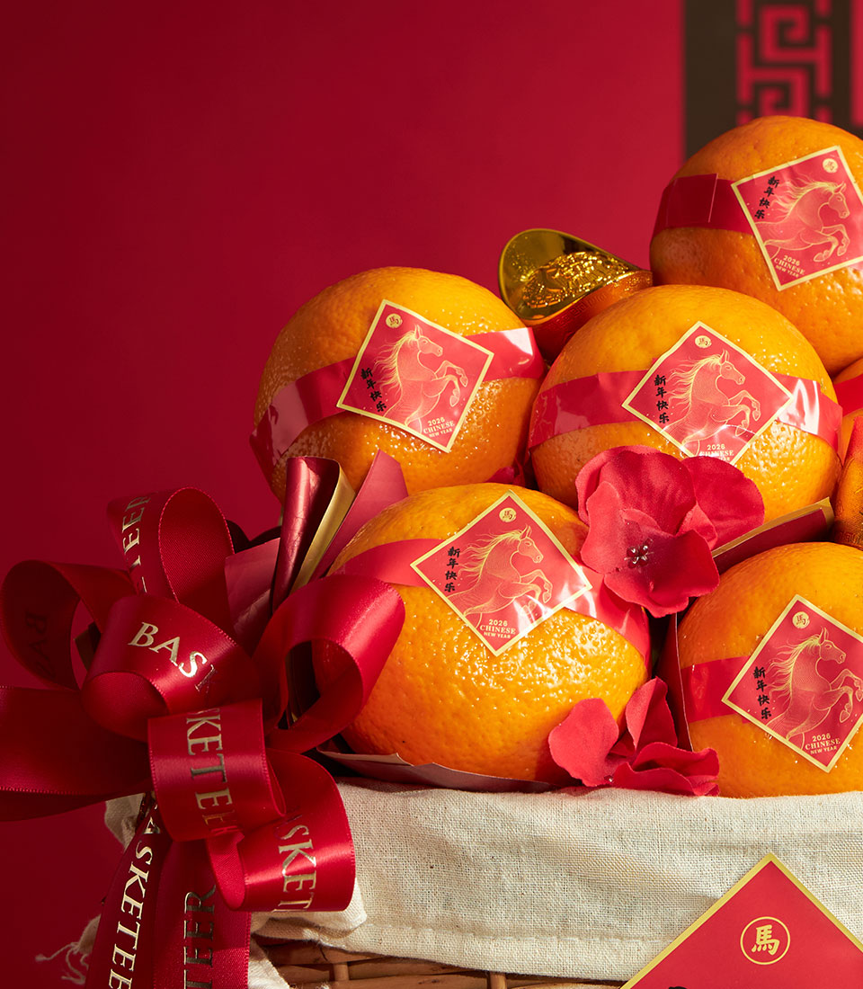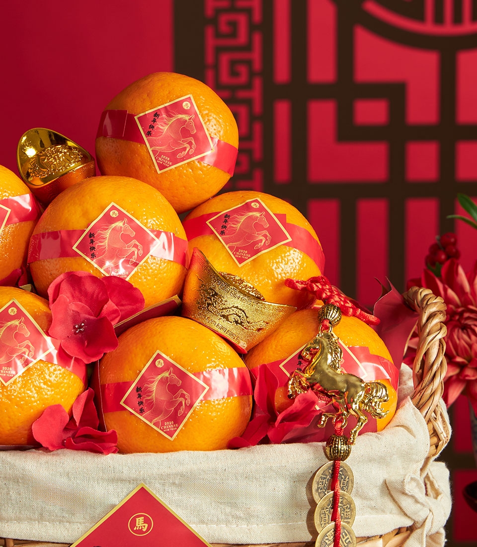 A traditional Chinese New Year mandarin orange basket presented in a classic woven basket with festive red accents and auspicious detailing. Thoughtfully arranged to symbolise prosperity and good fortune, this basket is an ideal Lunar New Year gift for family, friends, and business associates.
