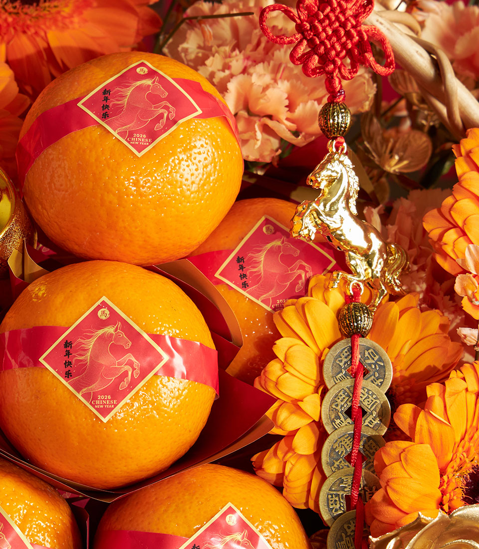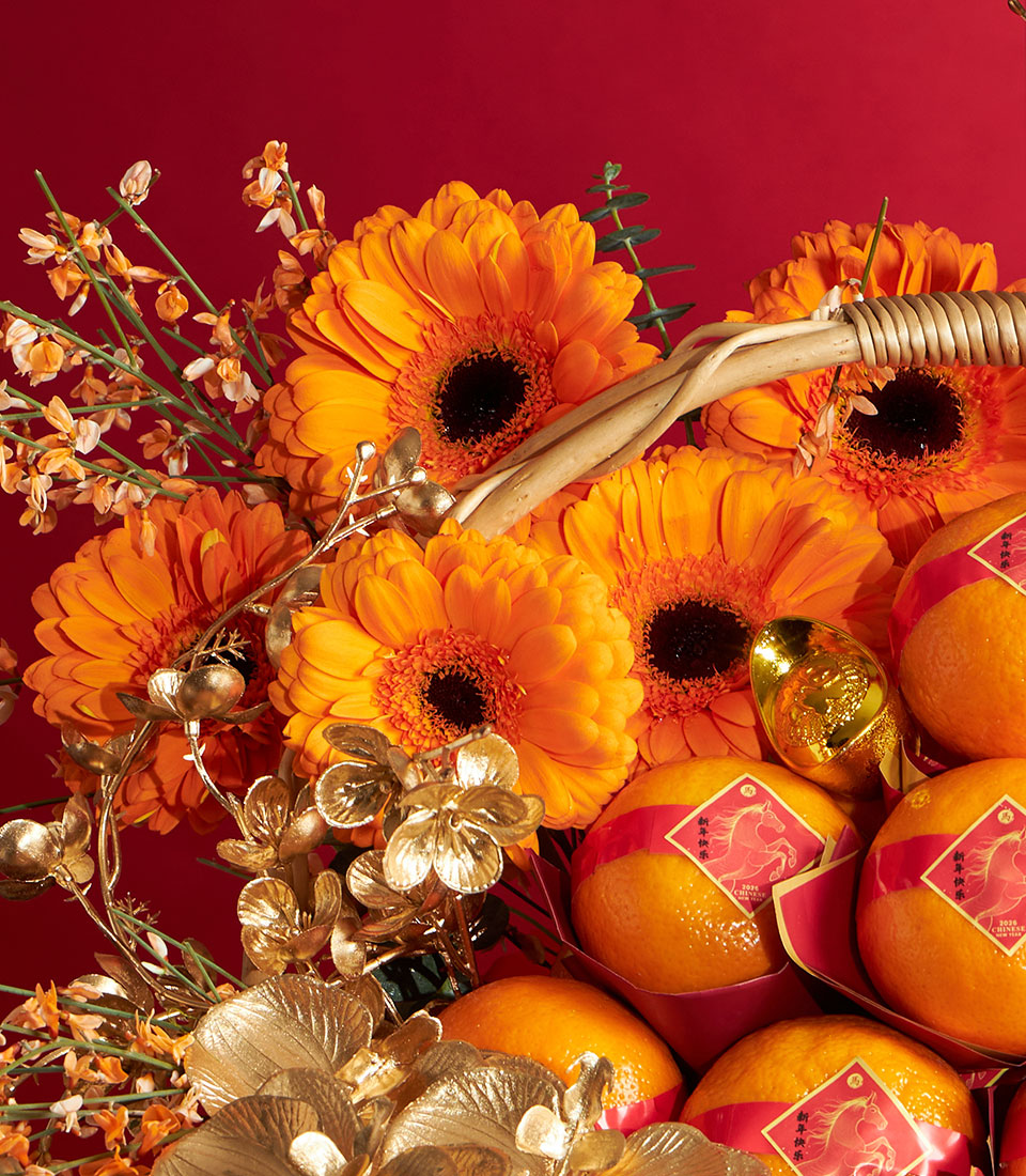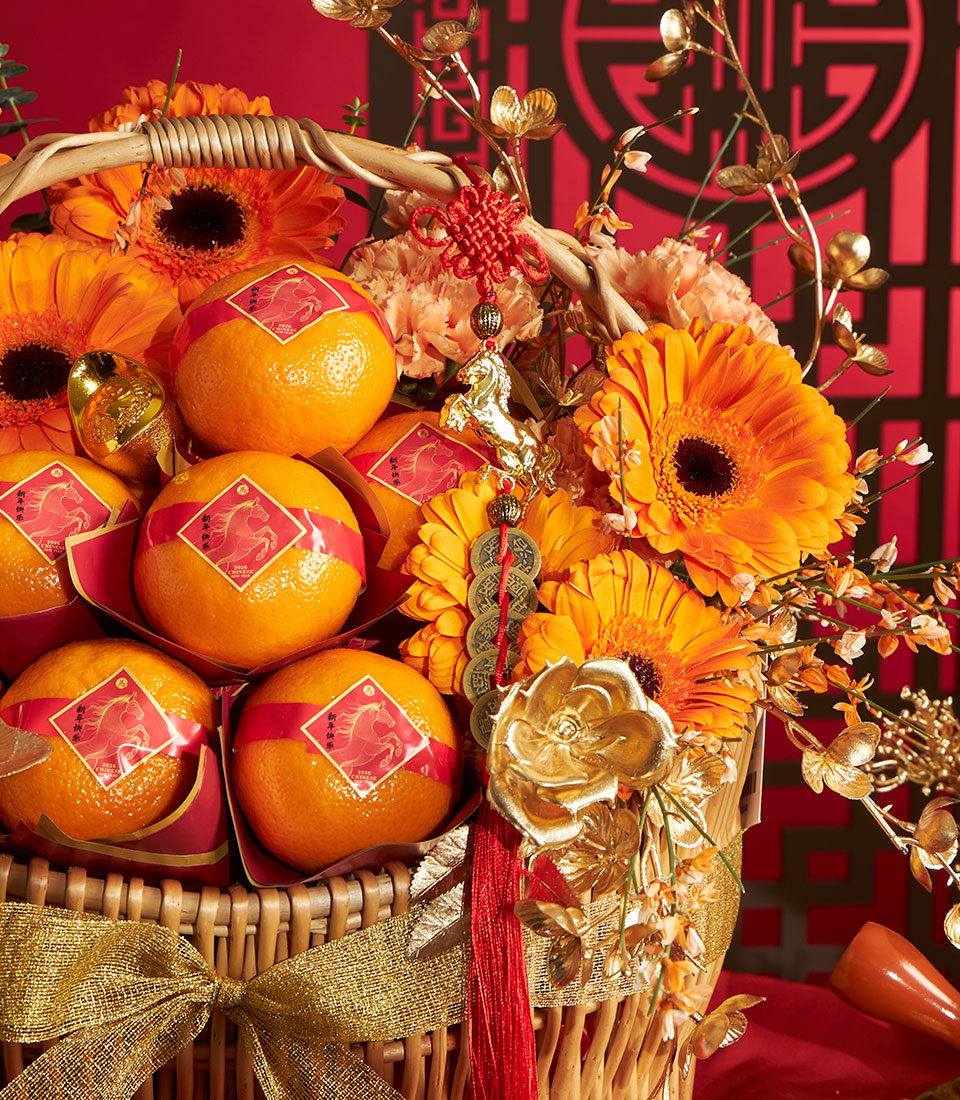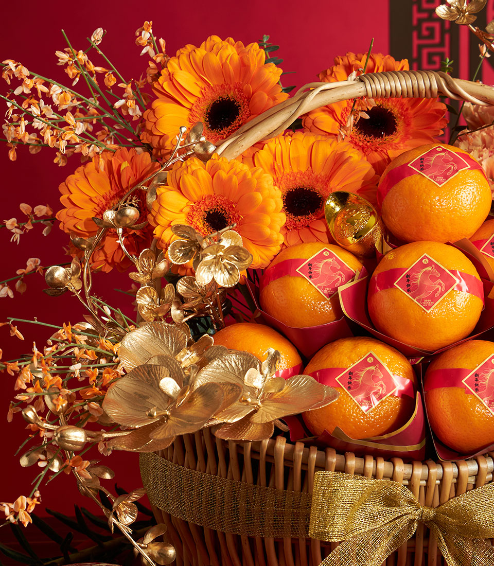 An elegant Chinese New Year mandarin orange basket presented in a classic woven basket, decorated with golden floral accents and festive red elements. Designed to convey prosperity, abundance, and warm wishes, this basket is ideal for Lunar New Year gifting to family, elders, and business associates.