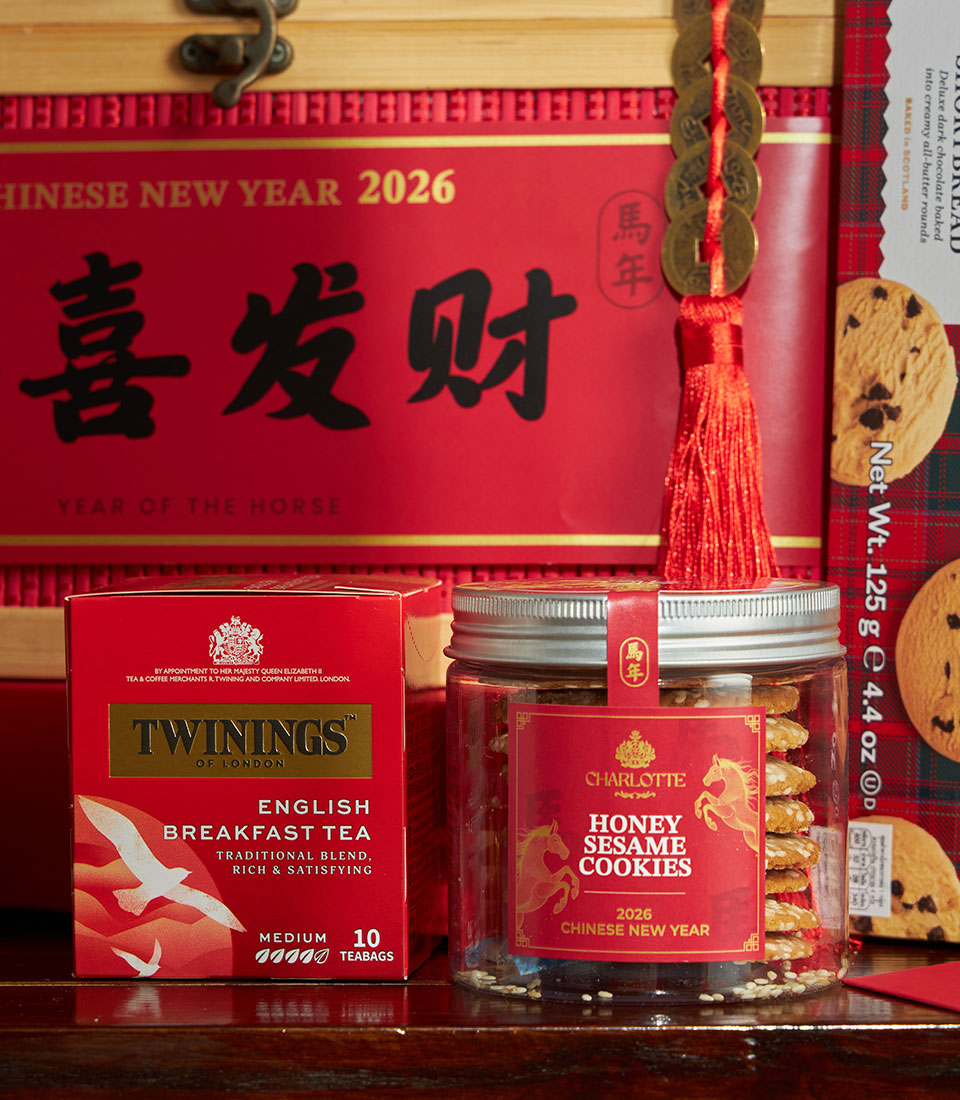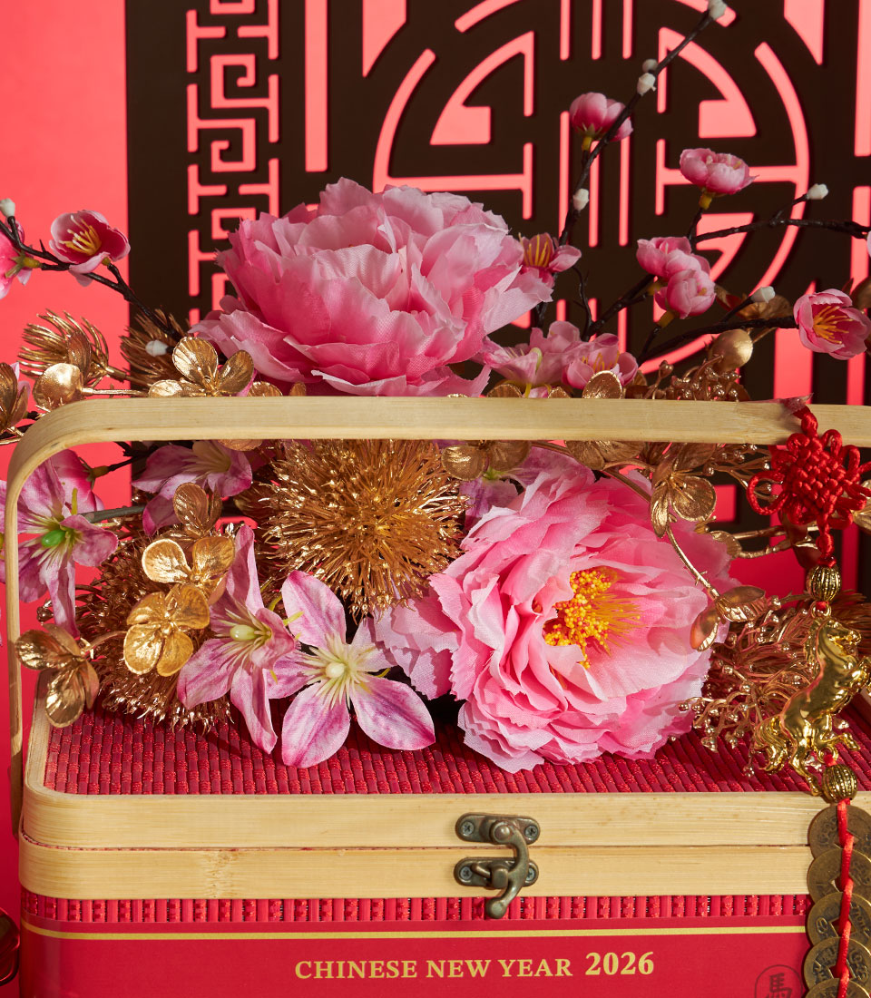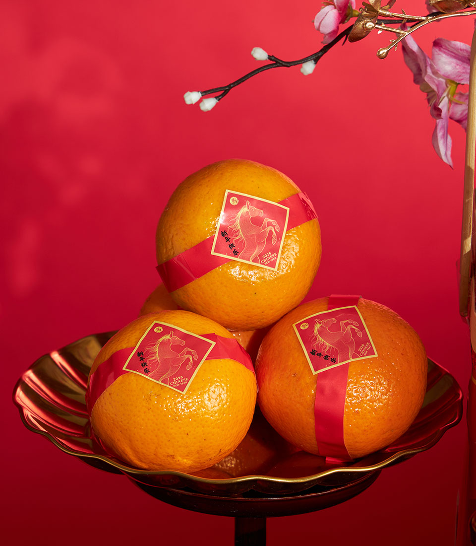 An elegant Chinese New Year gift box featuring auspicious mandarin oranges paired with premium sweets, tea, and refreshing beverages. Beautifully arranged in a festive red box with floral Chinese decorative elements, this gift symbolises prosperity, happiness, and good fortune for Lunar New Year celebrations.