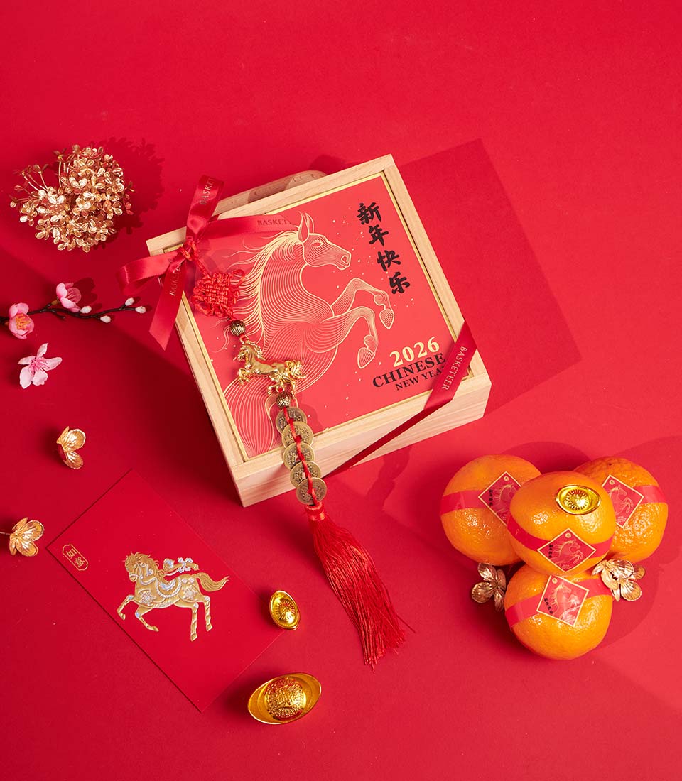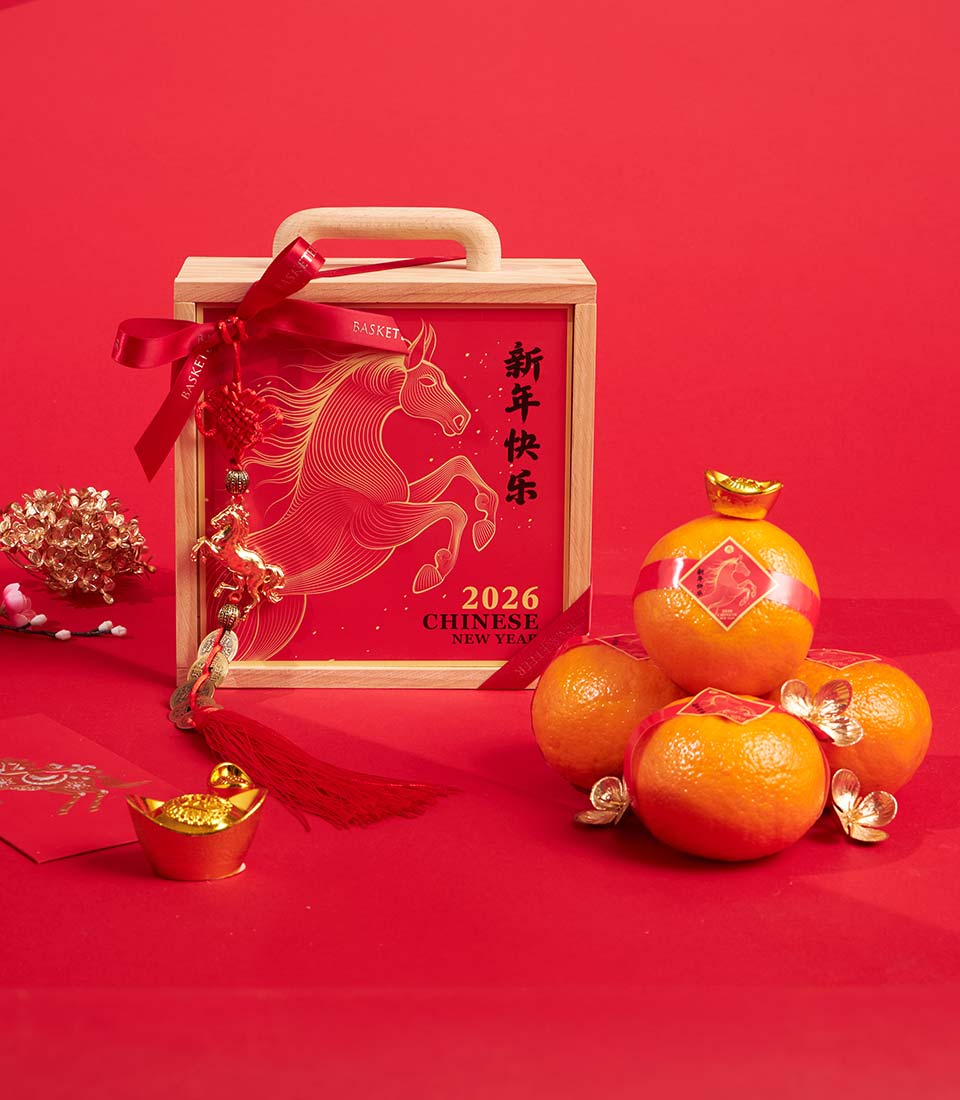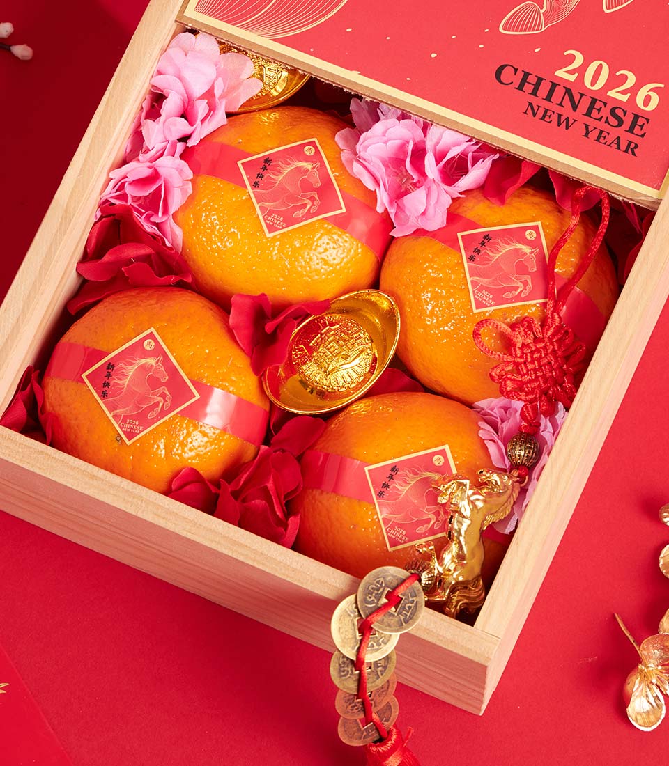 A festive Chinese New Year mandarin orange gift box presented in a classic wooden box with Lunar New Year artwork and elegant decorative accents. A meaningful gift symbolising prosperity, good fortune, and a fresh start for the new year.