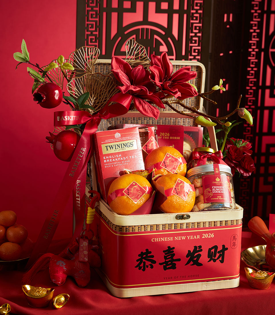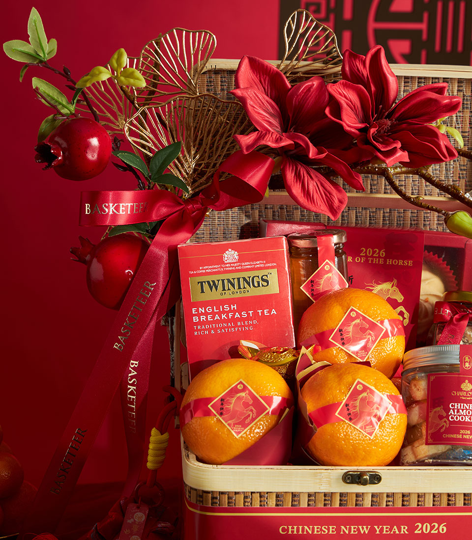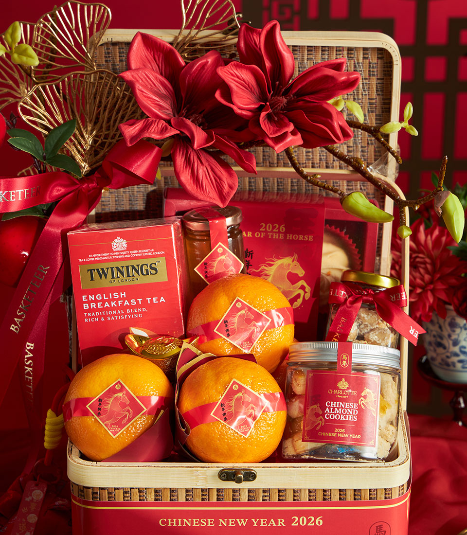 A premium Chinese New Year gift basket combining auspicious mandarin oranges with a curated selection of gourmet snacks, sweets, and tea. Beautifully presented in a festive red basket with floral decorations, this basket symbolises prosperity, happiness, and successideal for Lunar New Year gifting to family, elders, and business partners.