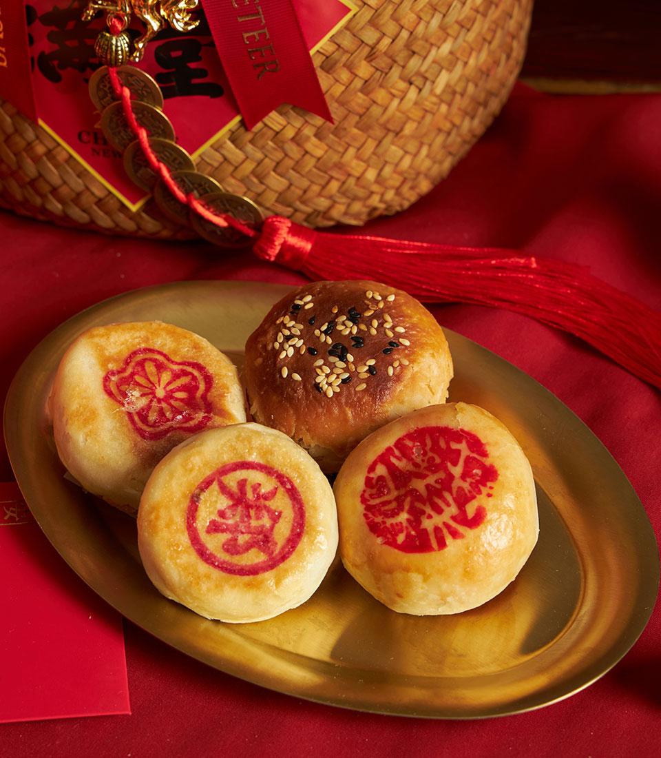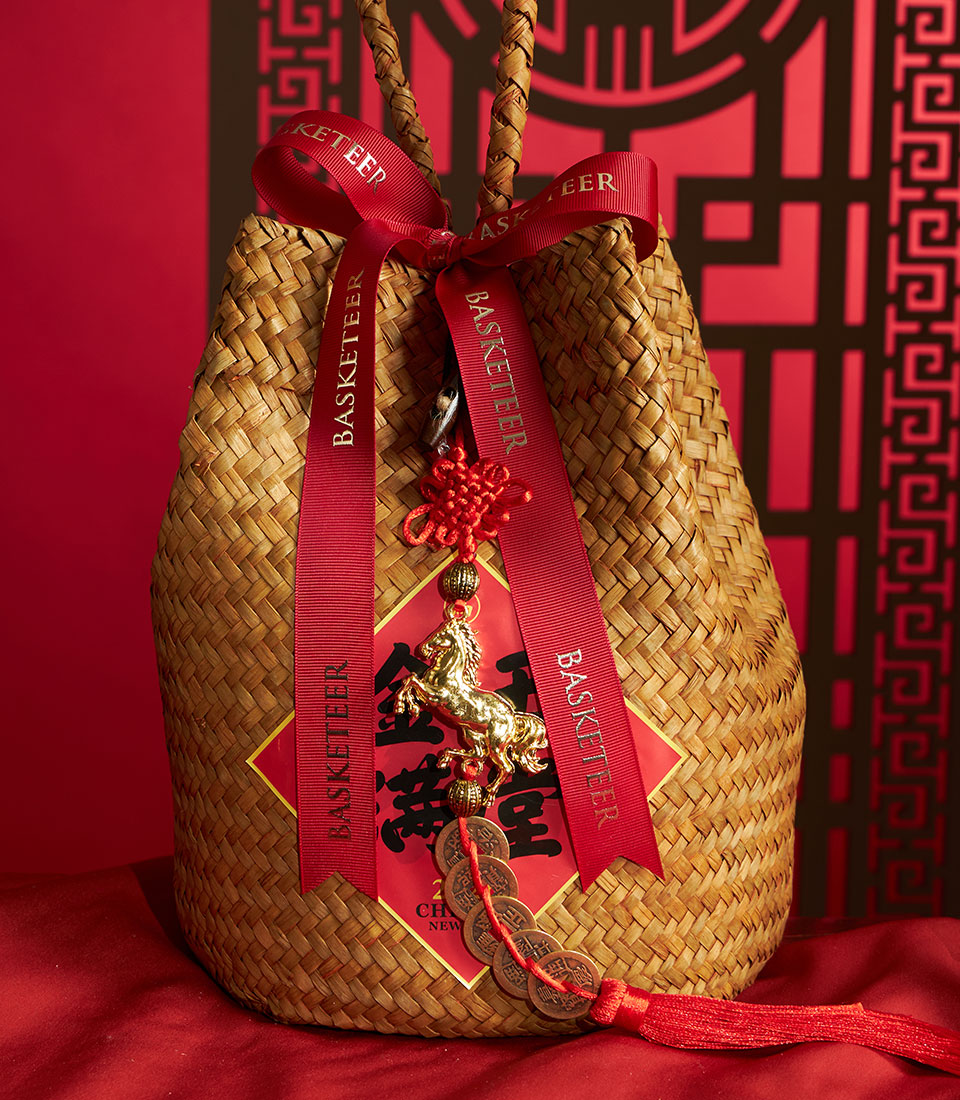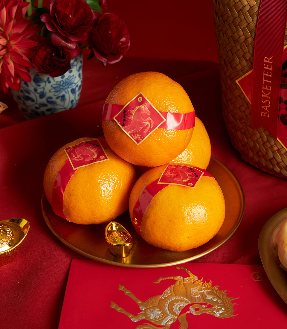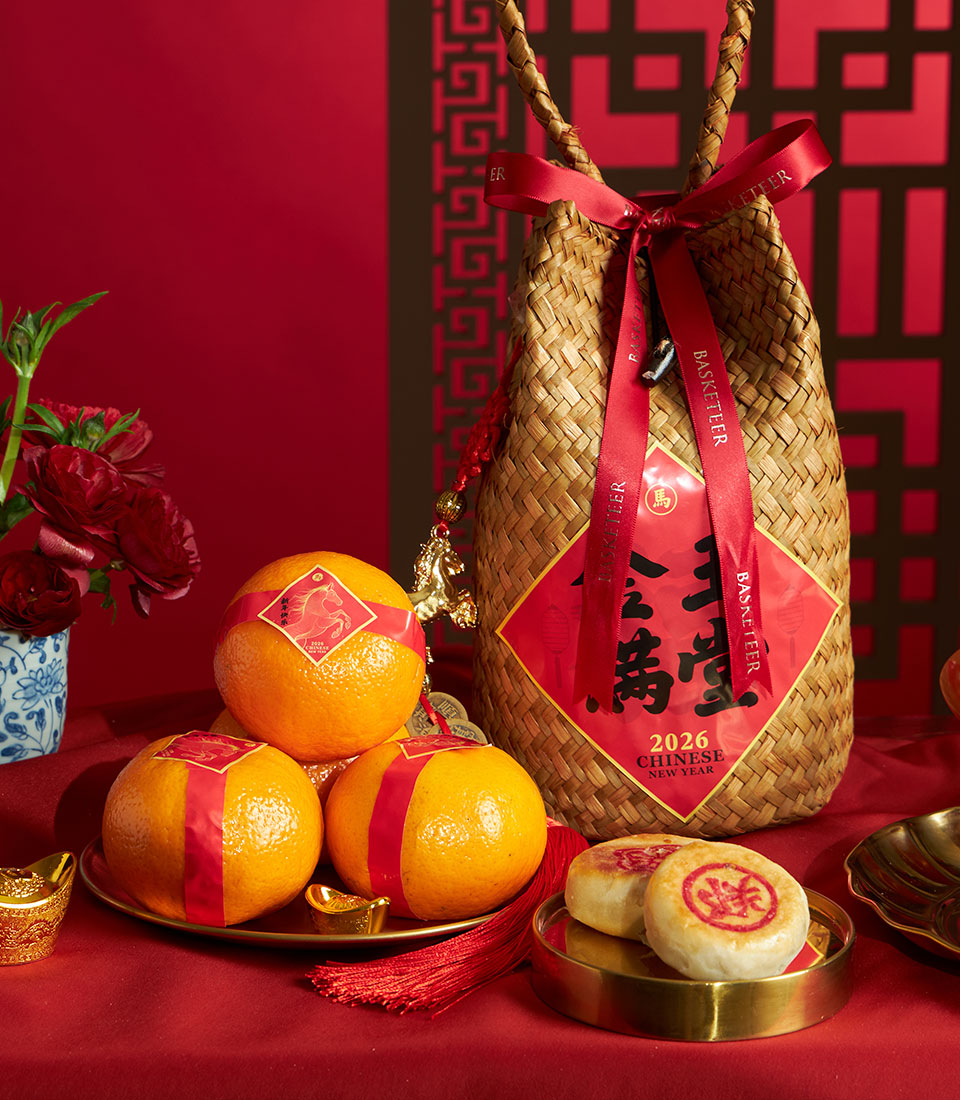 A thoughtfully curated Chinese New Year gift featuring auspicious mandarin oranges paired with a selection of traditional Chinese pastries, presented in a festive woven gift bag with red accents. Symbolising prosperity and sweet wishes, this gift is ideal for Lunar New Year gifting to family, friends, and colleagues.