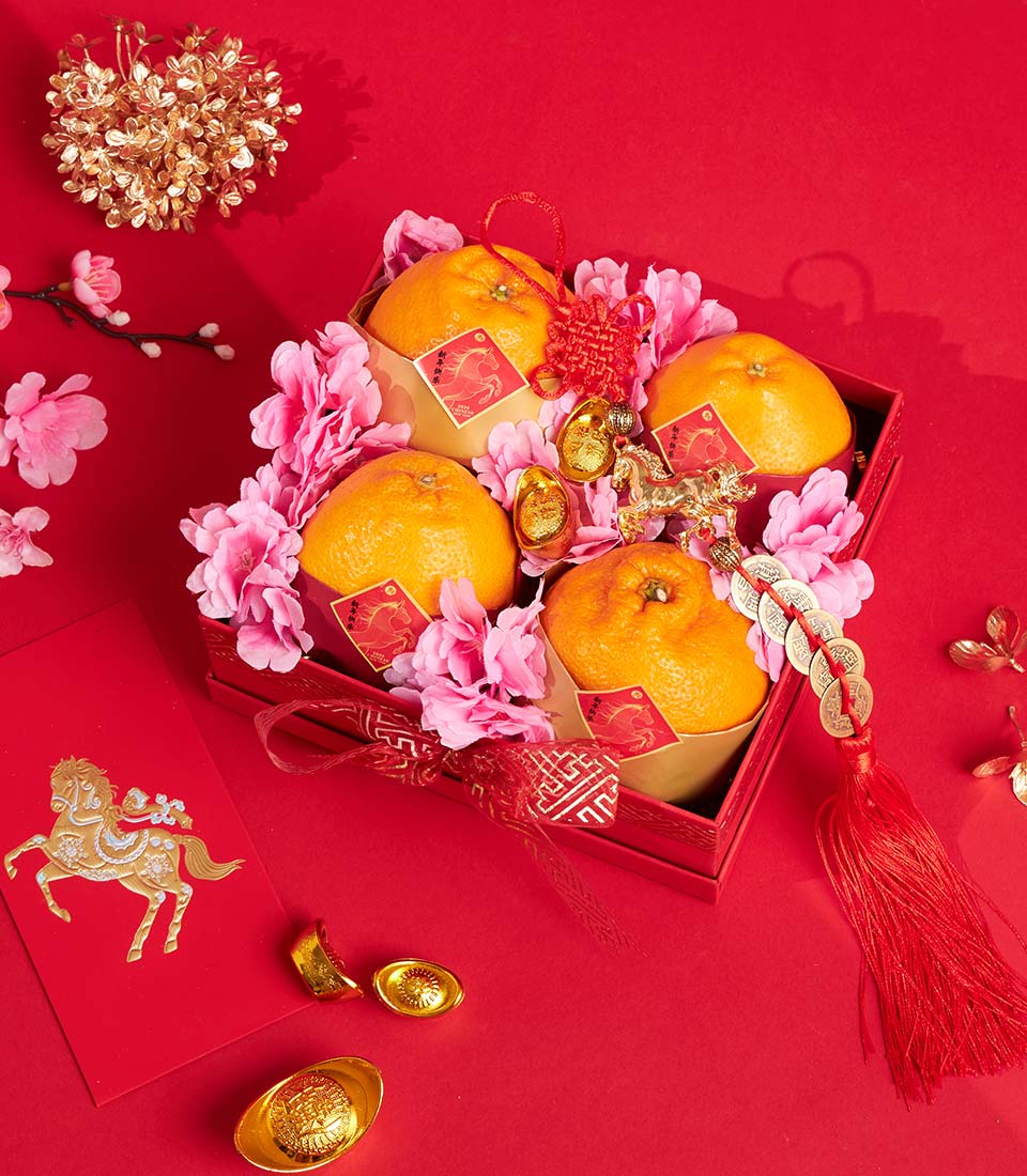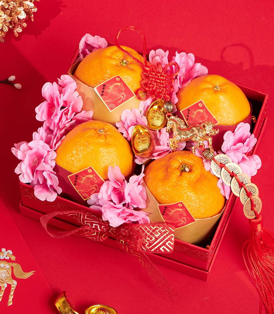 A refined Chinese New Year dekopon orange arrangement presented in a classic red gift box, accented with soft pink artificial florals and auspicious gold details. Designed to convey prosperity and celebration, this elegant set offers a modern yet festive New Year gifting experience.