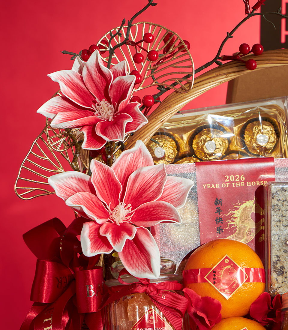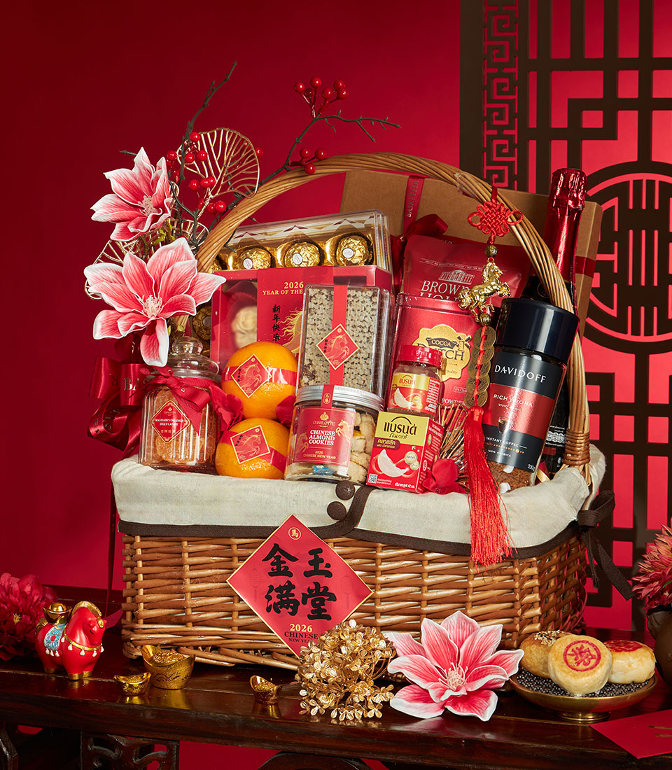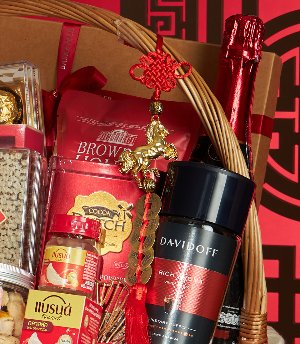 A luxurious Chinese New Year gift basket featuring a refined selection of festive sweets, gourmet treats, premium beverages, and auspicious mandarin oranges, beautifully arranged in a classic wicker basket with elegant Chinese decorative accents. A meaningful gift to celebrate prosperity, success, and abundance during Lunar New Year.
