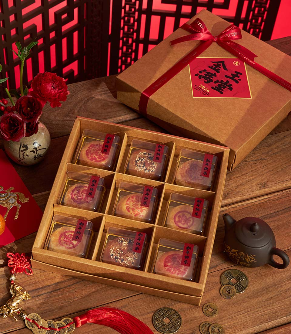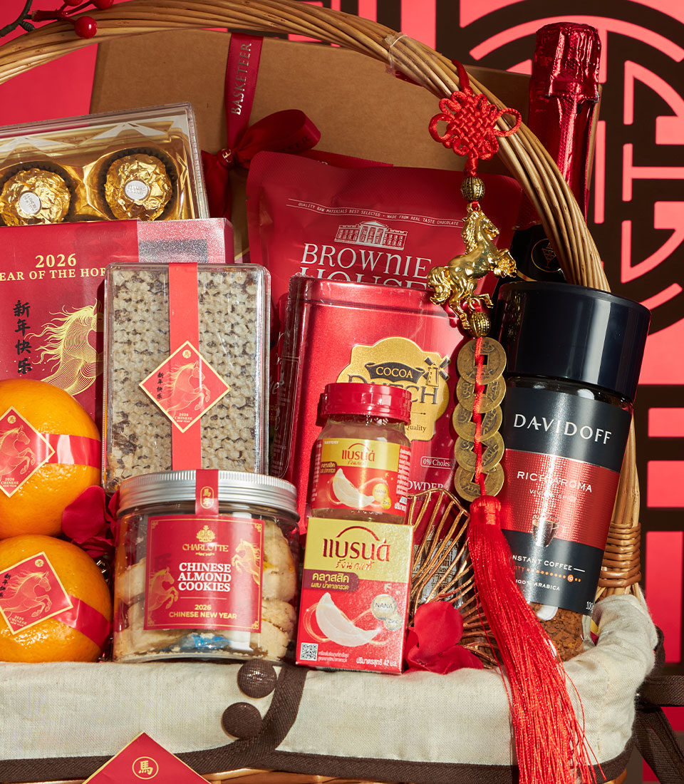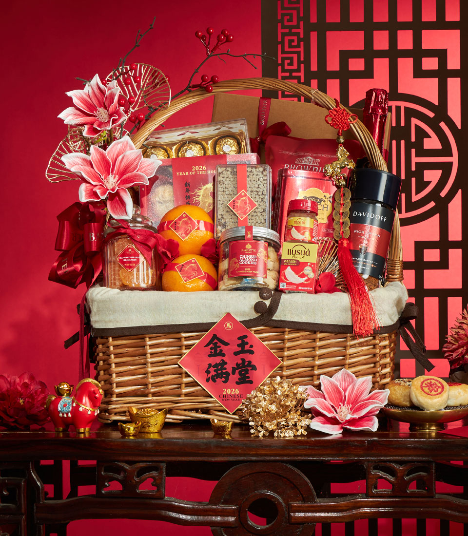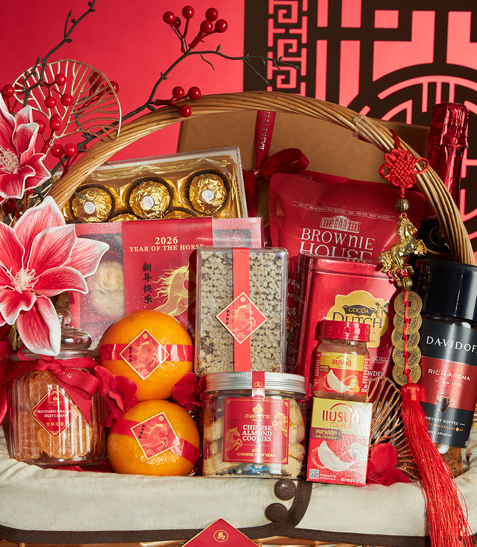 A luxurious Chinese New Year gift basket featuring a refined selection of festive sweets, gourmet treats, premium beverages, and auspicious mandarin oranges, beautifully arranged in a classic wicker basket with elegant Chinese decorative accents. A meaningful gift to celebrate prosperity, success, and abundance during Lunar New Year.