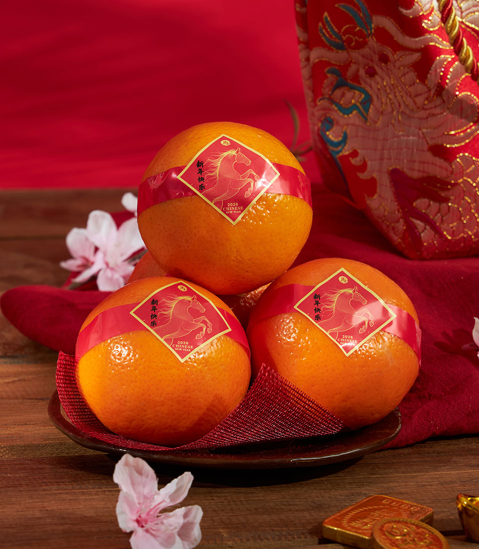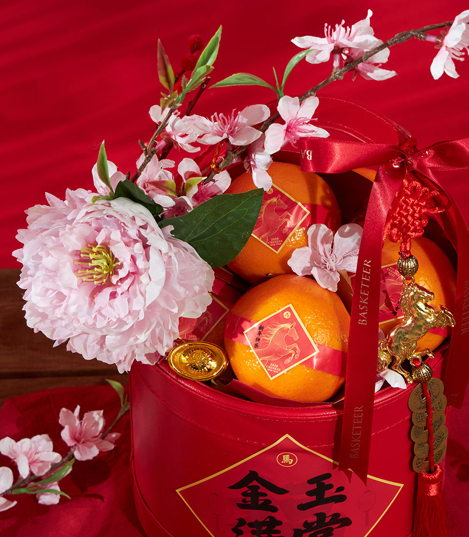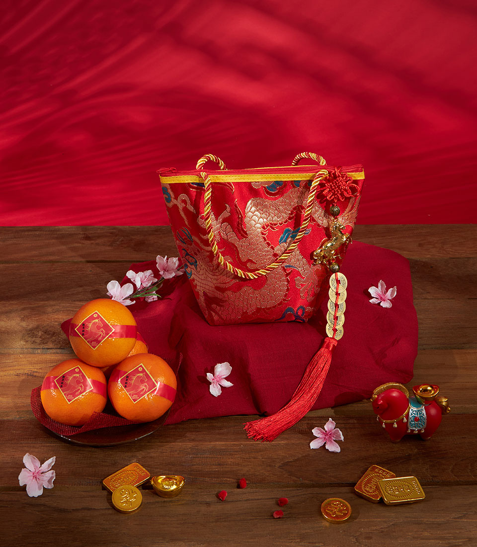 A festive Chinese New Year mandarin orange set presented in an elegant red brocade gift bag with gold detailing and auspicious ornaments. Designed to convey prosperity, good fortune, and refined celebration.