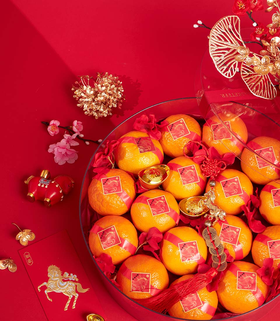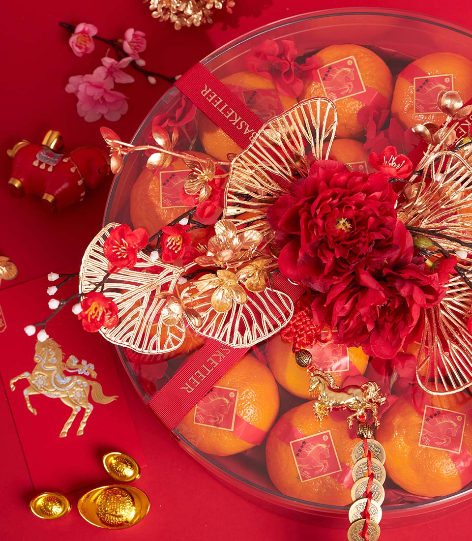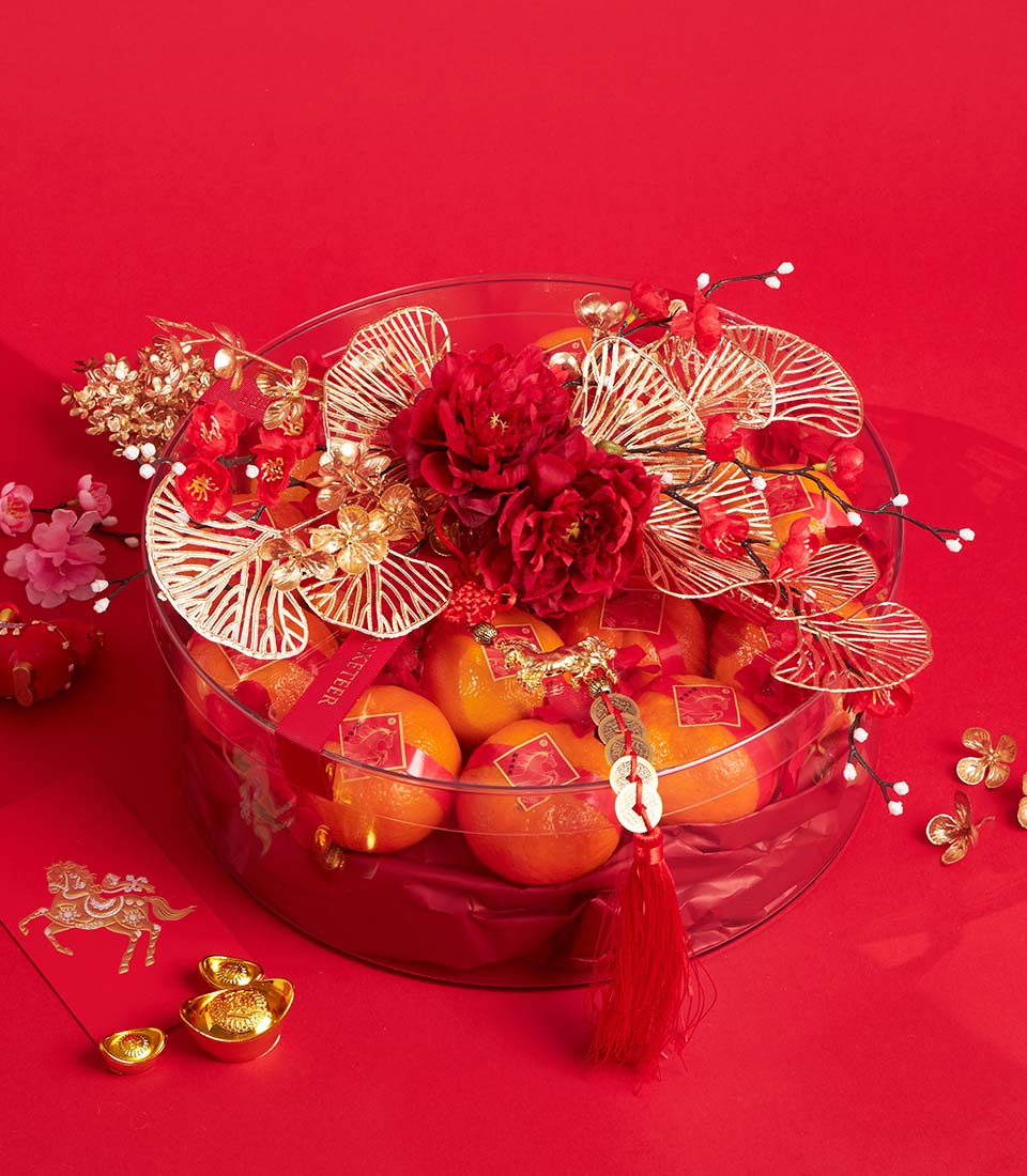 A striking Chinese New Year mandarin orange presentation arranged in a modern clear bowl, accented with rich red artificial florals and gold festive details. Designed for auspicious gifting and elegant seasonal display, this piece delivers a bold, luxurious New Year atmosphere.
