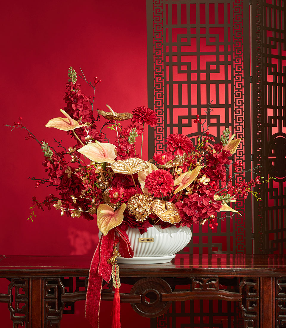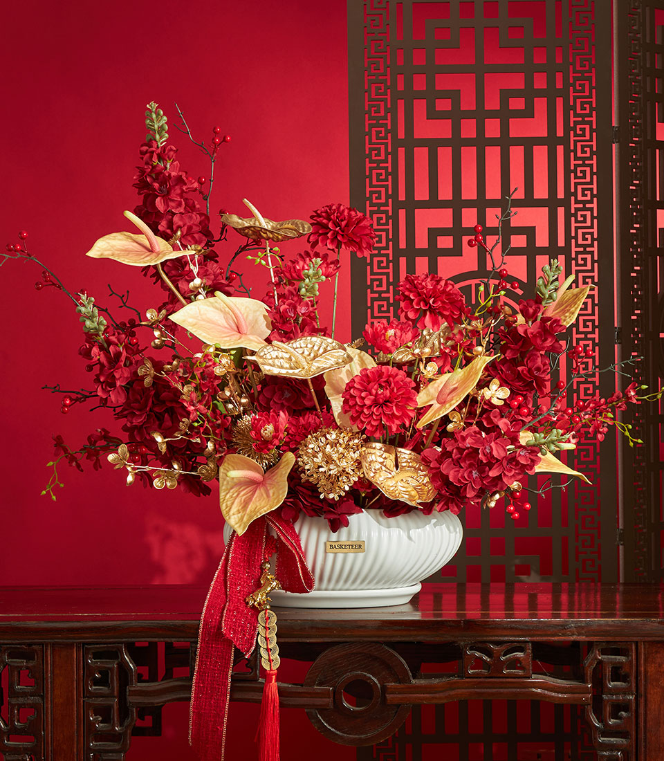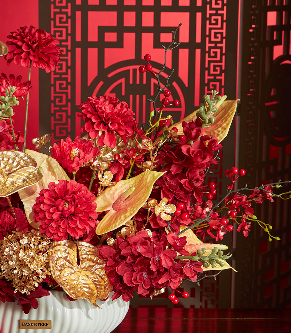 An elegant Chinese New Year artificial flower arrangement featuring layered red florals, gold-toned leaves, and festive accents. Styled in a classic decorative vase with rich textures and celebratory colors, this arrangement delivers a luxurious and auspicious look ideal for seasonal décor and festive displays.