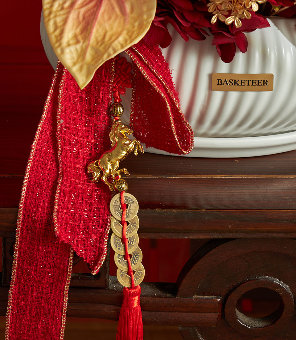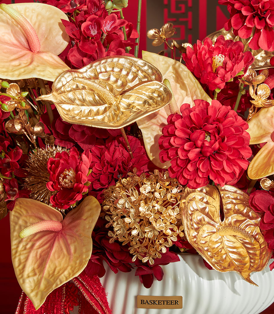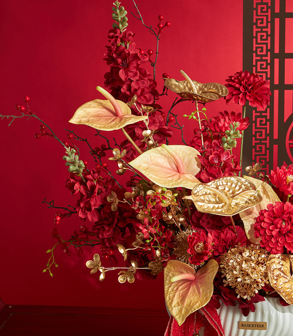 An elegant Chinese New Year artificial flower arrangement featuring layered red florals, gold-toned leaves, and festive accents. Styled in a classic decorative vase with rich textures and celebratory colors, this arrangement delivers a luxurious and auspicious look ideal for seasonal décor and festive displays.