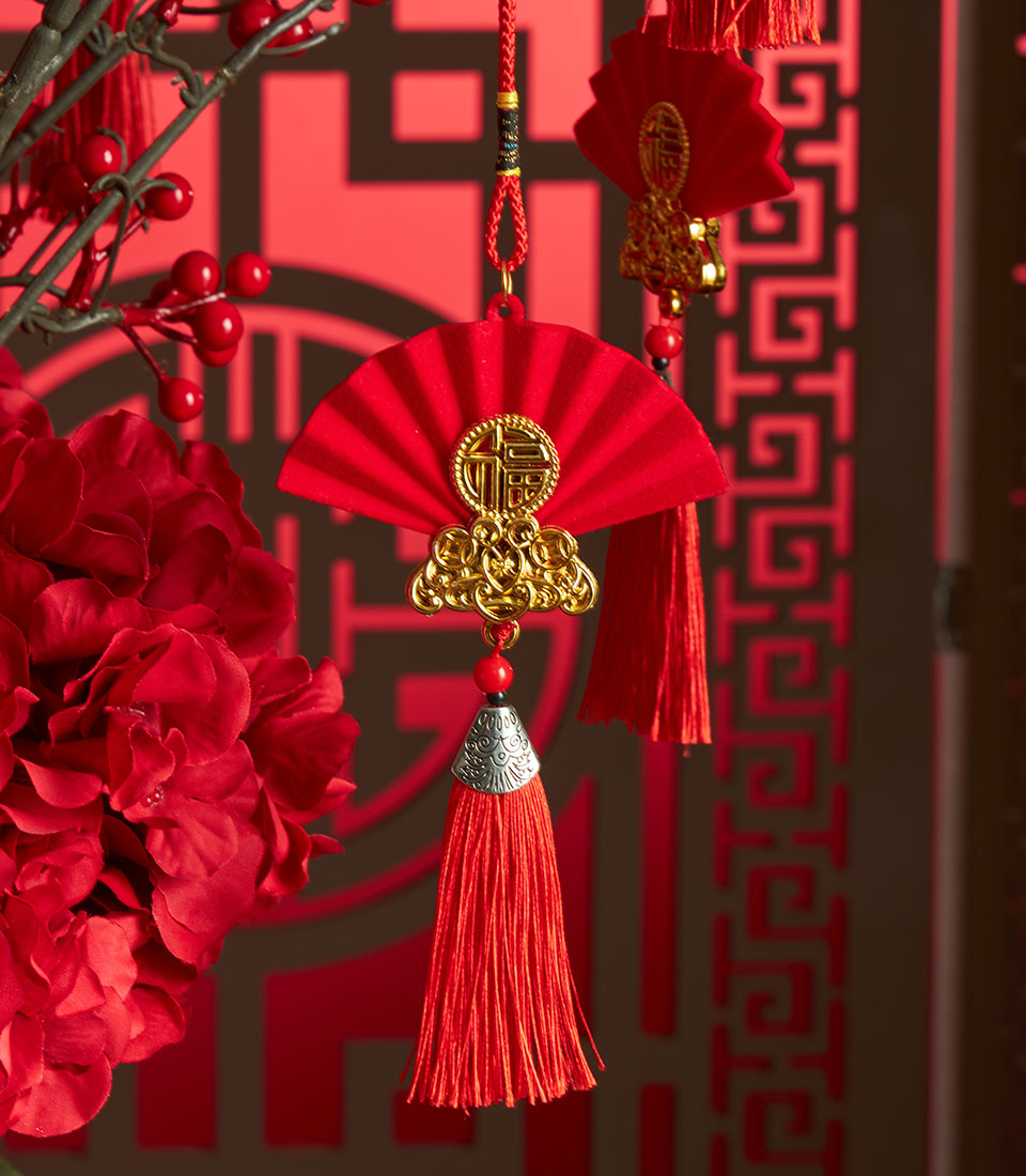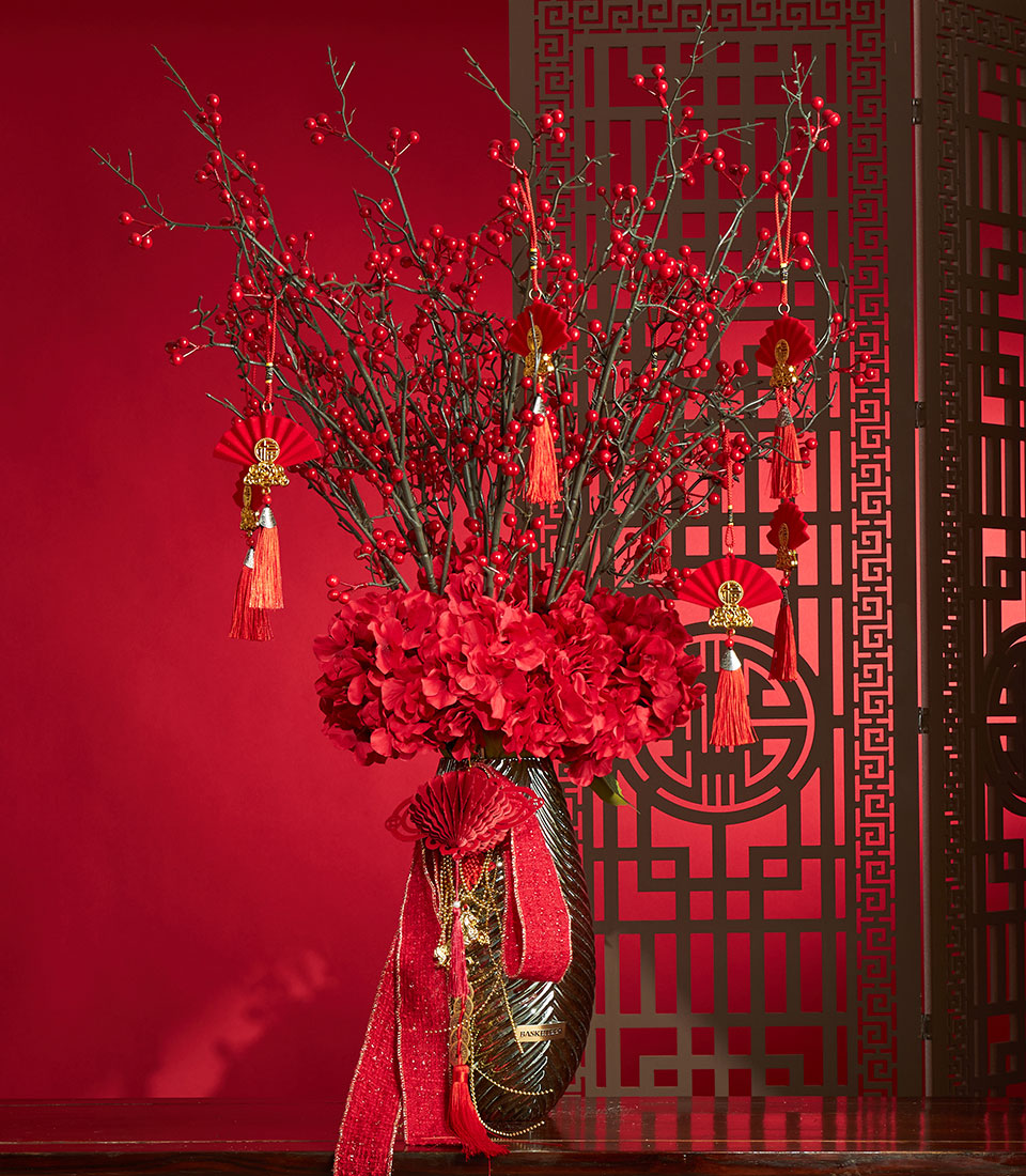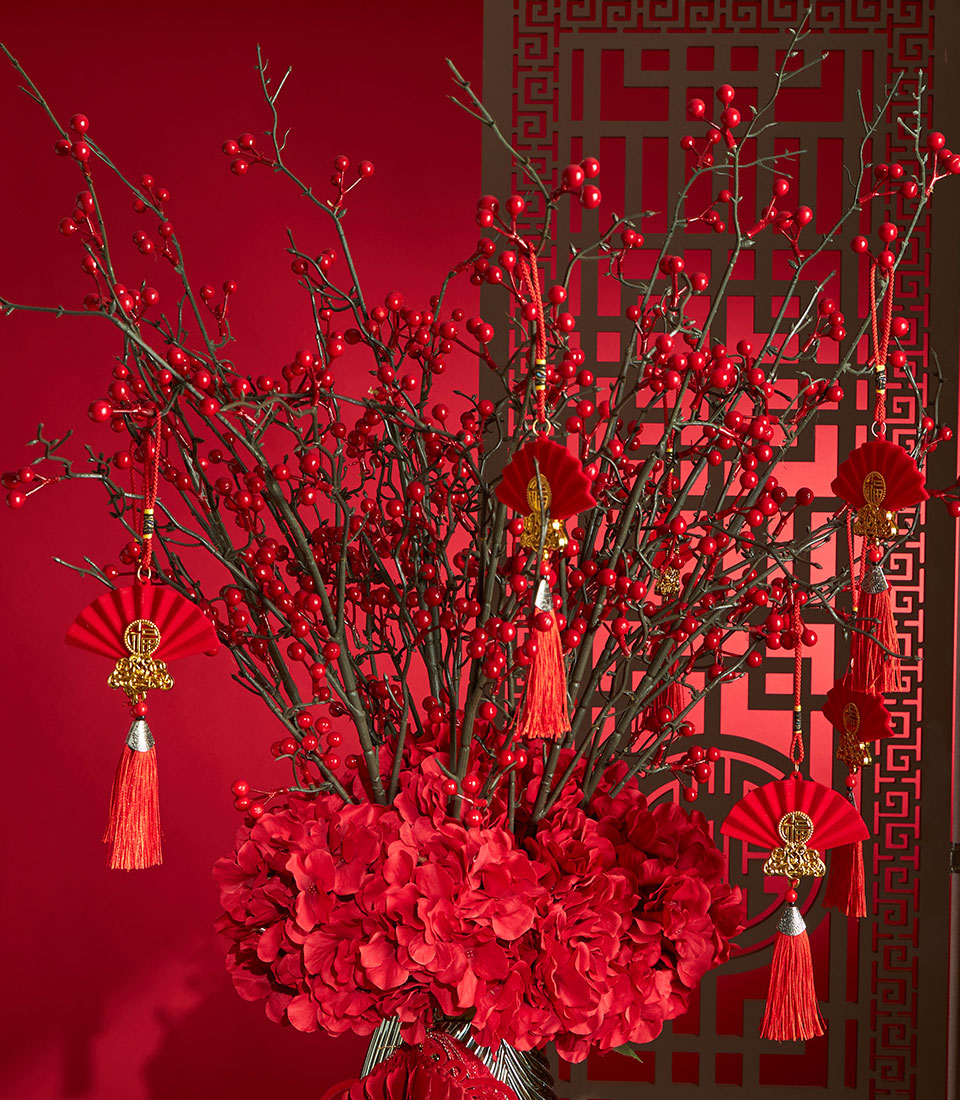 An elegant Chinese New Year floral decoration featuring vibrant red berry branches and lush red hydrangea flowers, beautifully arranged in a classic vase and finished with auspicious Chinese tags. A striking decorative piece that symbolises prosperity, joy, and festive blessings for Lunar New Year.