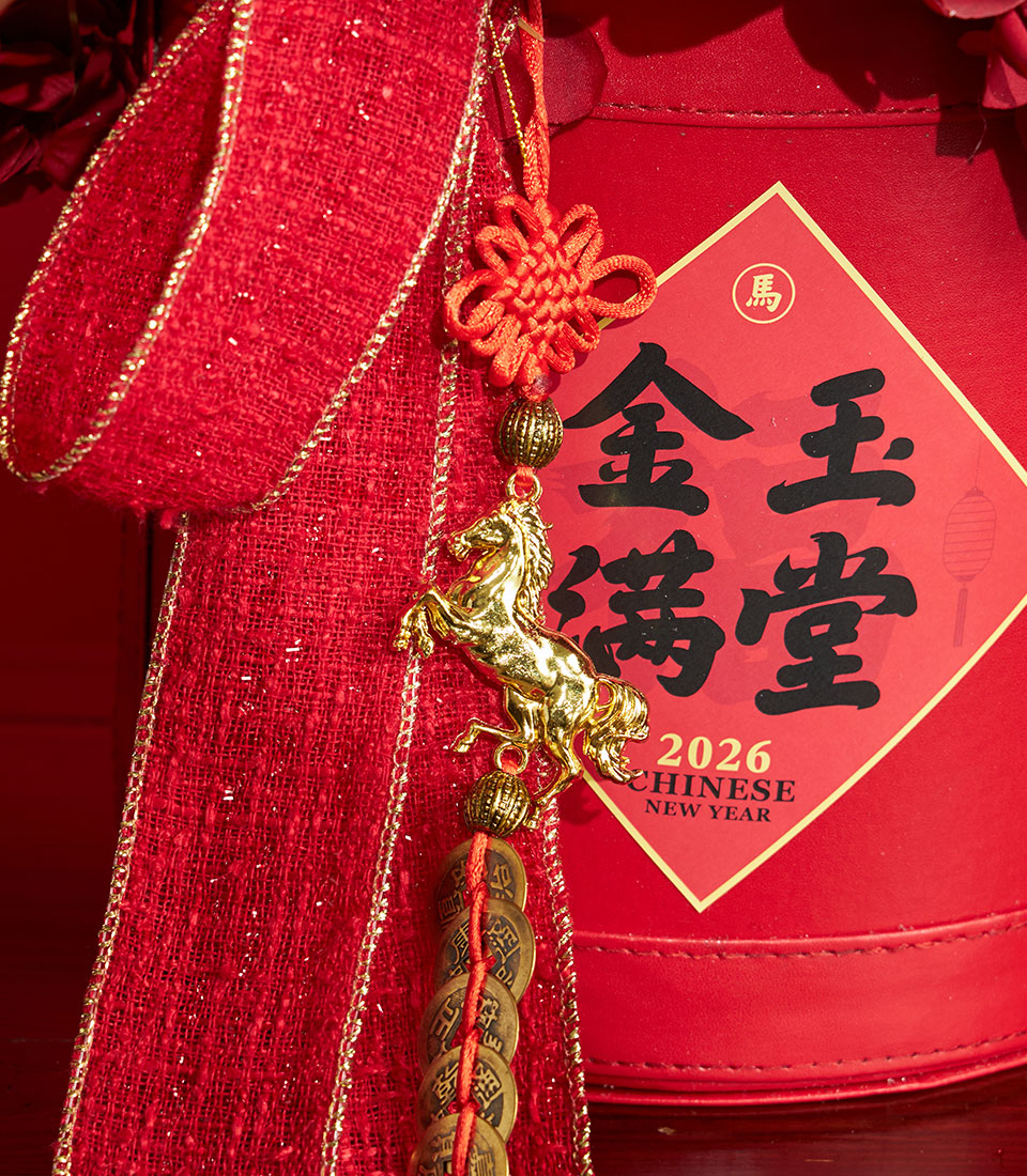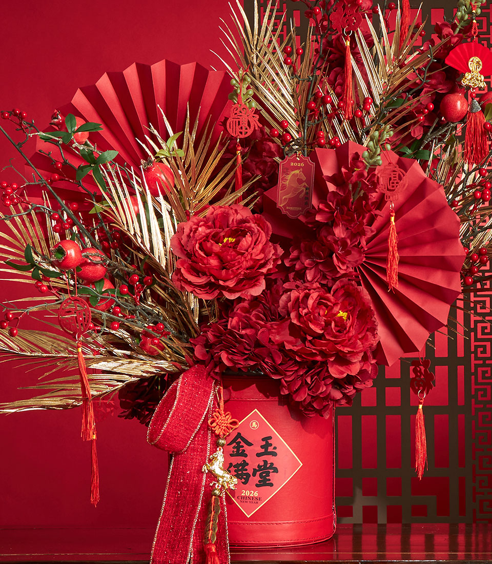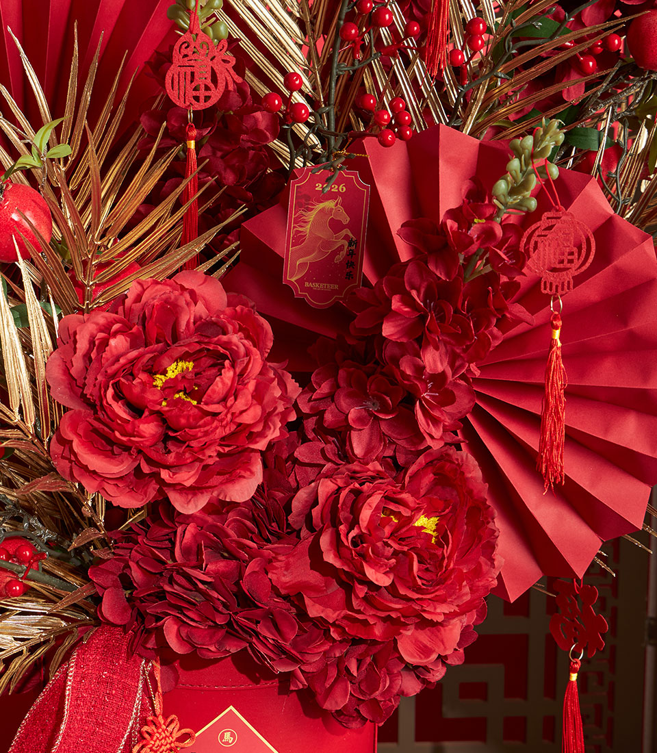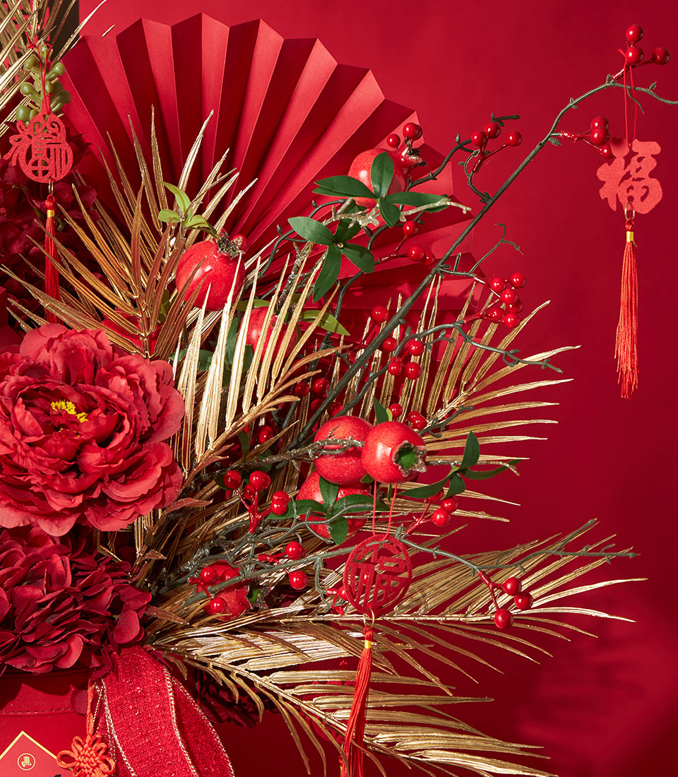 A luxurious Chinese New Year floral decoration featuring rich red artificial flowers accented with gold foliage, festive fans, and auspicious Chinese tags. Designed in a premium red container, this striking arrangement symbolises prosperity, good fortune, and joyful celebration for Lunar New Year décor.