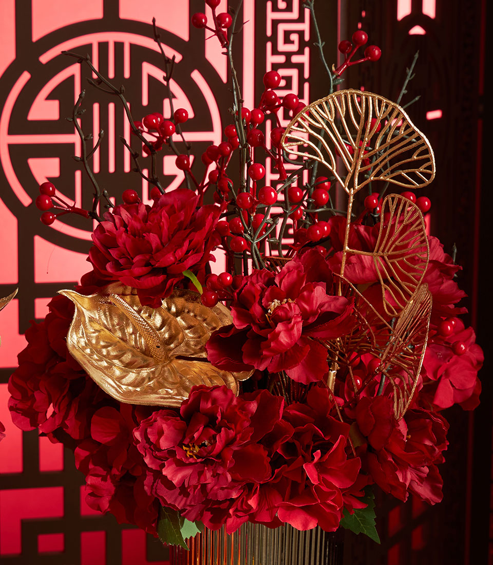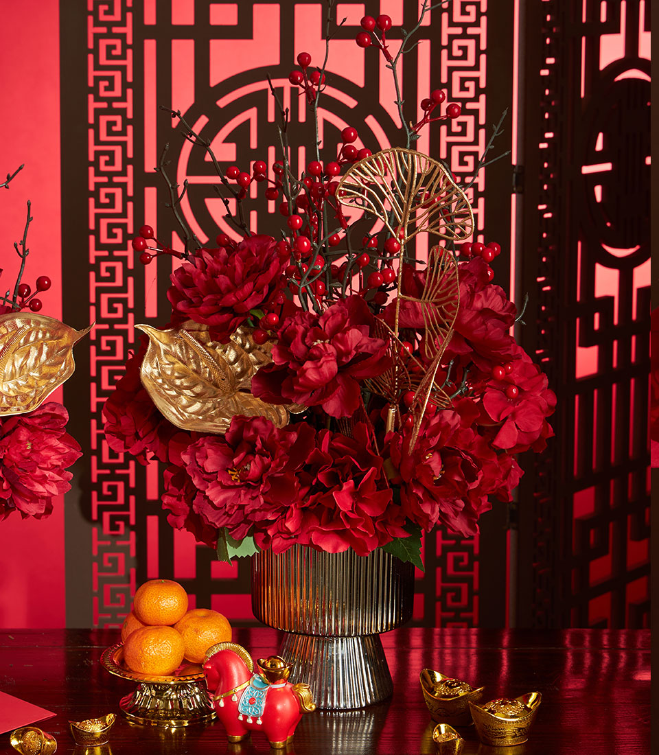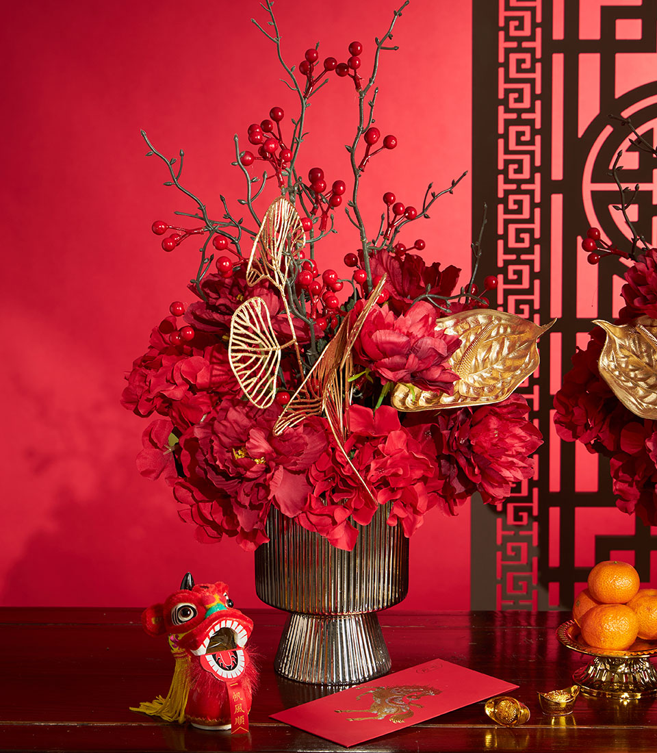 A luxurious Chinese New Year flower decoration set featuring rich red florals accented with elegant gold decorative elements, beautifully arranged in matching vases. Designed to elevate festive spaces with a bold, auspicious look symbolising prosperity, success, and celebration.