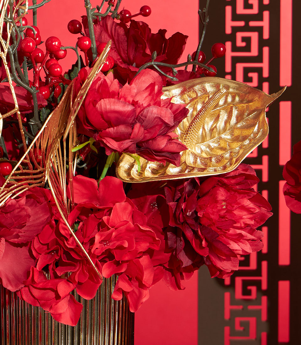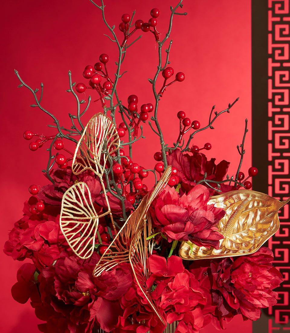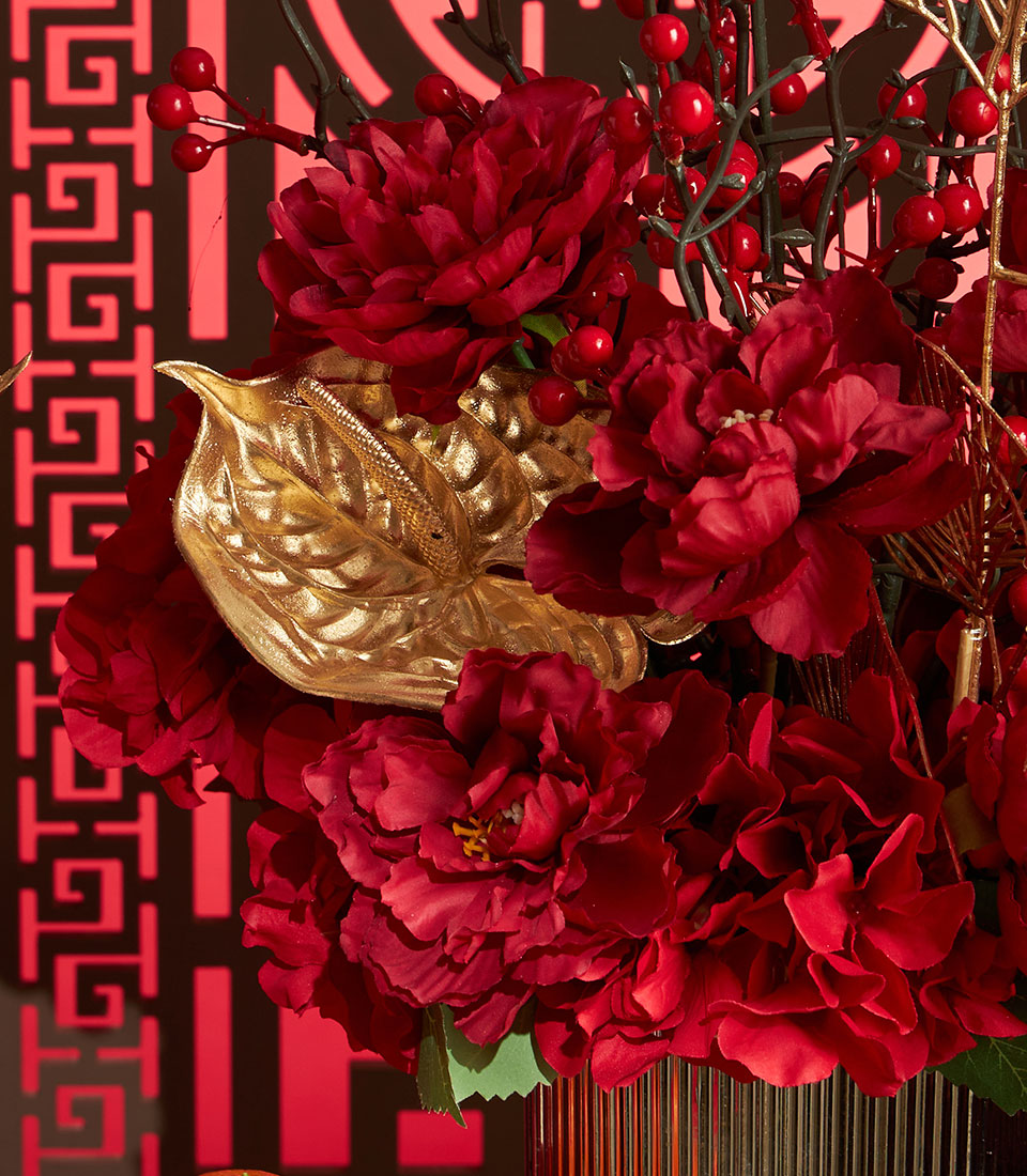 A luxurious Chinese New Year flower decoration set featuring rich red florals accented with elegant gold decorative elements, beautifully arranged in matching vases. Designed to elevate festive spaces with a bold, auspicious look symbolising prosperity, success, and celebration.