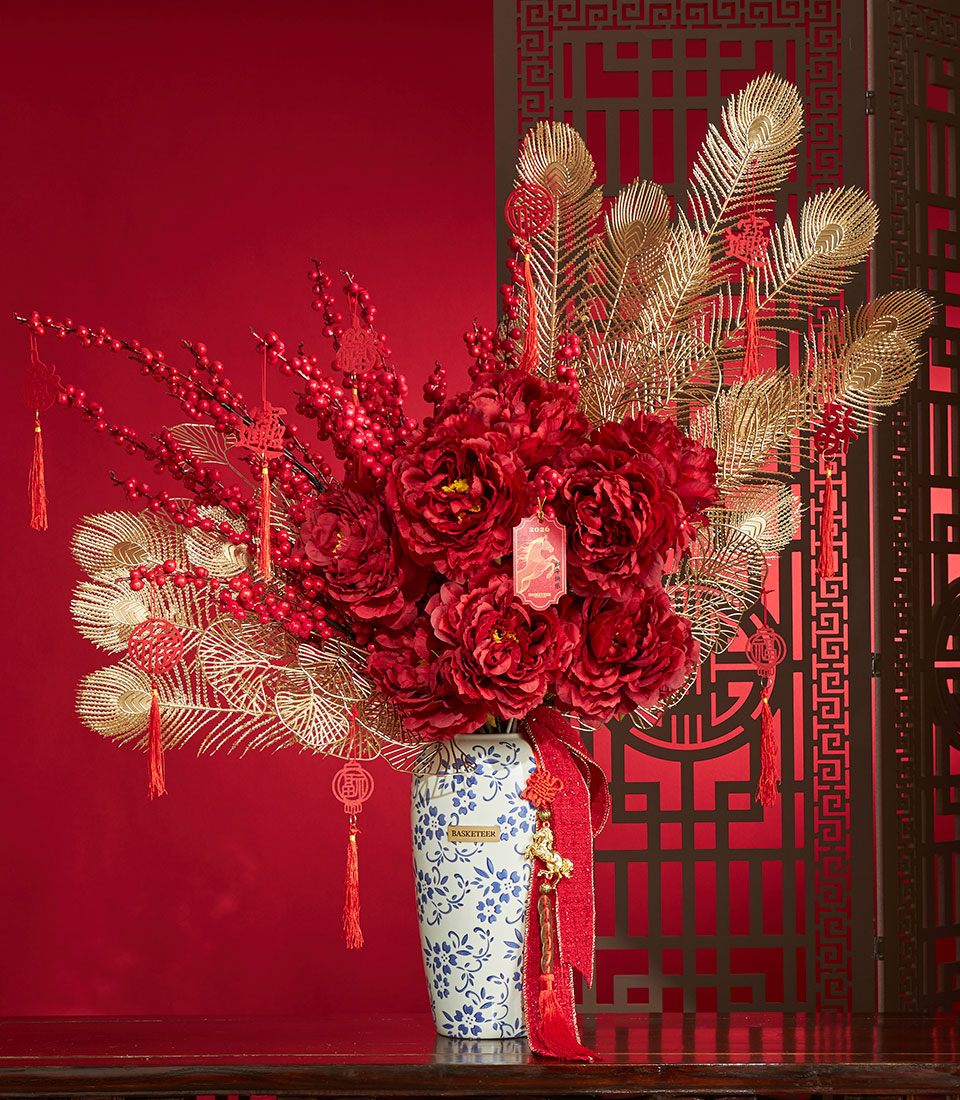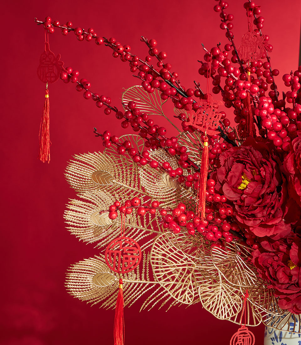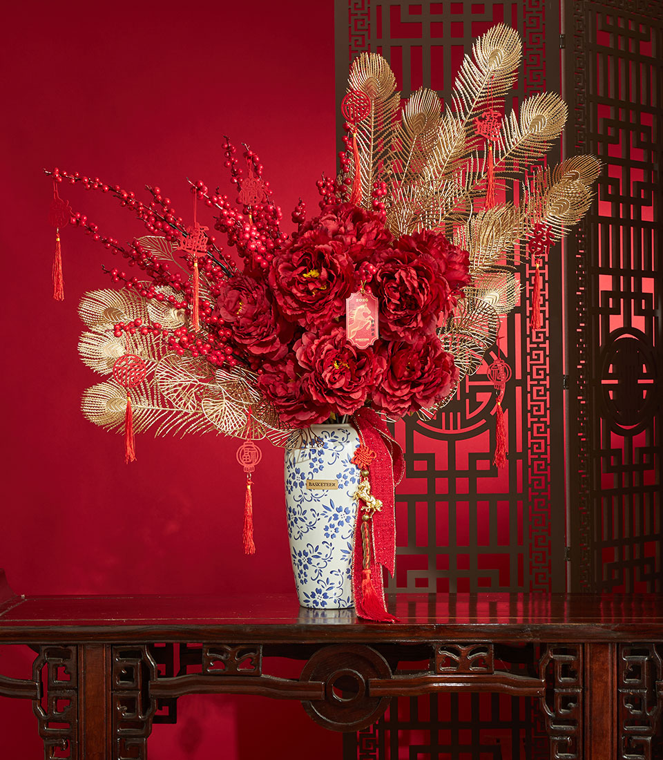 A luxurious Chinese New Year decorative arrangement featuring red artificial peonies accented with gold foliage and red berry branches, presented in a classic porcelain-style vase with festive lucky tags. Designed to bring a bold sense of prosperity, celebration, and refined elegance to Lunar New Year spaces.