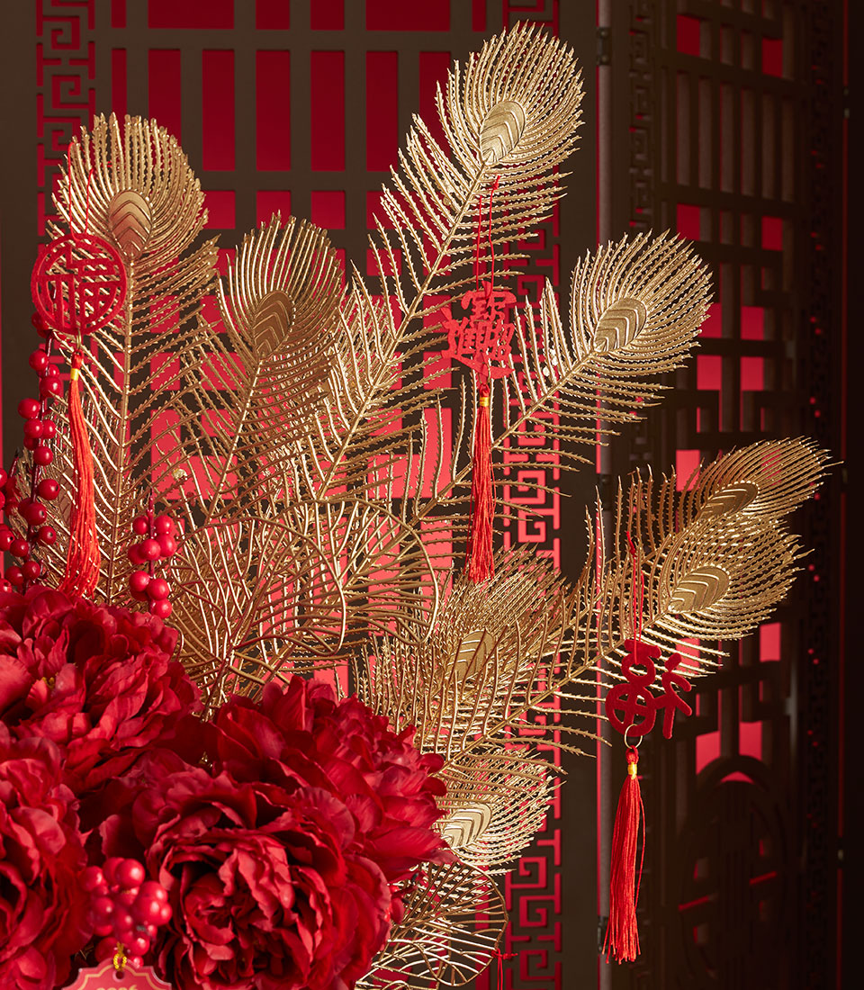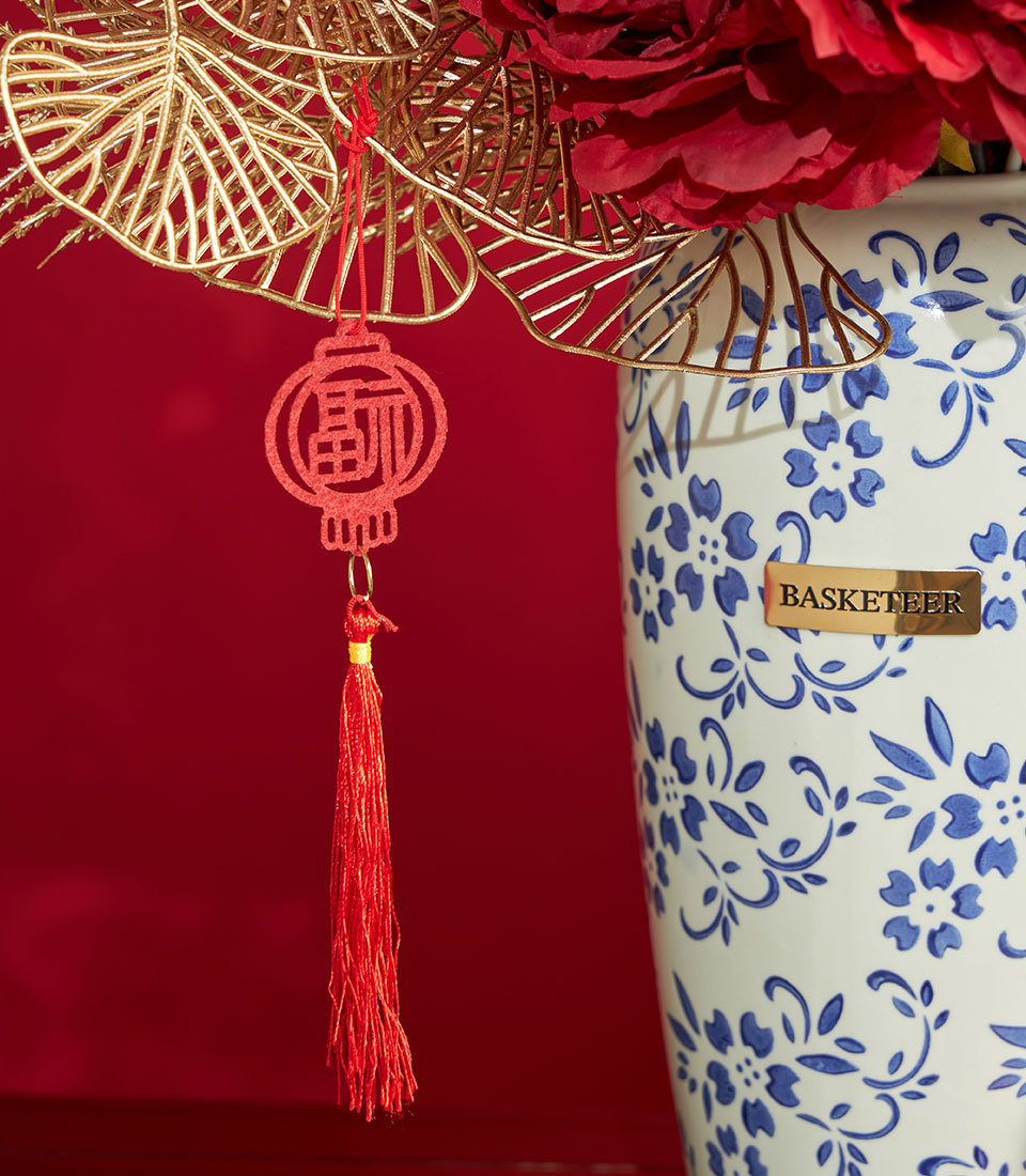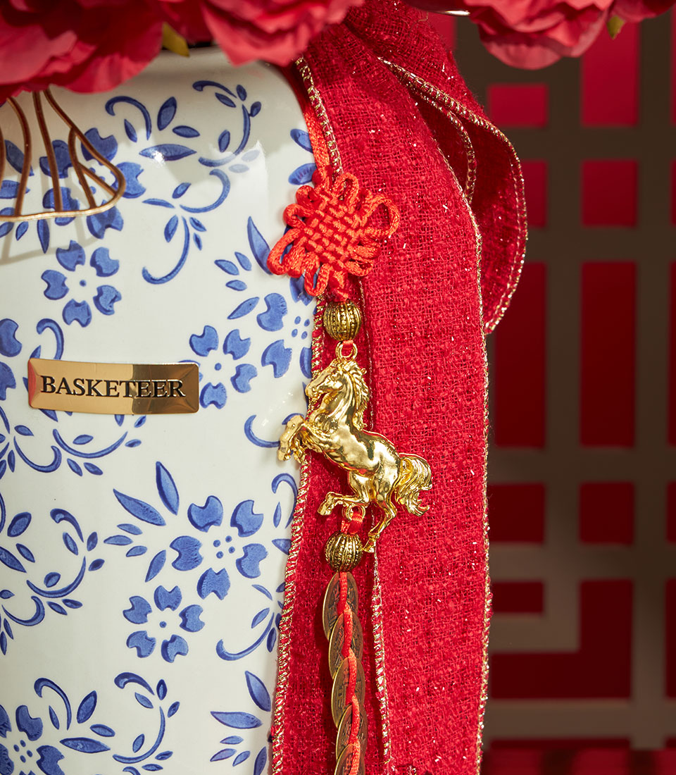 A luxurious Chinese New Year decorative arrangement featuring red artificial peonies accented with gold foliage and red berry branches, presented in a classic porcelain-style vase with festive lucky tags. Designed to bring a bold sense of prosperity, celebration, and refined elegance to Lunar New Year spaces.