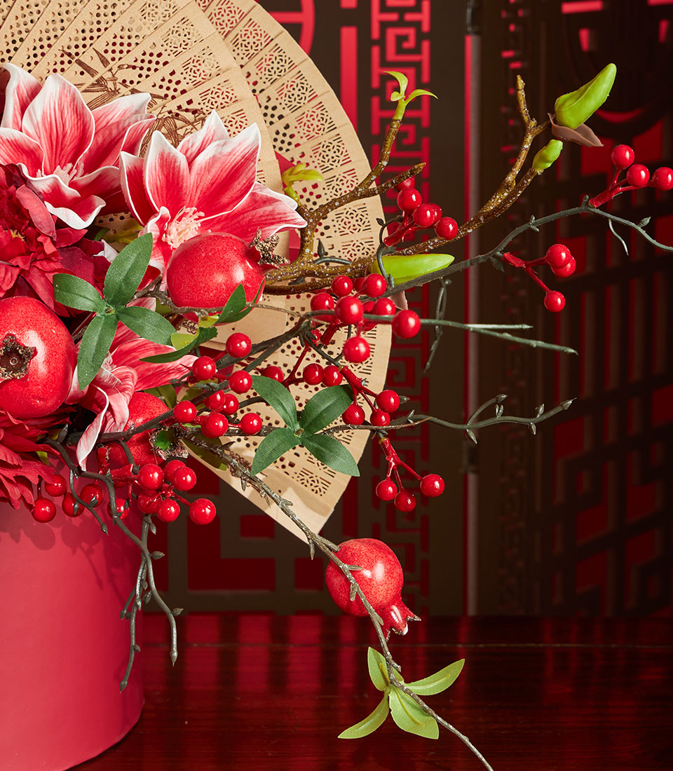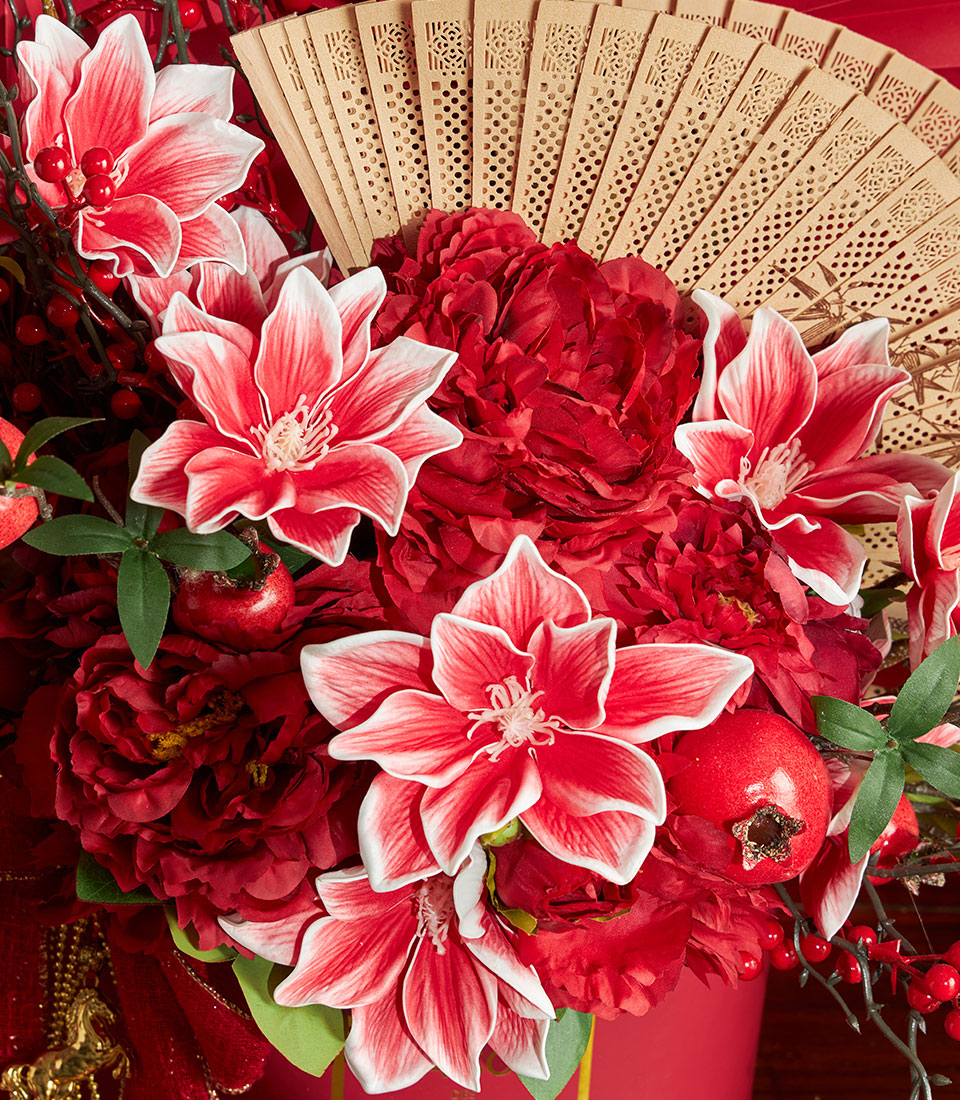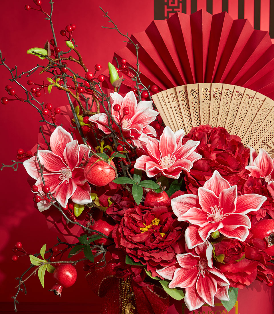 A striking Chinese New Year floral decoration styled in rich red tones, featuring golden artificial flowers, vibrant blooms, and a traditional bamboo fan accent. This bold and elegant arrangement creates a strong festive presence, symbolising prosperity, celebration, and auspicious energy.