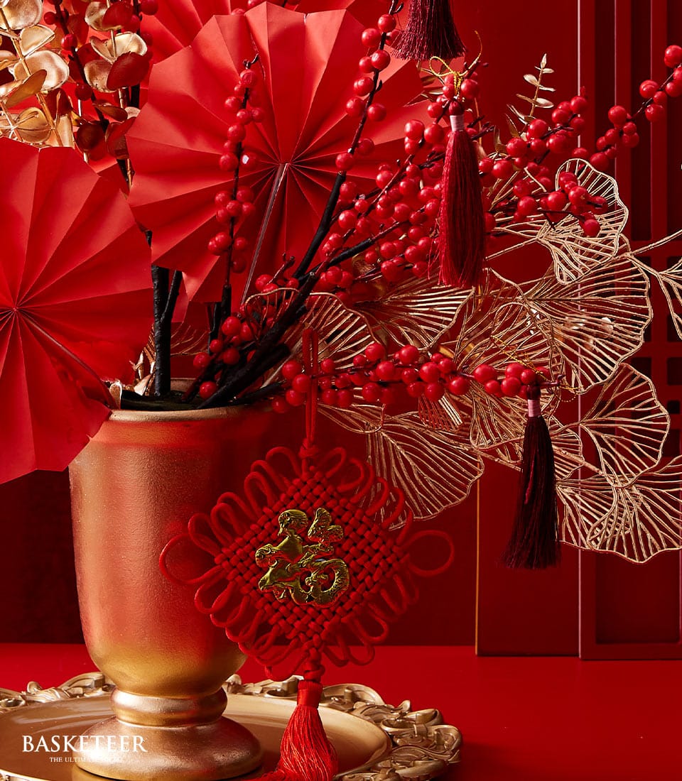 Lunar New Year Arrangement Vase Celebrate the Lunar New Year with a striking arrangement featuring bold red accents, golden foliage, and festive tassels. Designed in a gleaming golden vase, this elegant display exudes prosperity and joy, making it perfect for gifting or festive décor.