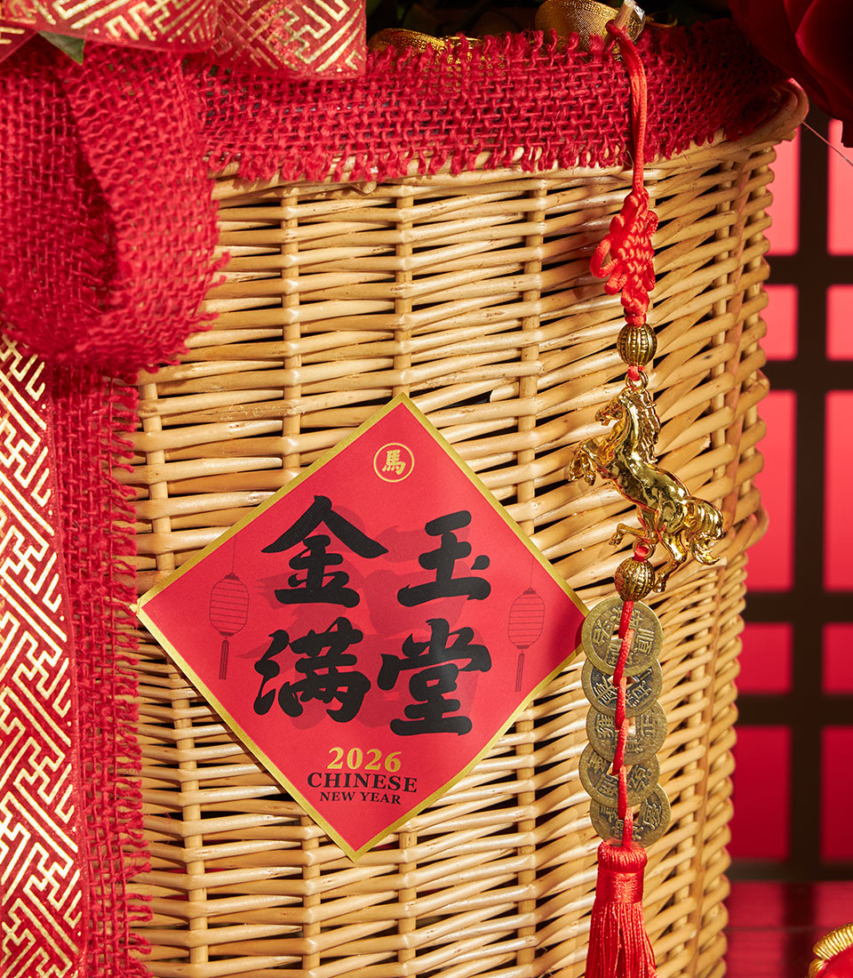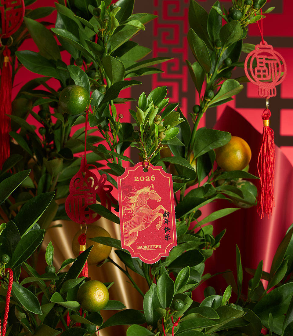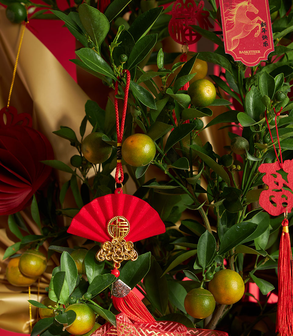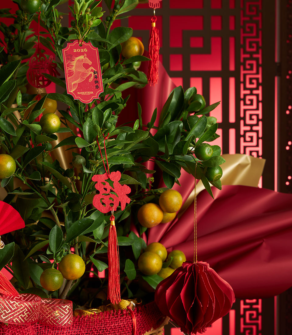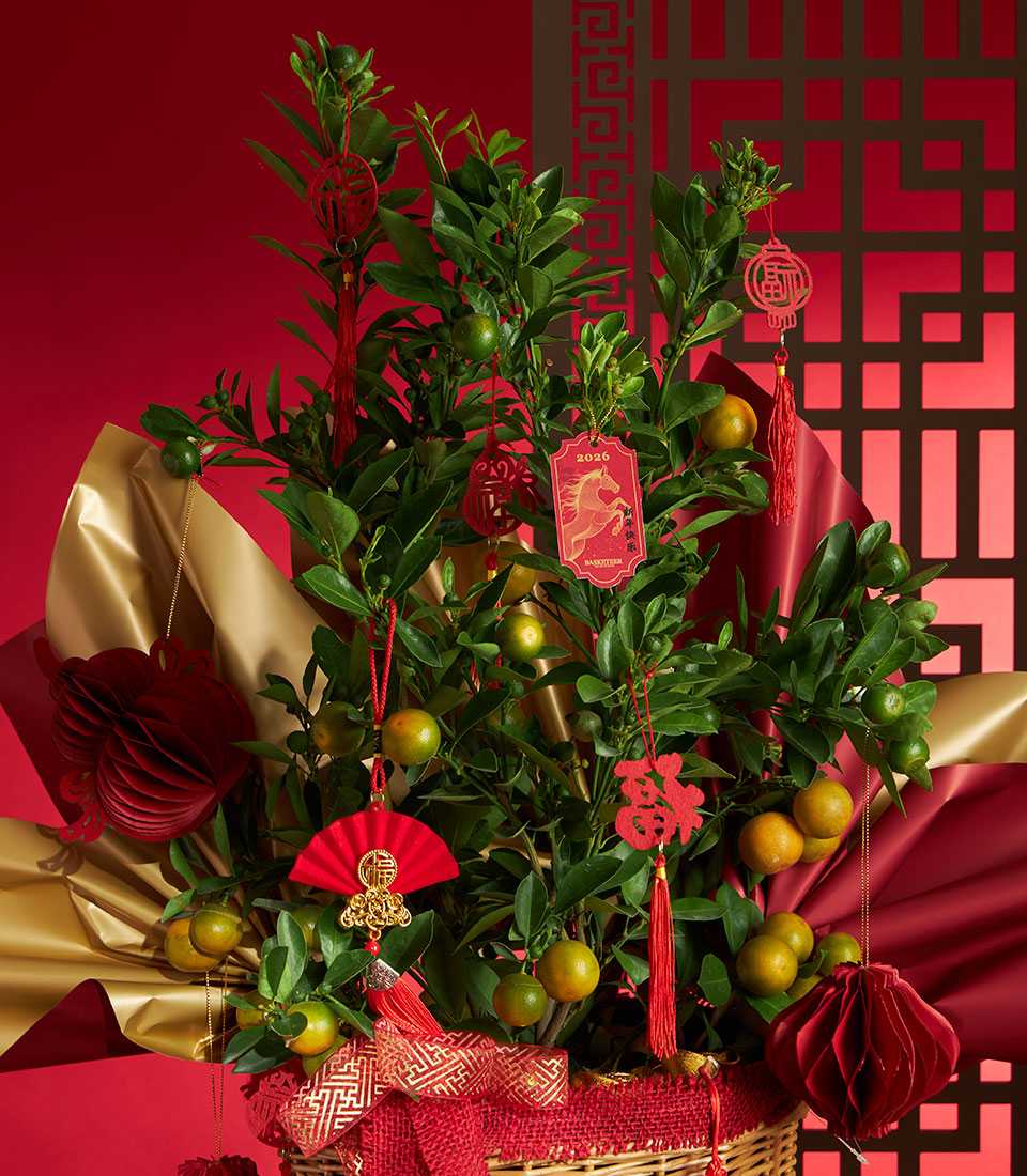 A festive Chinese New Year kumquat tree presented in a traditional woven basket, adorned with red and gold lucky decorations. A classic auspicious gift symbolising wealth, growth, and long-lasting prosperity for the New Year.