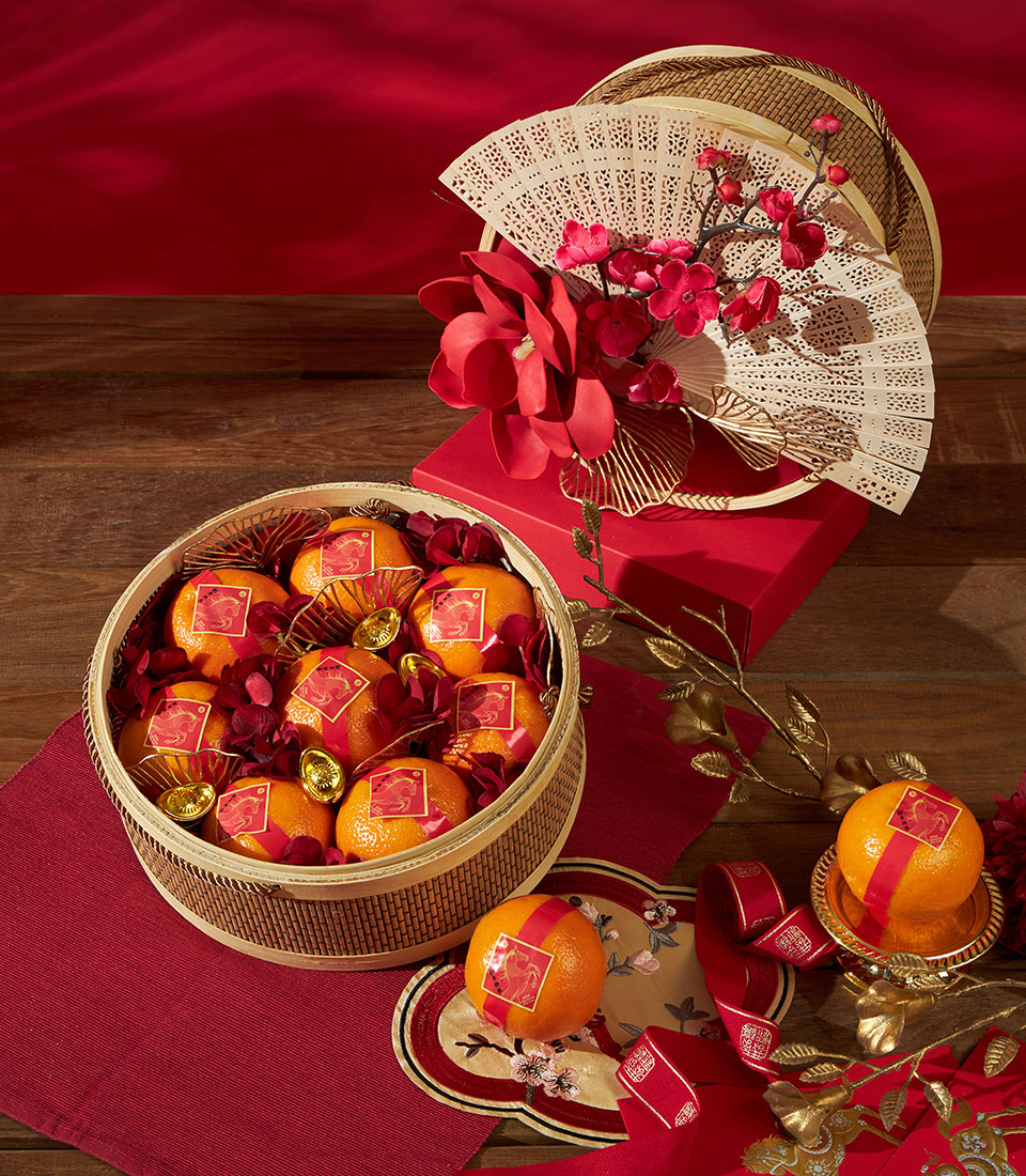 An auspicious Chinese New Year basket showcasing premium imported Taiwanese mandarins, symbolising prosperity and good fortune.