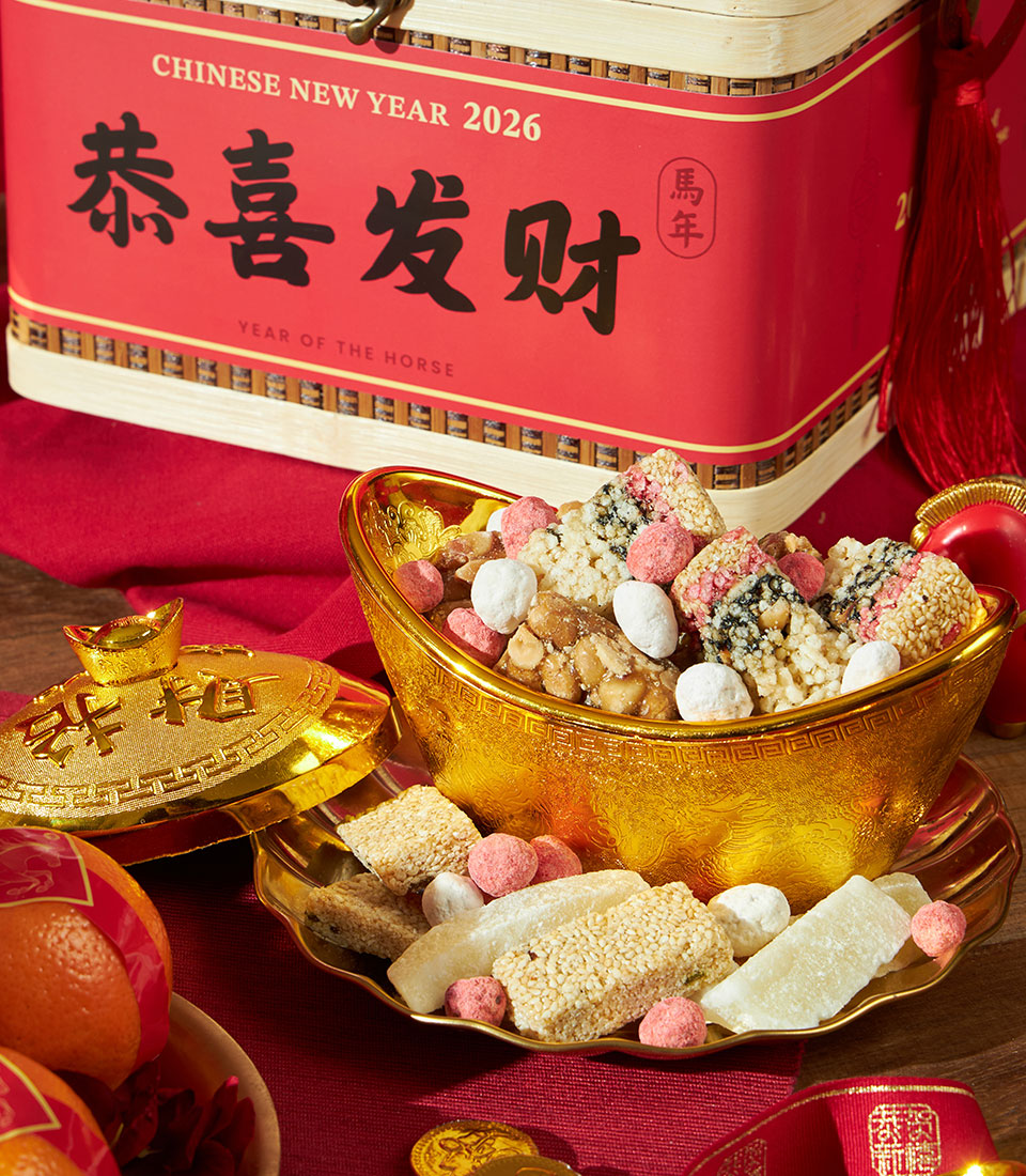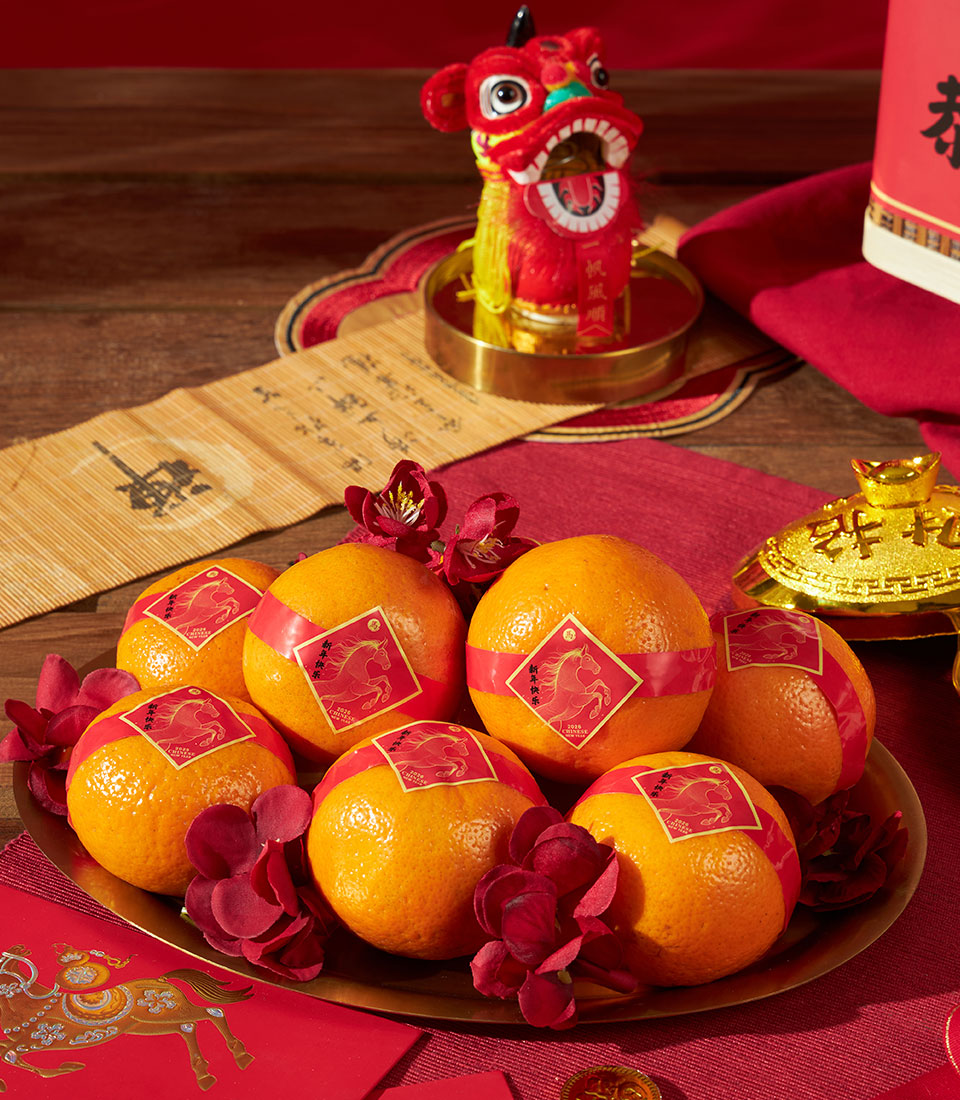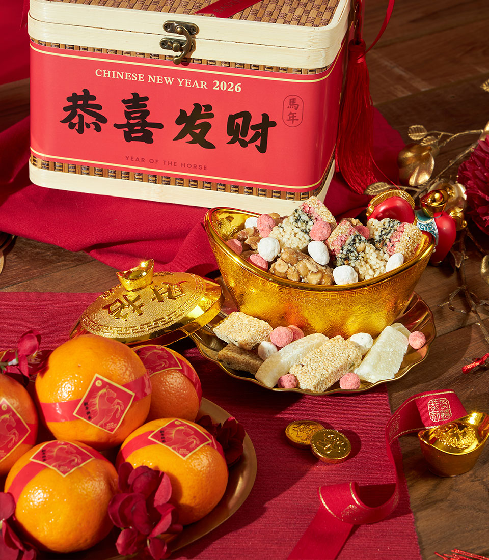 Chinese New Year gift set with imported Taiwanese mandarin oranges and assorted Chinese festive sweets in an elegant presentation.