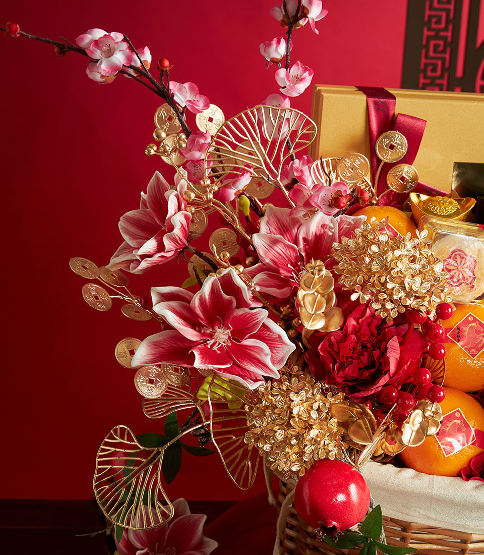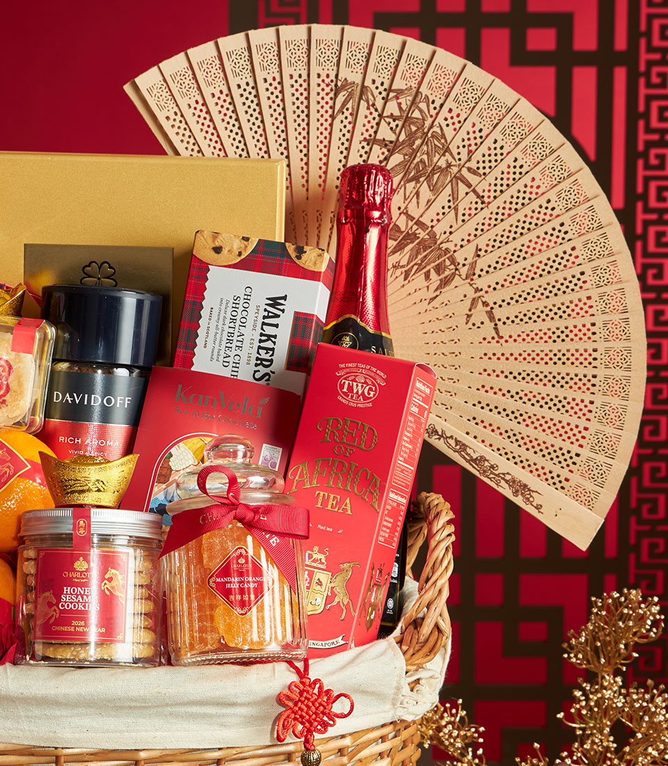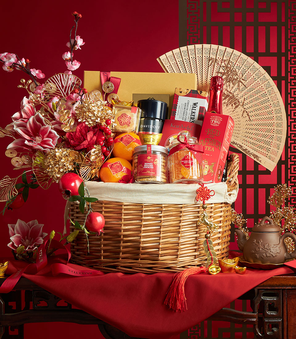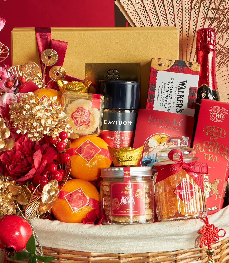 An indulgent Chinese New Year gift basket with imported mandarin oranges and premium gourmet snacks.