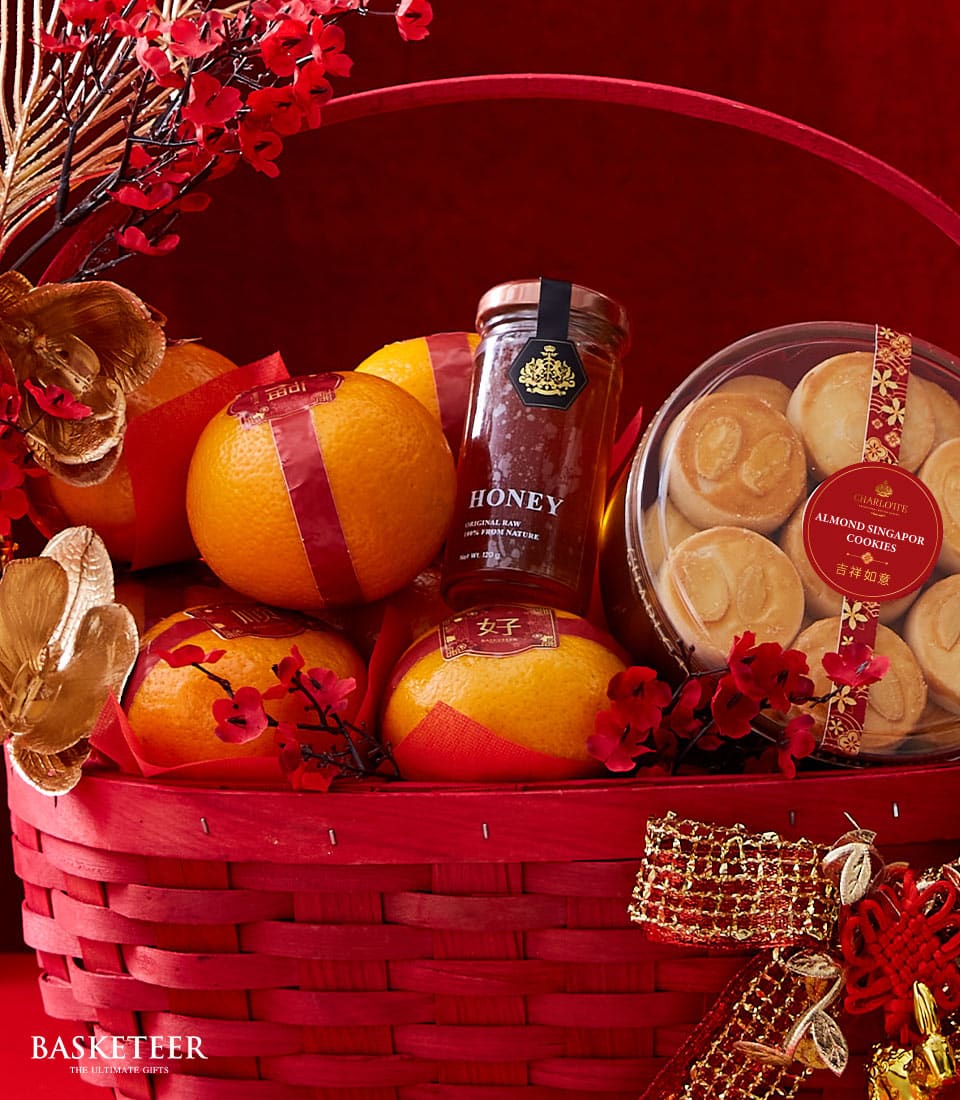 Elegant red basket featuring fresh oranges, honey, and cookies, perfect for sharing blessings of health, wealth, and sweetness this Lunar New Year.