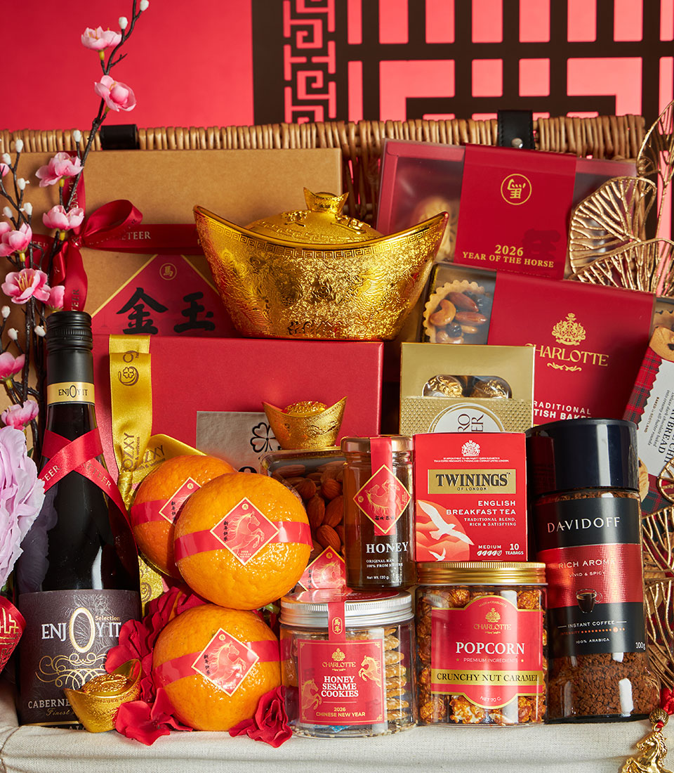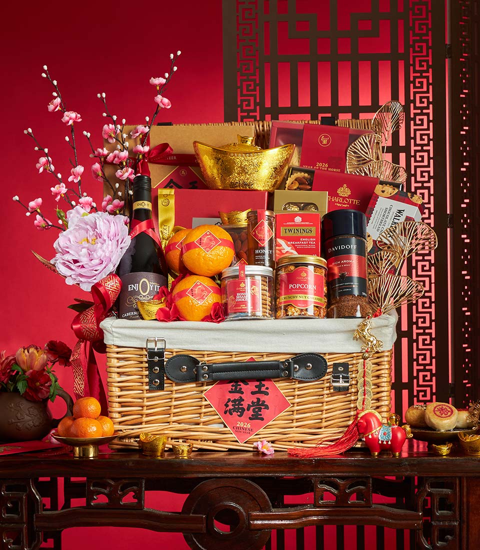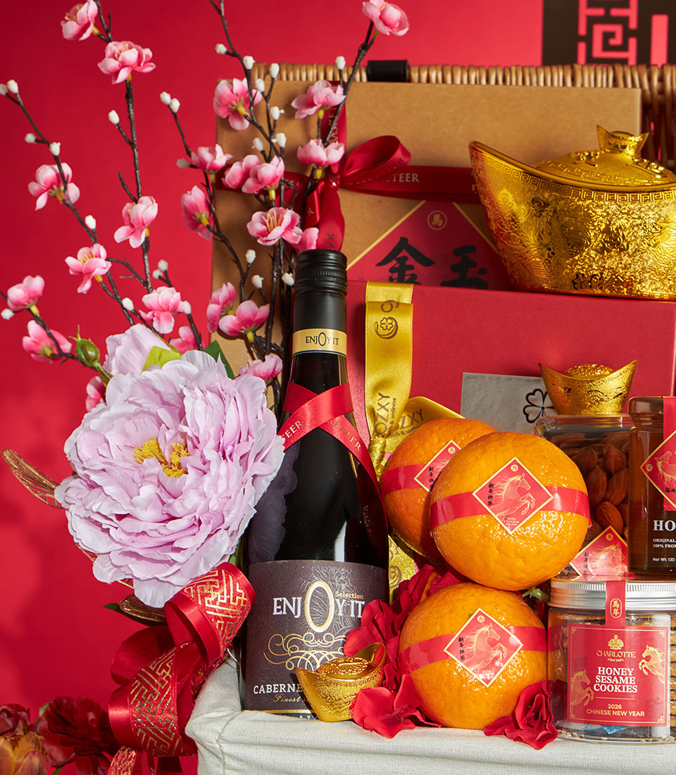 A refined Chinese New Year gift basket curated with premium gourmet snacks, artisanal cookies, festive pastries, premium mandarin oranges, and non-alcoholic Cabernet Sauvignon. Elegantly presented with traditional Chinese New Year décor, this basket symbolises prosperity, success, and thoughtful abundanceideal for corporate gifting, family celebrations, and premium seasonal exchanges.