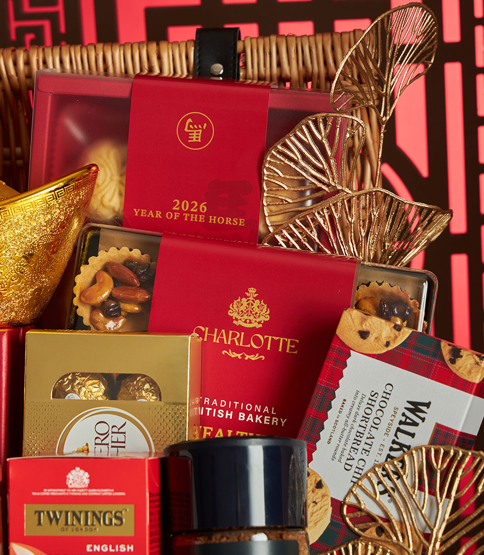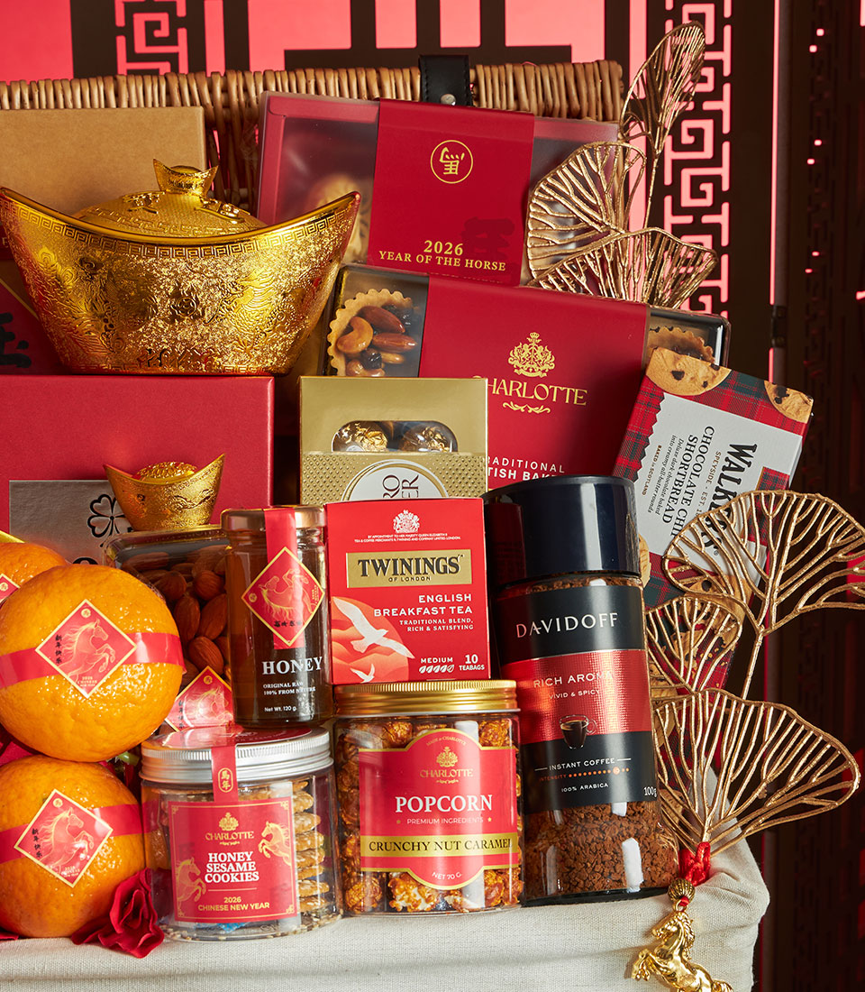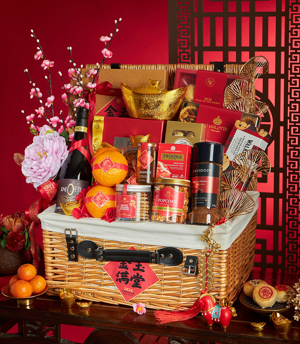 A refined Chinese New Year gift basket curated with premium gourmet snacks, artisanal cookies, festive pastries, premium mandarin oranges, and non-alcoholic Cabernet Sauvignon. Elegantly presented with traditional Chinese New Year décor, this basket symbolises prosperity, success, and thoughtful abundanceideal for corporate gifting, family celebrations, and premium seasonal exchanges.