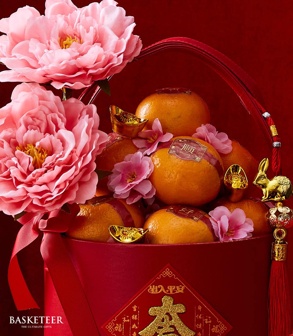 Premium Mandarin Oranges Gift Box This elegant red gift box is filled with juicy mandarins symbolizing wealth and good luck. Adorned with pink peonies and gold accents, it's a stunning centerpiece for Chinese New Year. Share the joy and blessings with loved ones through this thoughtful gift.