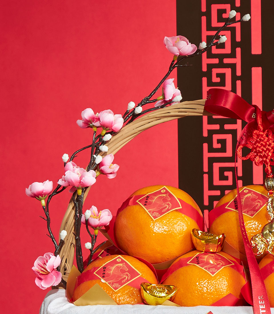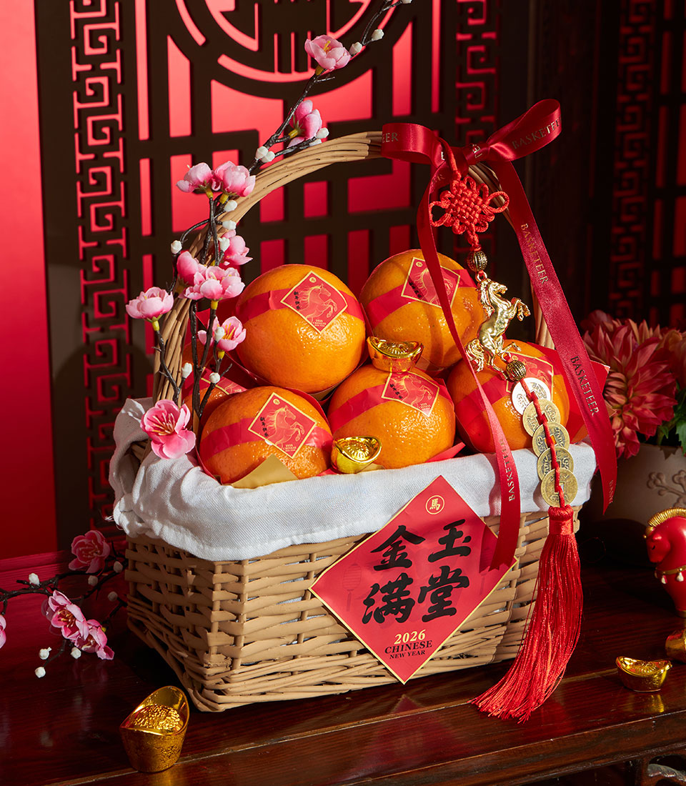 A premium Chinese New Year mandarin basket featuring carefully selected mandarin oranges, beautifully arranged in a classic woven basket and finished with elegant artificial floral decoration. Designed to represent prosperity, abundance, and auspicious New Year wishes, this basket is ideal for respectful gifting to family, elders, and valued business partners.