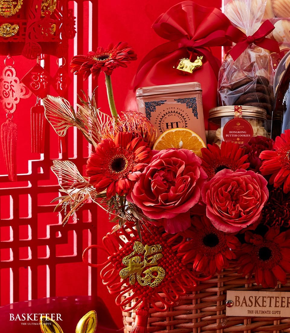 Prosperity Luxe Lunar Year Basket Celebrate the Lunar New Year with the Prosperity Luxe Celebration Hamper, featuring premium sparkling wine, rich chocolates, buttery cookies, and fresh oranges symbolizing wealth. Adorned with vibrant red flowers and traditional accents, this elegant hamper is the perfect gift for loved ones or business partners, offering a stylish touch to your festivities.