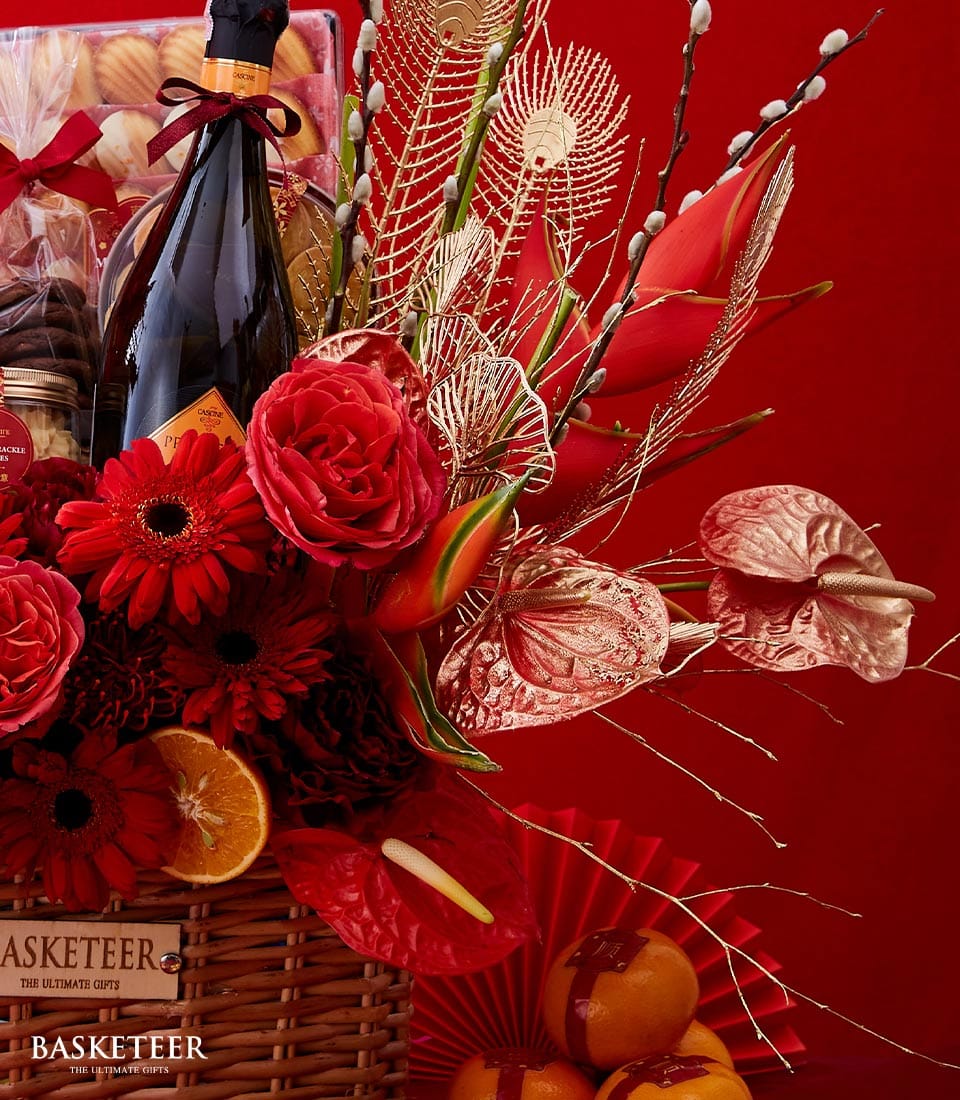 Celebrate in style with our luxurious Lunar New Year hamper, featuring sparkling wine, festive treats, and vibrant floral accents for a grand celebration.