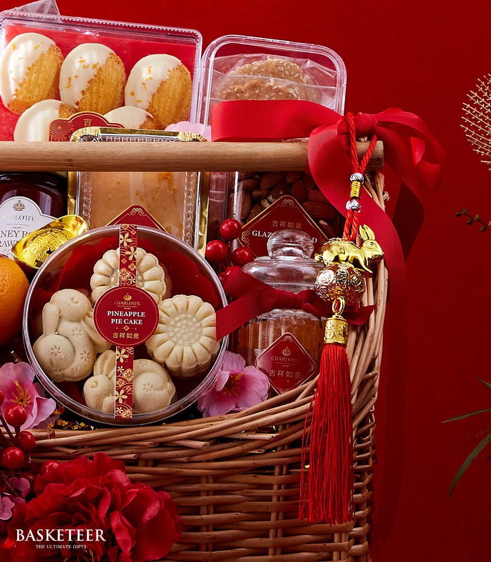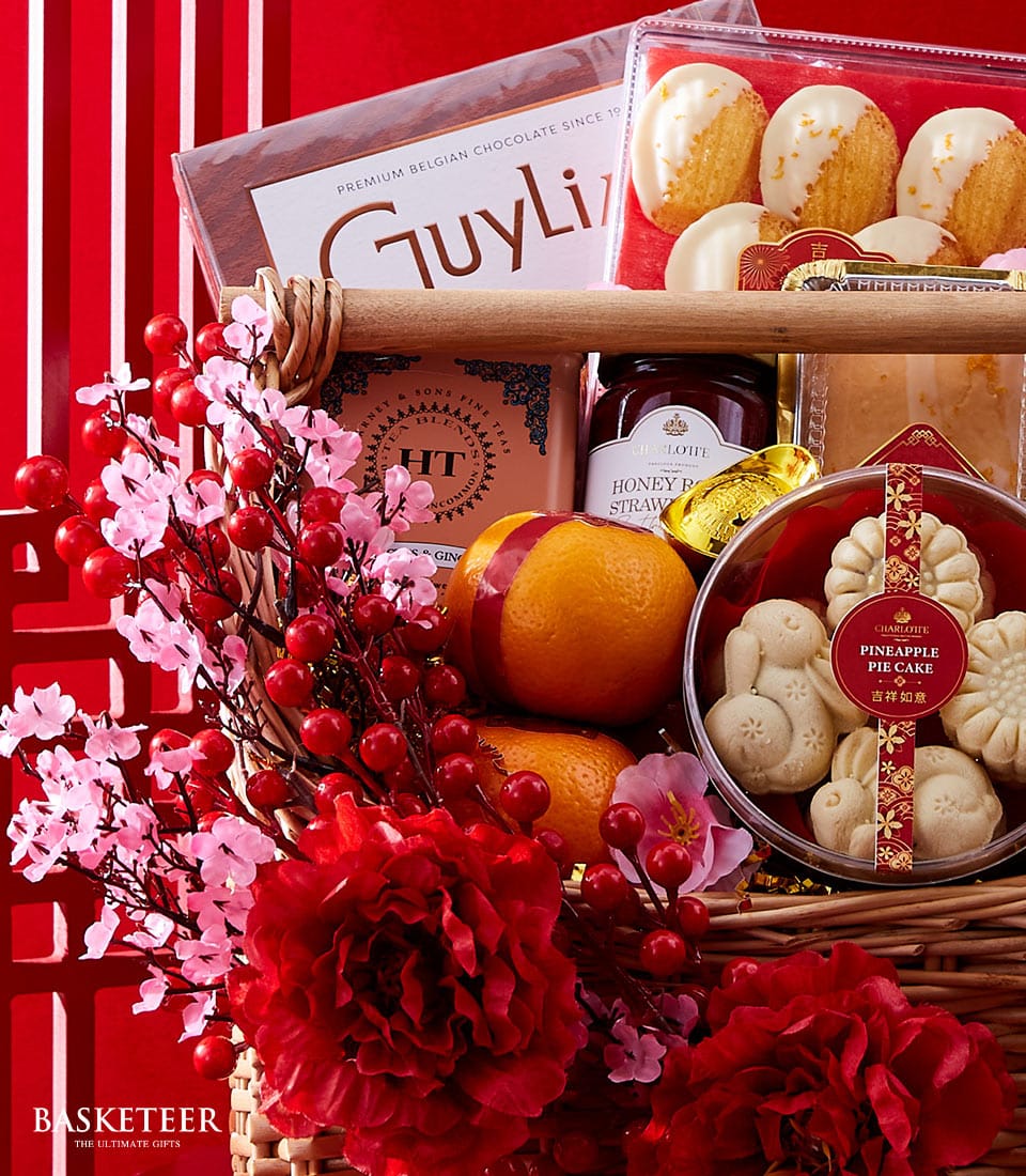 Royal Mandarin Sweets Hamper Celebrate the Lunar New Year with the Fortune Blossom Hamper, a luxurious gift filled with premium Guylian chocolates, pineapple cakes, sesame cookies, and fresh oranges. Adorned with vibrant red flowers and festive decorations, this thoughtful hamper is perfect for sharing prosperity and good fortune with family, friends, and clients.
