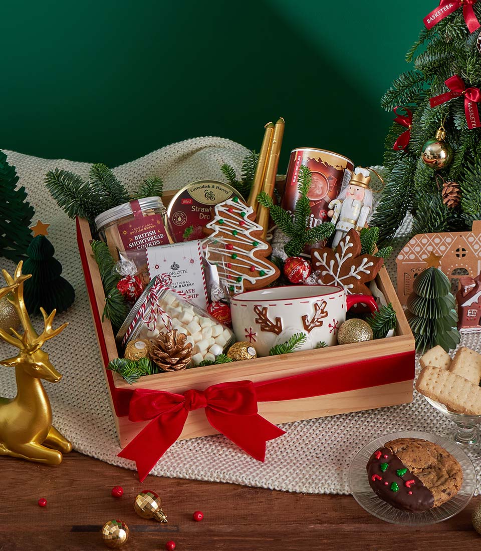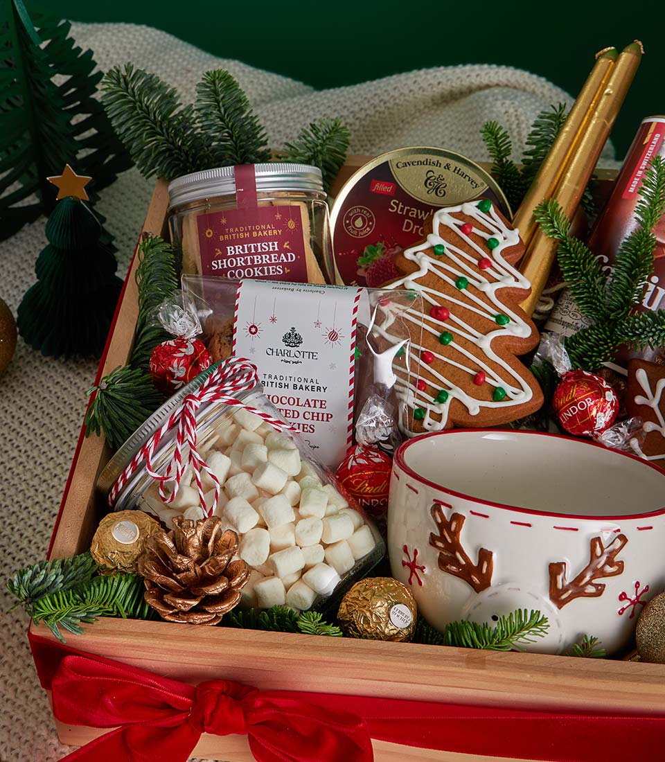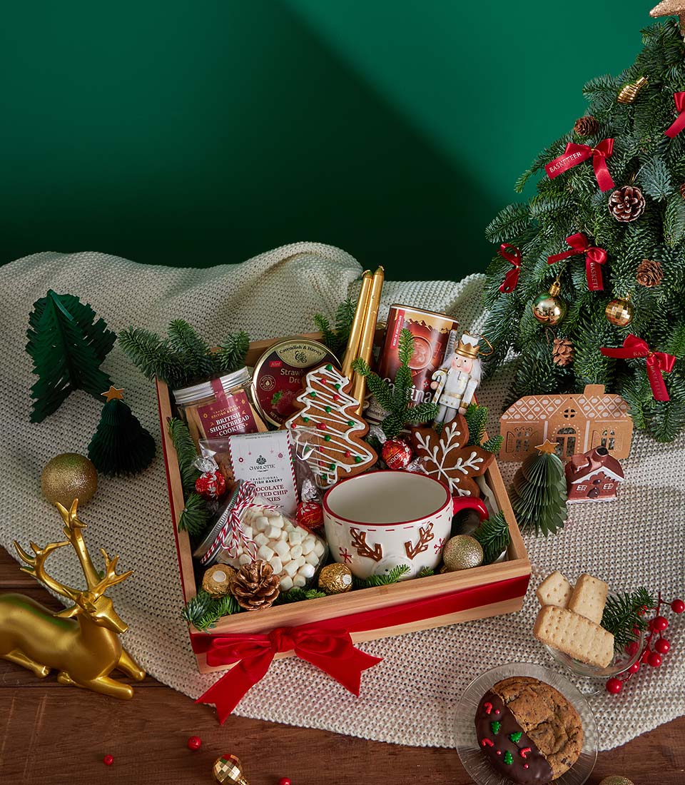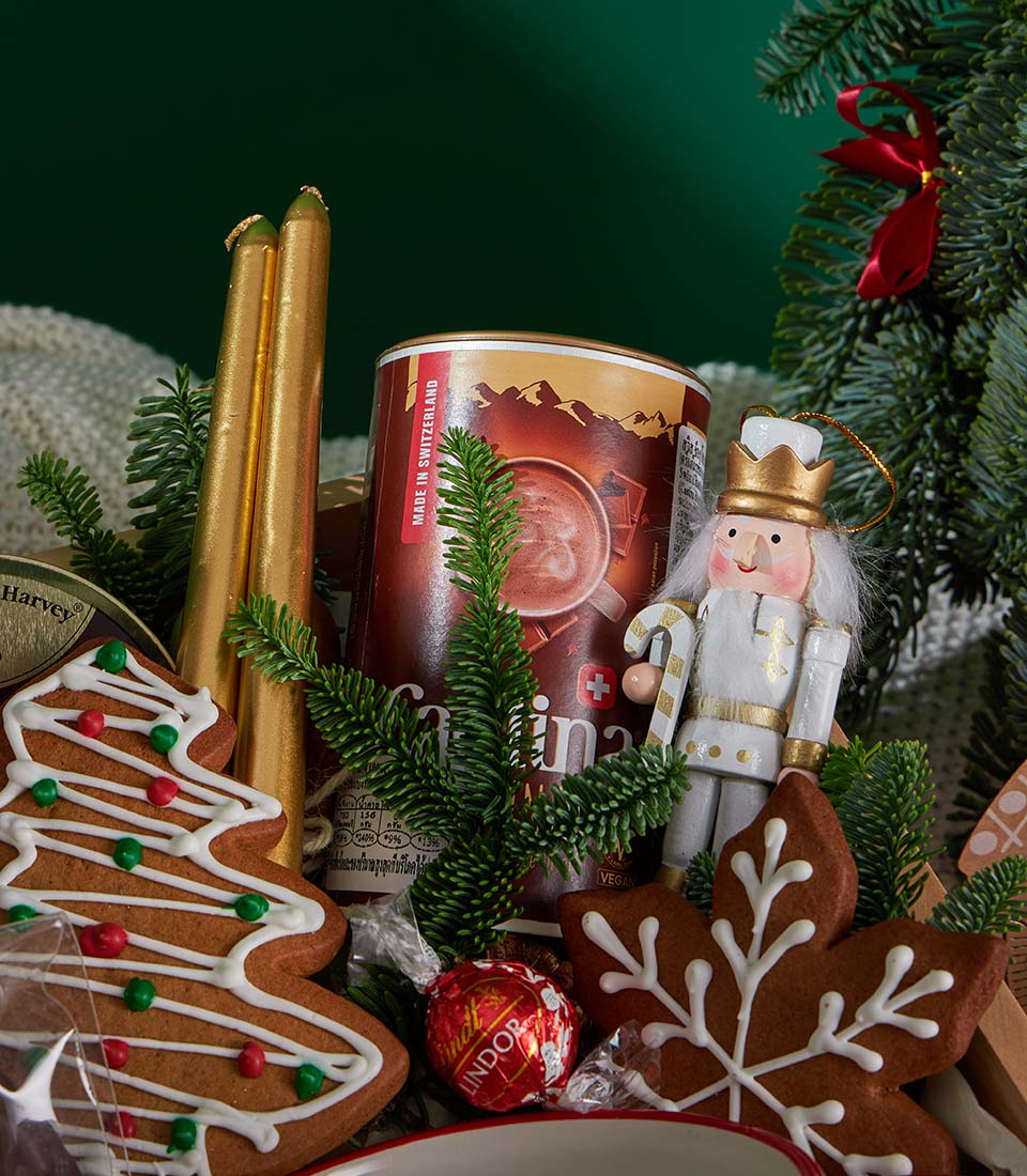 Christmas Cookies, Chocolate & Sweet Treats Gift Box Festive Comfort Edition A joyful Christmas gift box filled with rich Swiss hot chocolate, classic British shortbread, festive gingerbread cookies, premium chocolates, and sweet candy treats. Beautifully styled in a wooden tray with cosy Christmas tableware, candle accents, and seasonal décor, this set creates a warm and cheerful holiday momentperfect for thoughtful Christmas gifting in Bangkok.