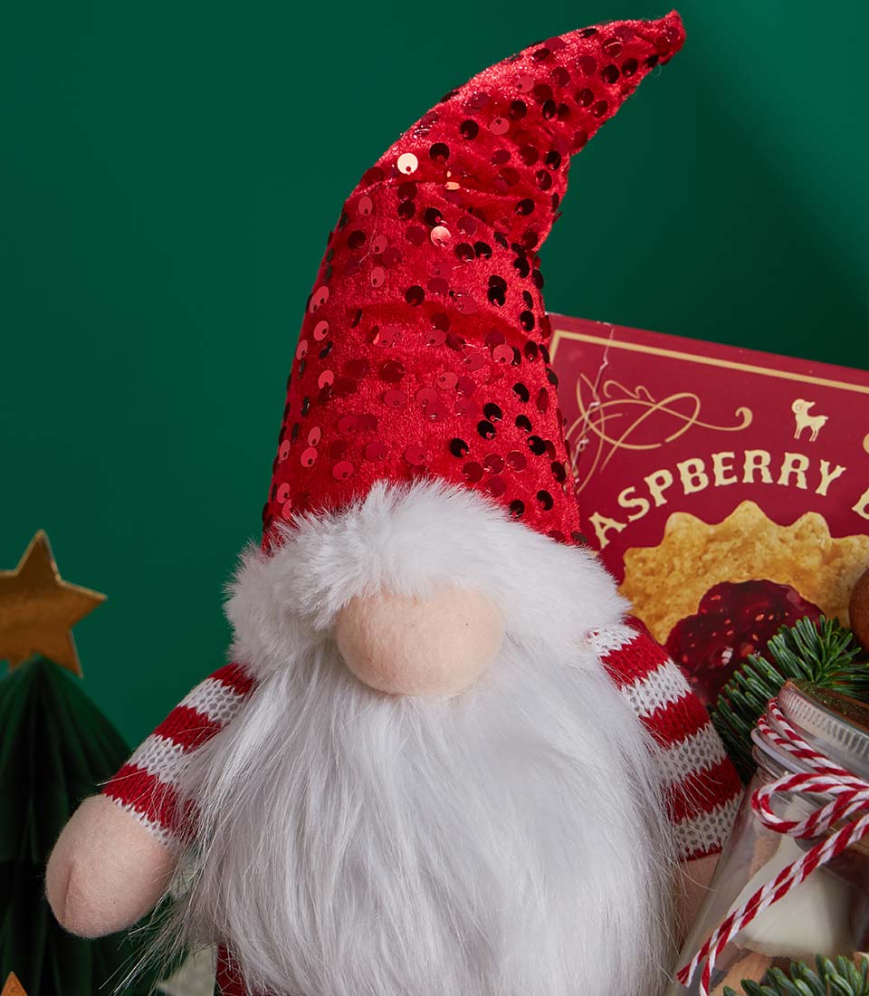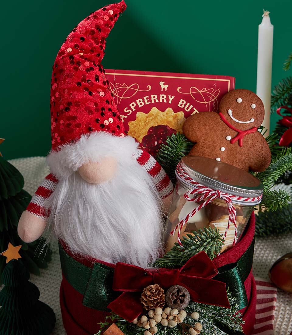 Festive Raspberry Cookie Gift Set Santa Gnome Delight Edition A sweet and cheerful Christmas gift set featuring raspberry butter cookies and Charlottes signature festive biscuits. Styled with a charming Santa gnome accent and classic Christmas details, this set is perfect for sending warm holiday wishes in a fun, heartfelt way.