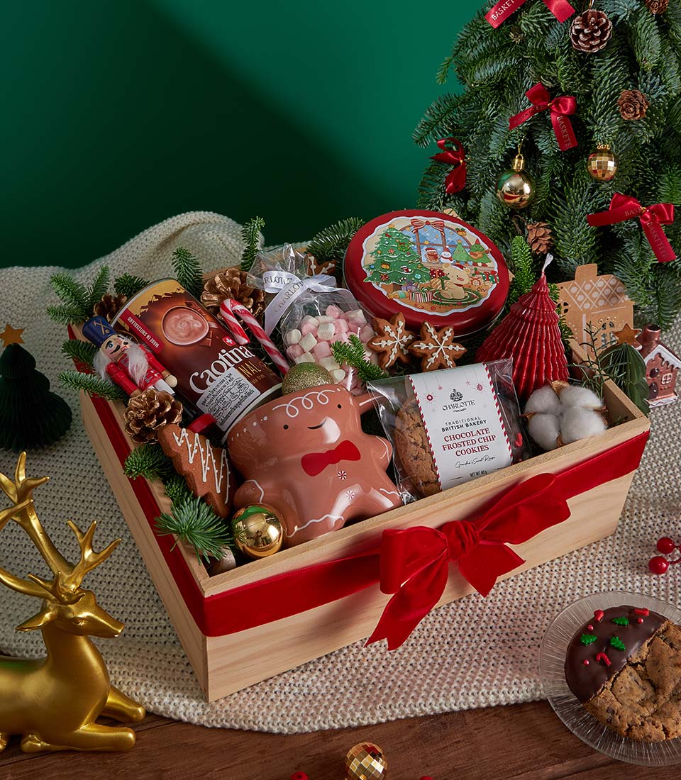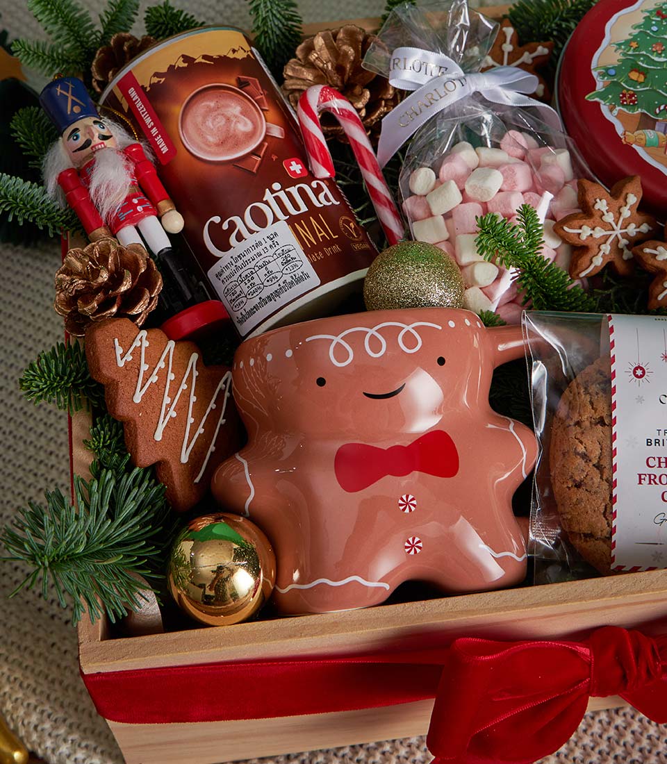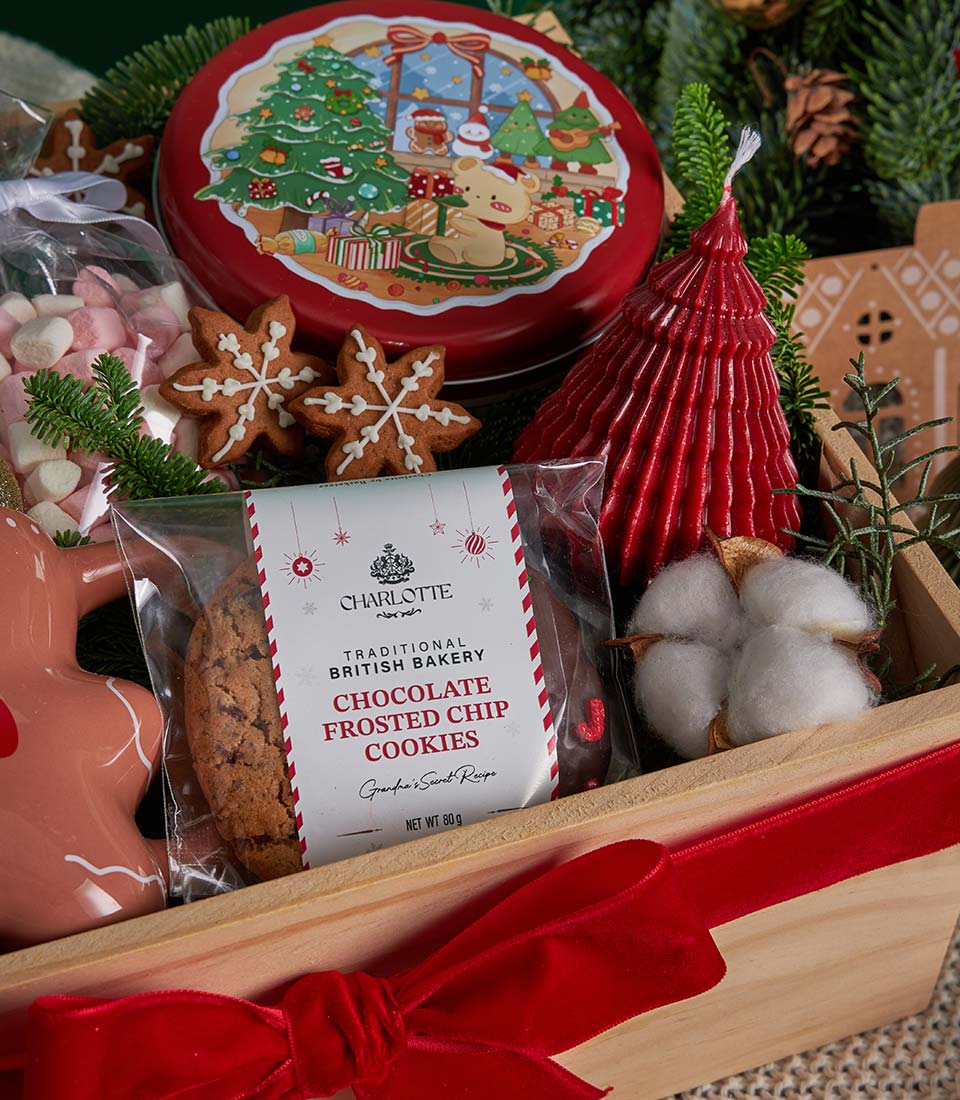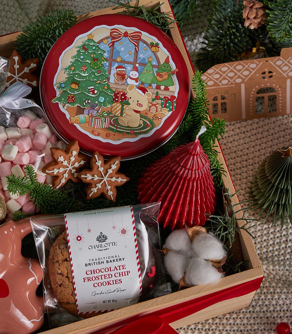 Christmas Cookies, Hot Chocolate & Candle Gift Box Cosy Holiday Comfort Edition A warm and festive Christmas gift box featuring rich Swiss hot chocolate, assorted handmade cookies from Charlotte Bakery, soft marshmallows, and charming Christmas décor. Thoughtfully arranged in a wooden tray with seasonal accents, this cosy set is perfect for heartfelt Christmas gifting and winter celebrations in Bangkok.