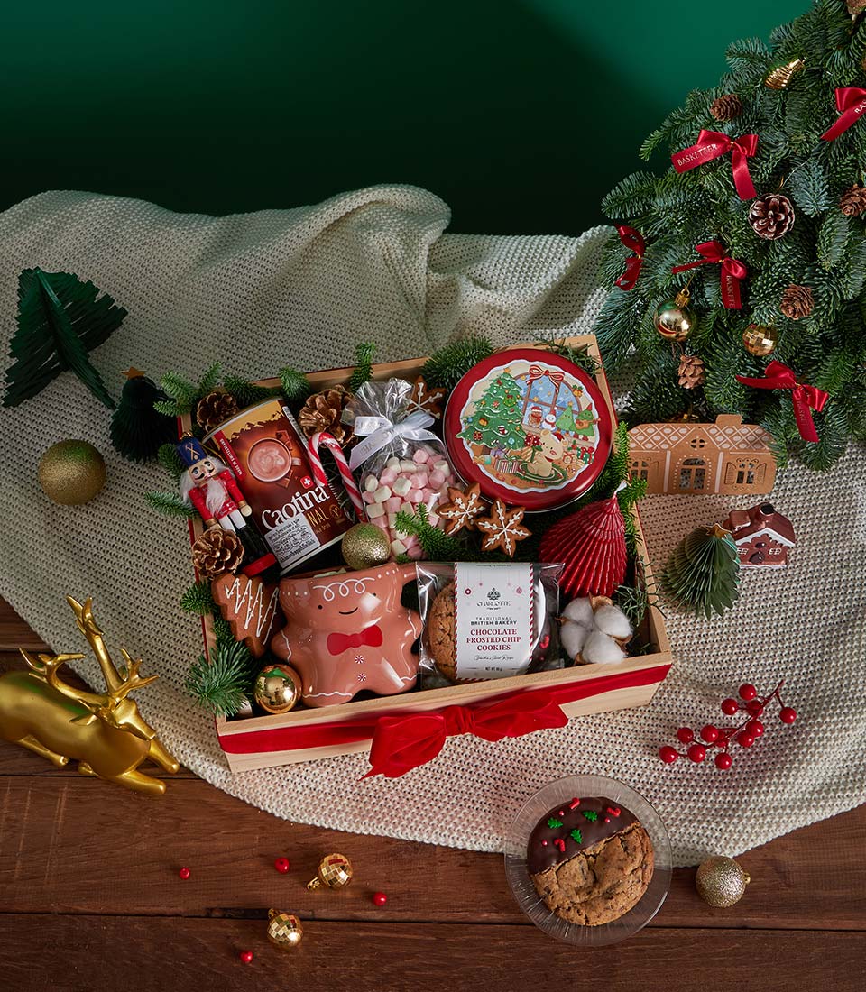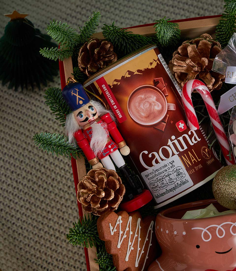 A festive Christmas gift box featuring rich Swiss hot chocolate, assorted Christmas cookies, soft marshmallows, and a cosy Christmas candle, beautifully styled with charming holiday décor and seasonal tableware. A warm and joyful Christmas gift with same-day delivery in Bangkok.