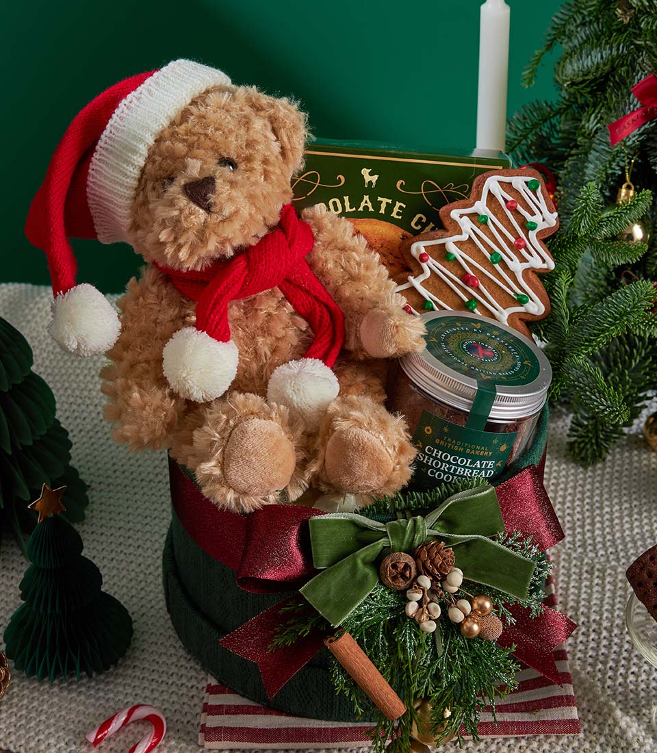 Chocolate Cookie & Teddy Gift Set Merry Little Santa Edition An adorable Christmas gift set featuring premium chocolate cookies and a festive teddy bear, beautifully styled with classic holiday accents. A warm, cute, and comforting choice for sending Christmas love to someone special.