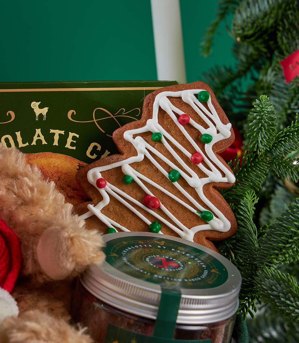 A heartwarming Christmas gift box featuring assorted festive cookies paired with a charming Santa teddy bear, beautifully styled with cosy holiday décor and seasonal accents. A joyful Christmas gift with same-day delivery in Bangkok.