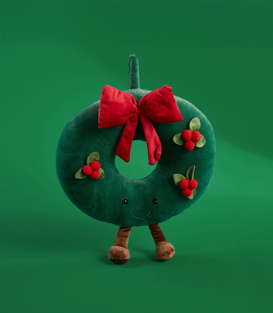 Close-up of a green plush wreath toy with a red bow, holly berry decorations, and smiling face on a green background.