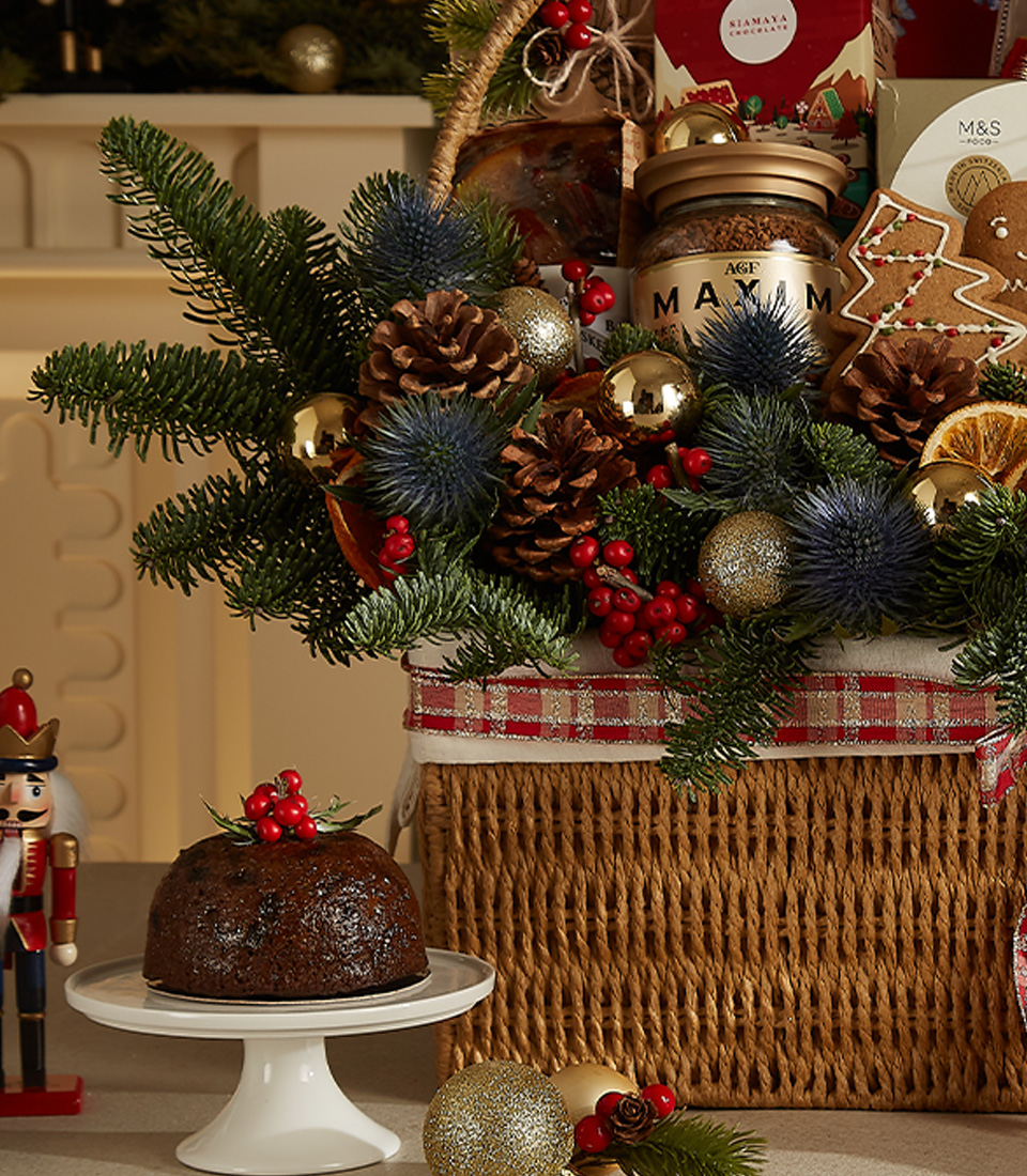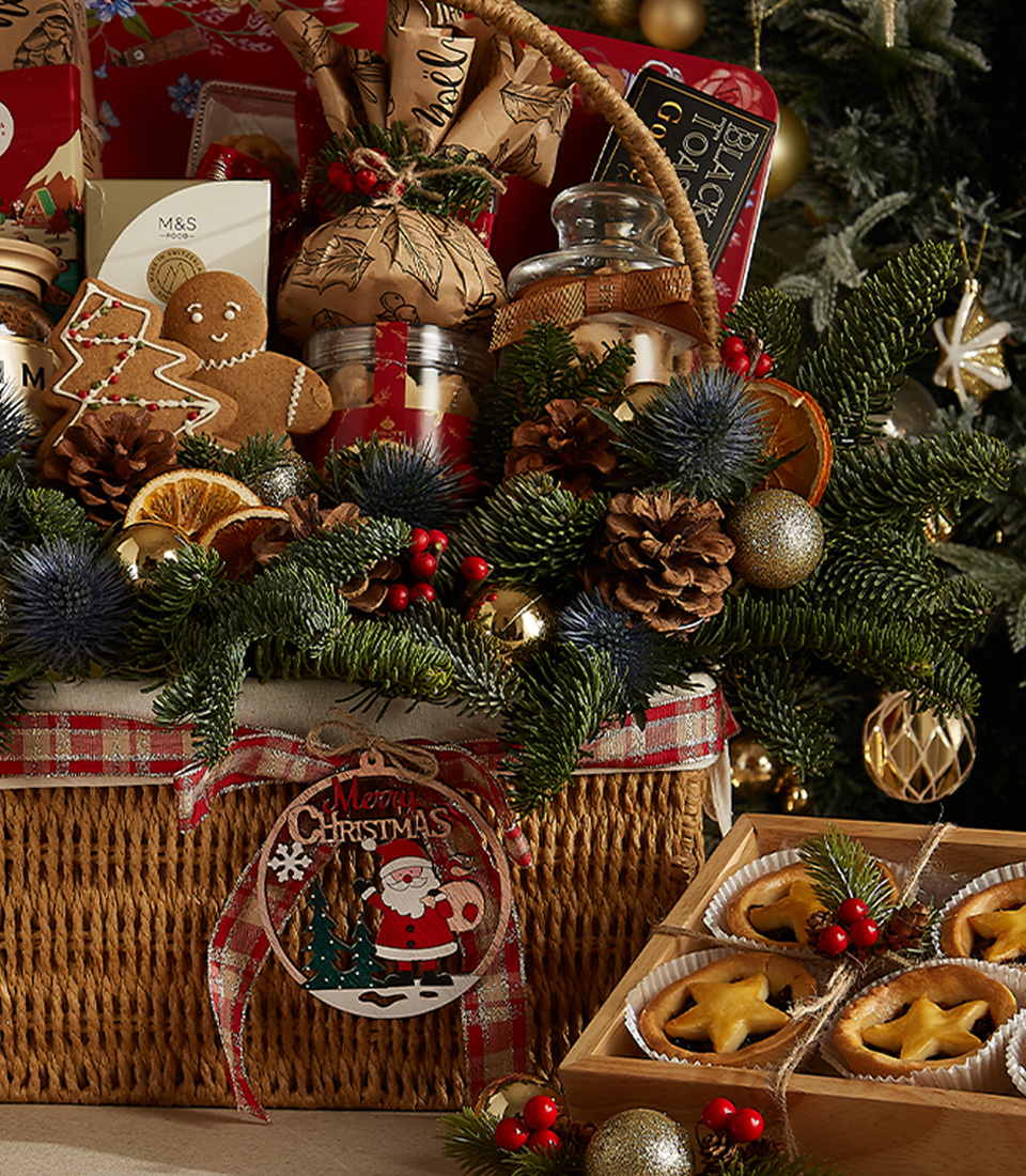 Deluxe Christmas Indulgence Hamper filled with gingerbread, chocolates, Christmas pudding, mince pies, and festive gourmet treats.