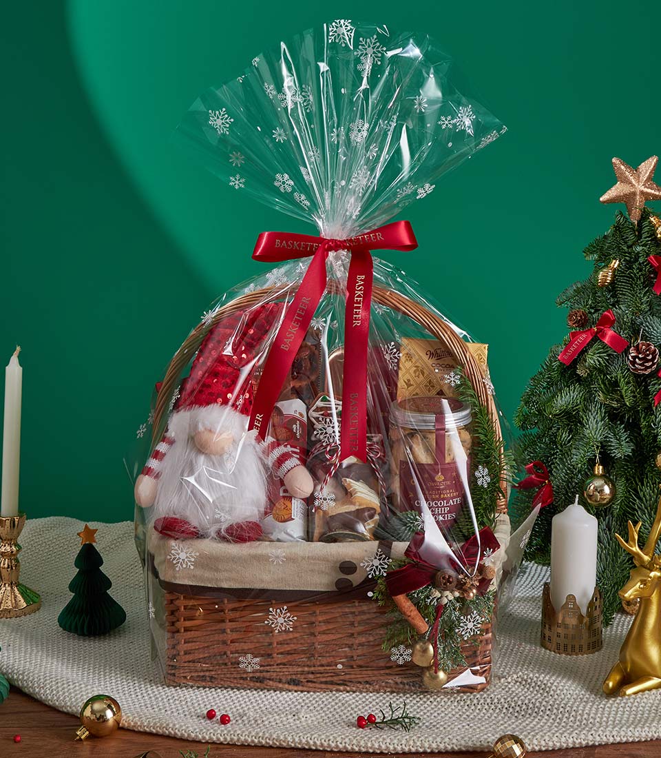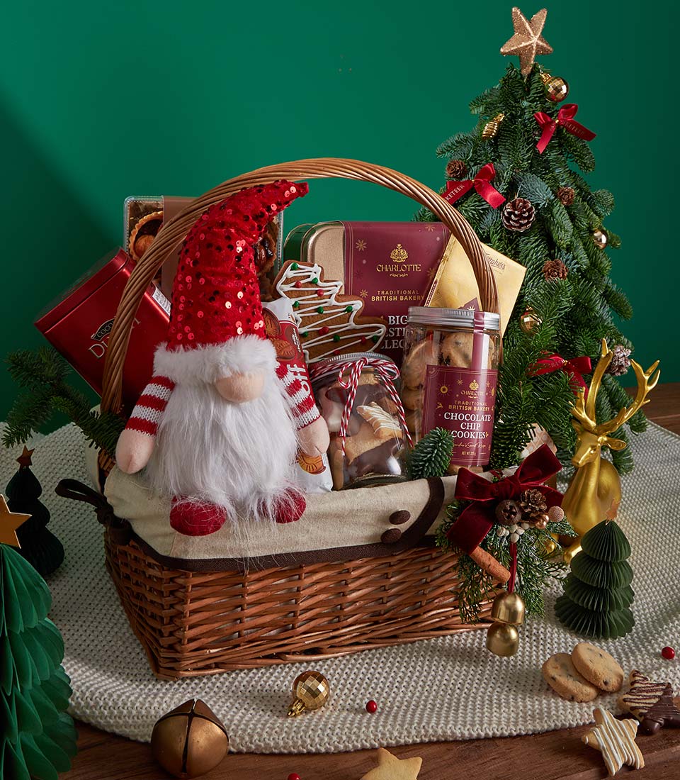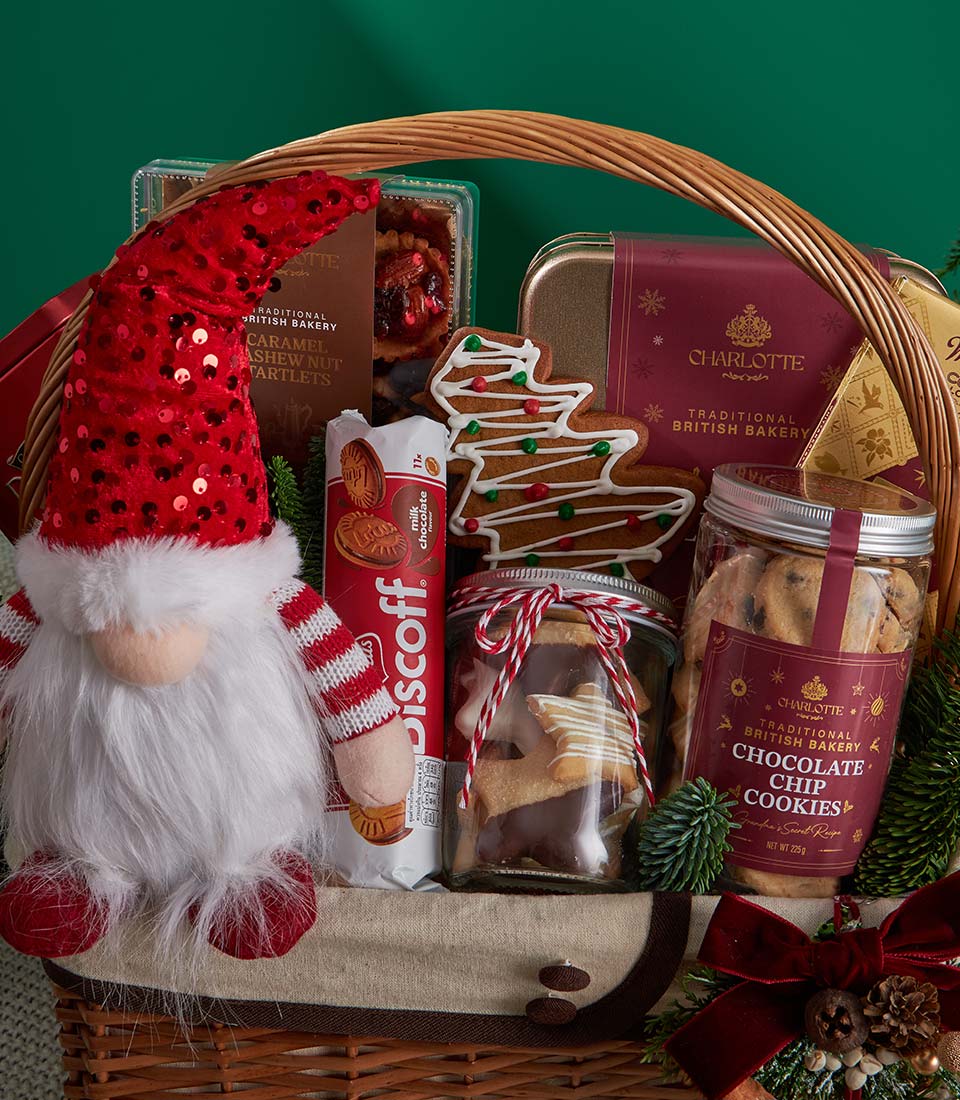 Classic Christmas Cookie & Chocolate Hamper Festive Gnome Edition A charming Christmas gift basket filled with premium cookies, rich chocolates, and indulgent cocoa treats, beautifully accented with a festive gnome doll and traditional holiday décor. Thoughtfully arranged in a classic wicker basket with warm red tones, this hamper delivers cosy Christmas joy and timeless seasonal eleganceperfect for heartfelt festive gifting.