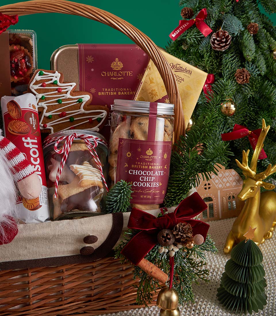 A festive Christmas gift basket featuring assorted gourmet cookies, rich cocoa powder, premium dark chocolate, and indulgent nut tarts, beautifully styled with a charming Christmas doll and classic holiday décor. A joyful Christmas gift with same-day delivery in Bangkok.