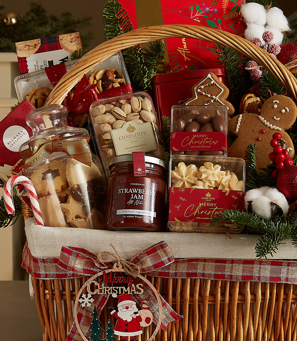 Festive Gourmet Delight Basket Celebrate the holidays with our Festive Gourmet Delight Basket, overflowing with premium treats. This luxurious gift includes a mix of indulgent cookies, strawberry jam, roasted nuts, milk chocolates, a gingerbread cookie, festive decorations, and more, all elegantly arranged in a holiday-themed wicker basket. A thoughtful gift to spread joy and cheer this holiday season.